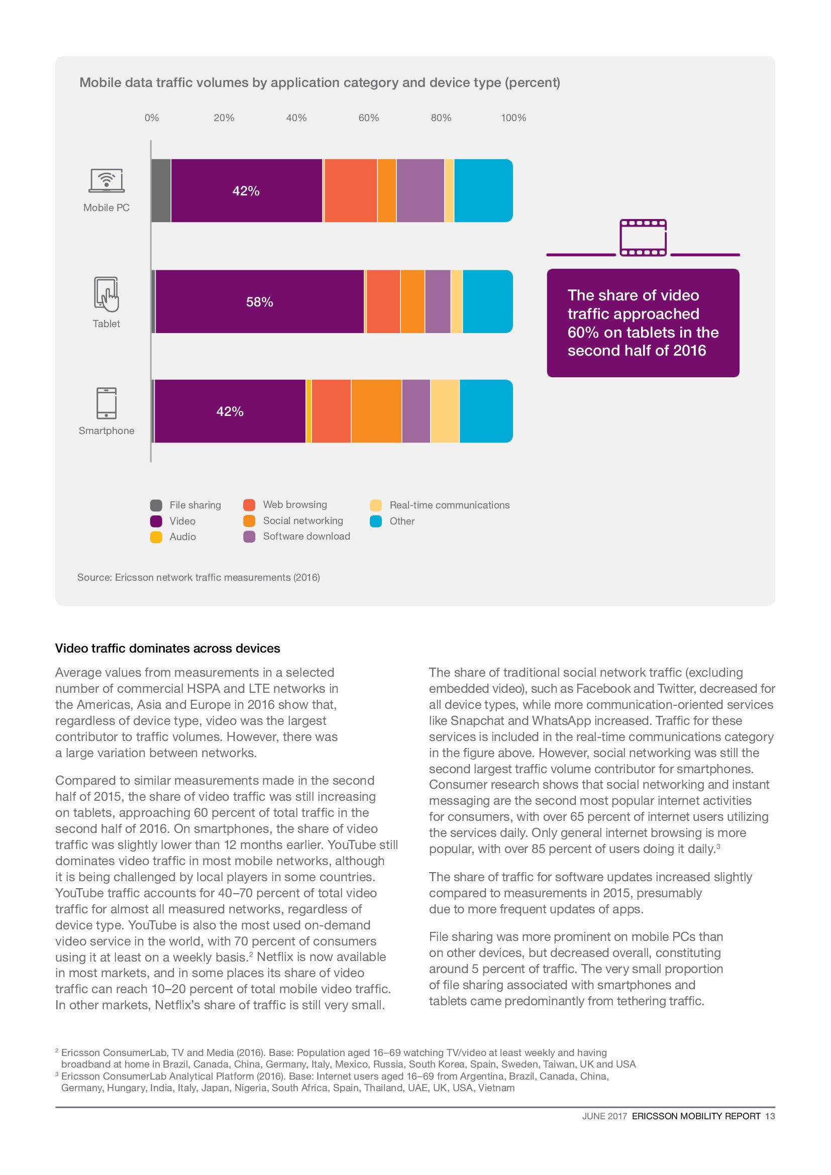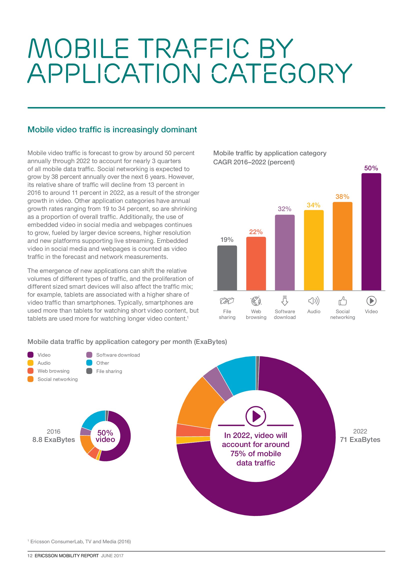 视频贡献了一半的移动数据流量,其次是社交网络和音频。这一点在平板电脑上体现的更明显,部分原因是屏幕更大。
