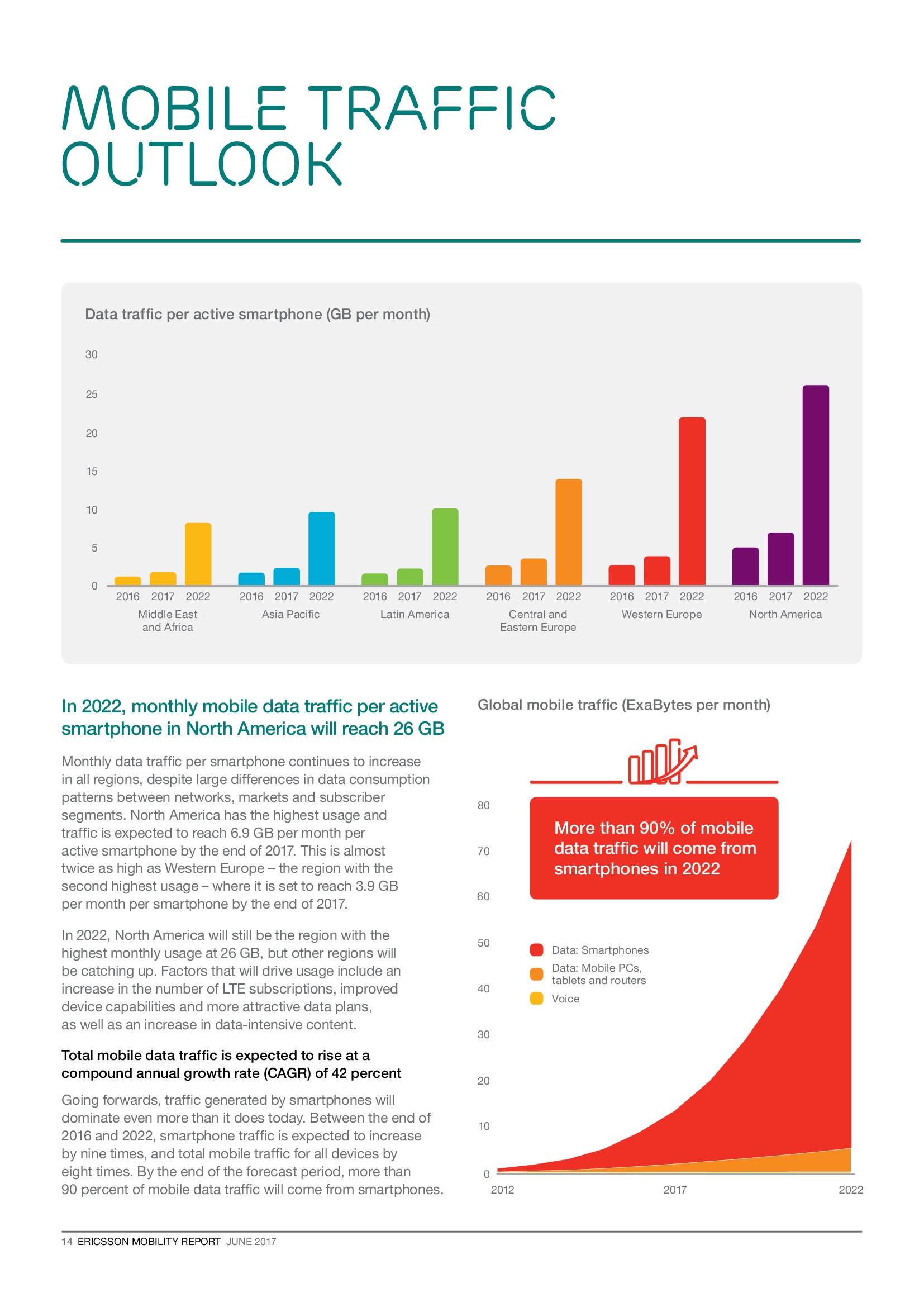 预计到2022年,在北美,平均每部活跃智能手机每月将使用26GB移动数据流量。
