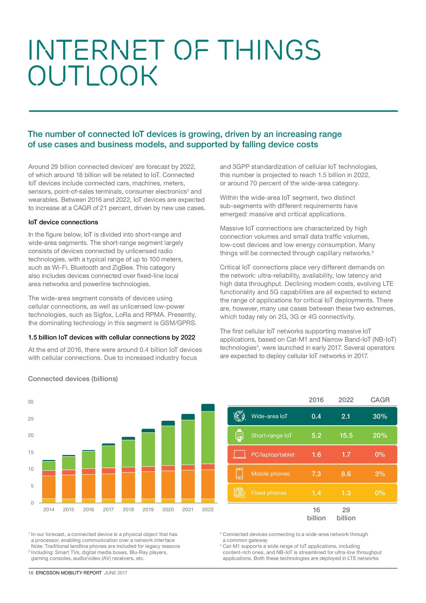 另一方面,物联网设备数量增长也将推动移动流量消费。到2022年,全球具备蜂窝数据功能的物联网设备将达到15亿台。