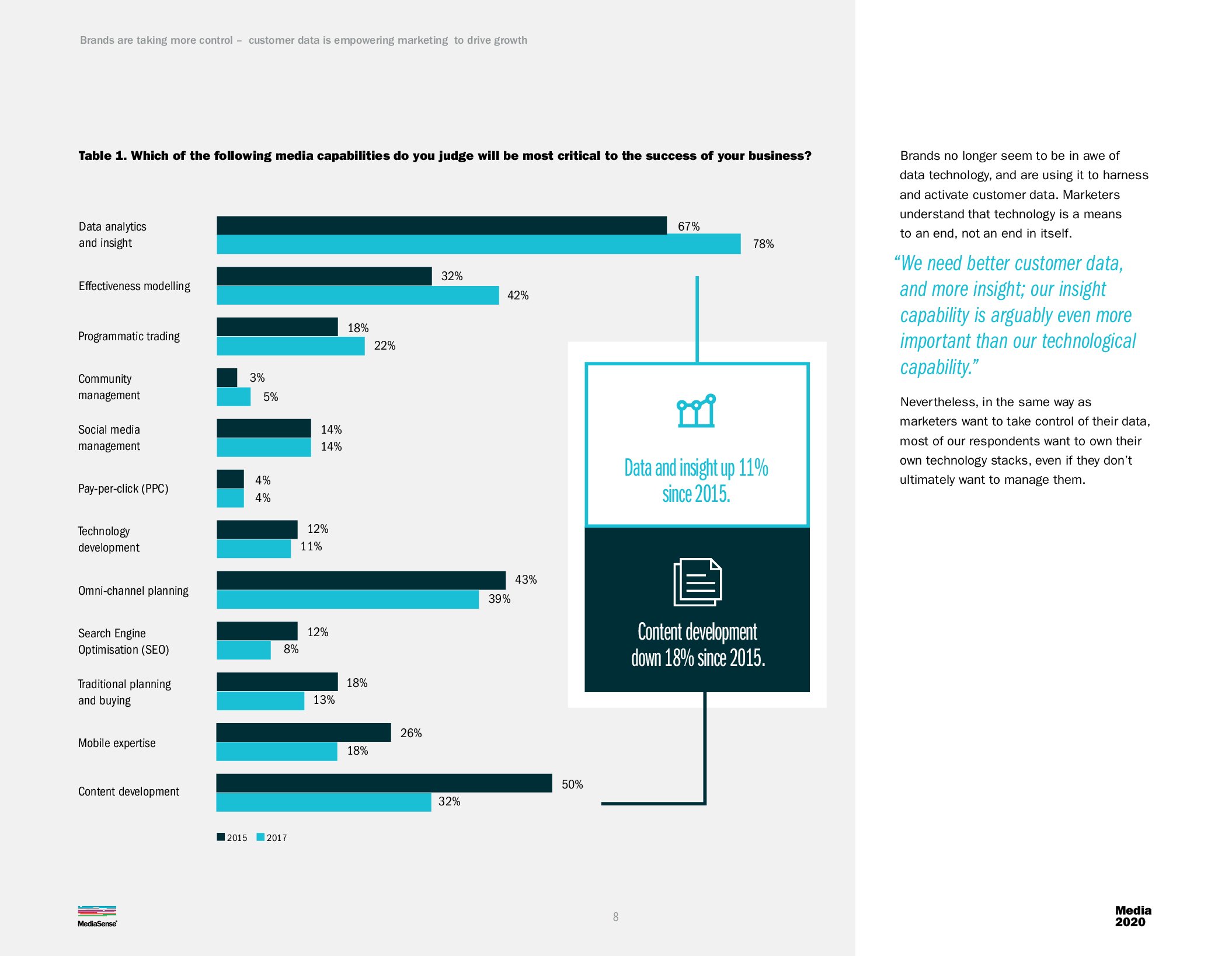 - 品牌正在根据数据能力需求建设营销团队,同时看到了效果。78%的受访者承认数据分析和数据洞察是至关重要的营销能力。