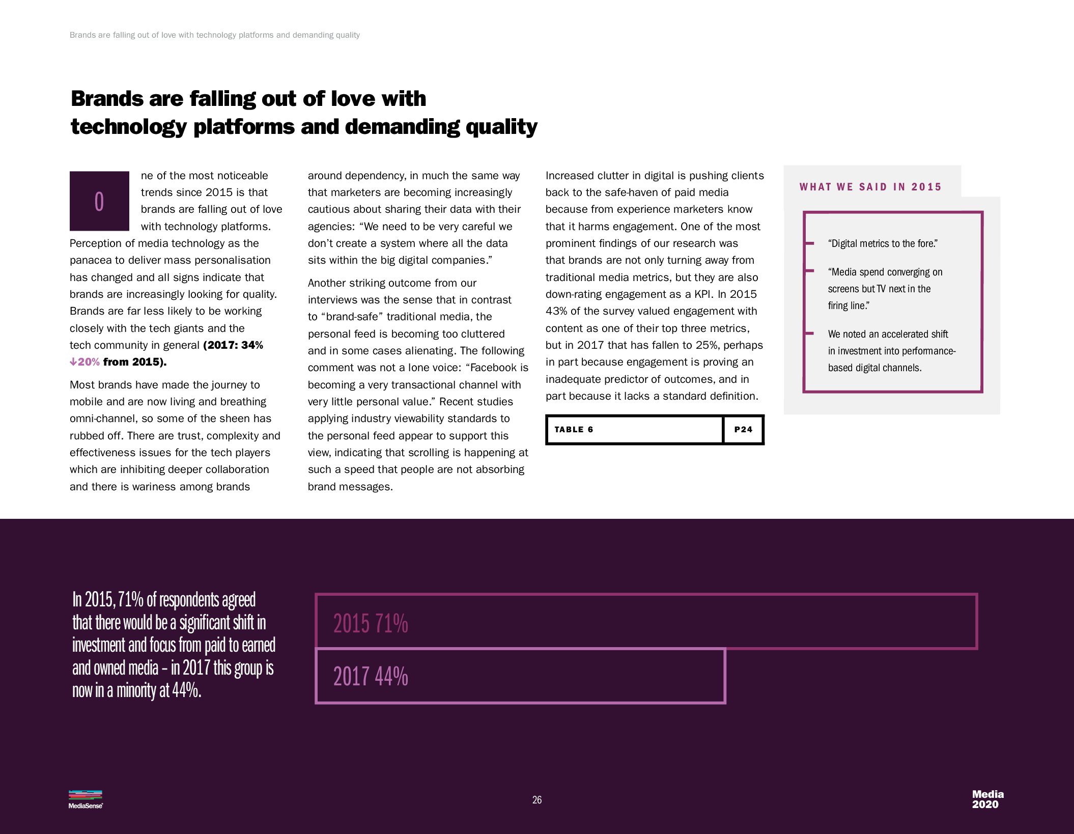 - 品牌与技术平台之间有分歧。从付费平台转向自媒体的营销人员比例从2015年的71%下降至44%。营销人员显然对科技平台缺少信任。