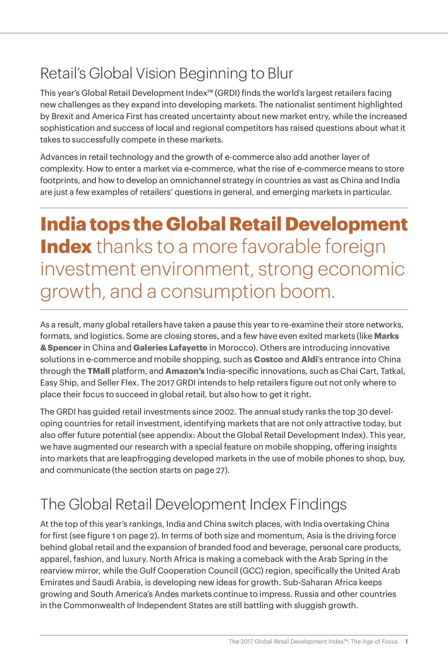 根据A.T. Kearney新报告“2017年全球零售业发展指数(GRDI)”,今年,印度将超越中国,成为零售投资方面最有吸引力的发展中国家。