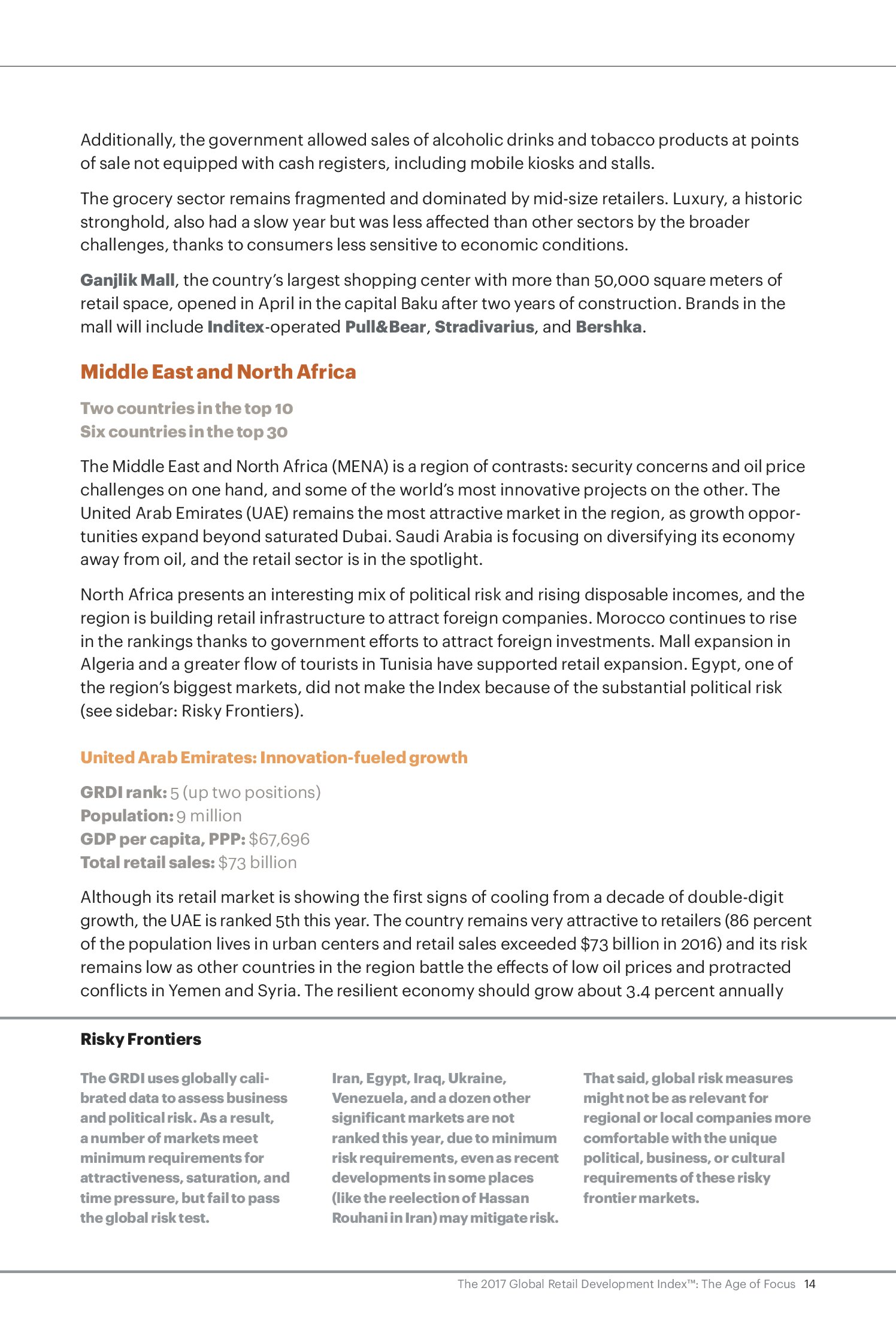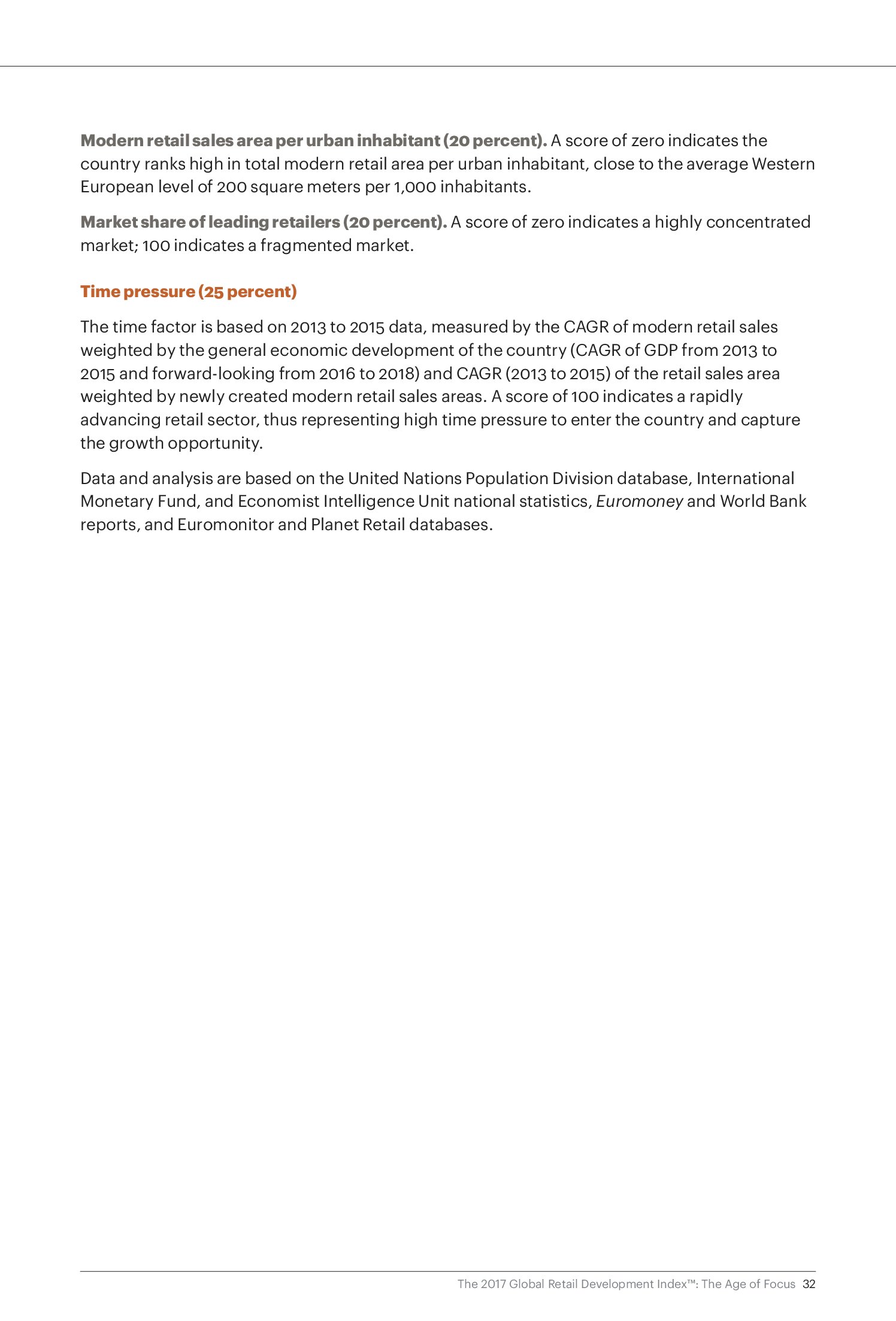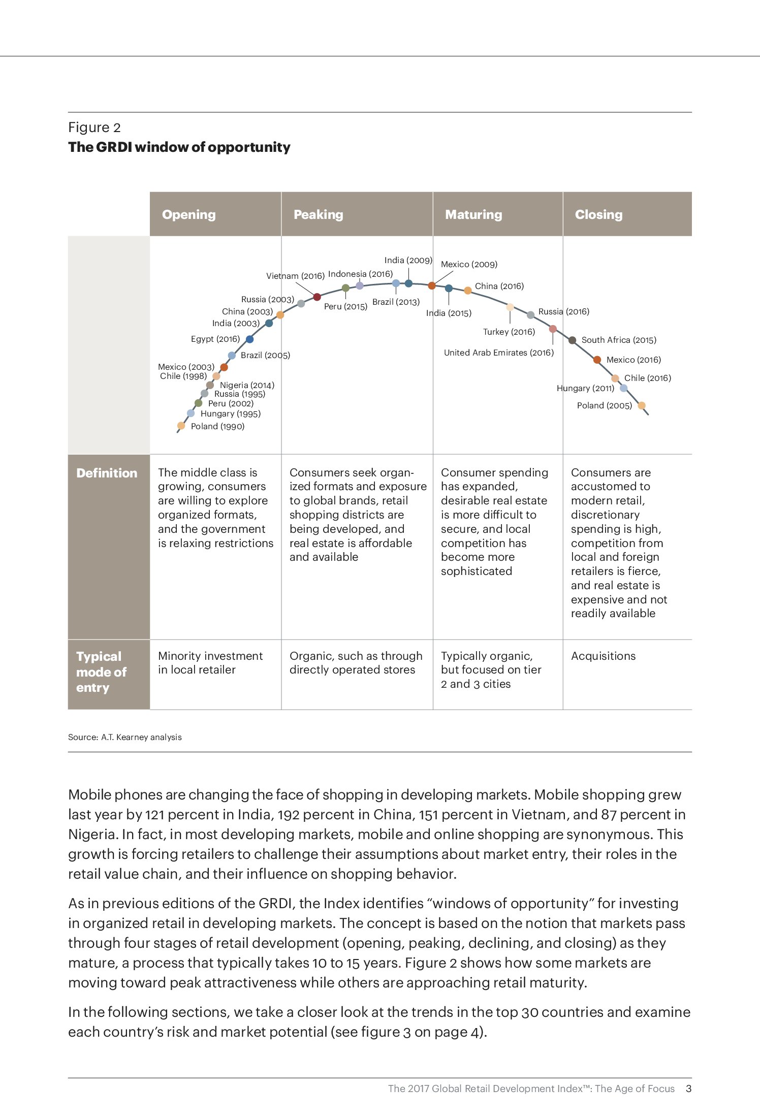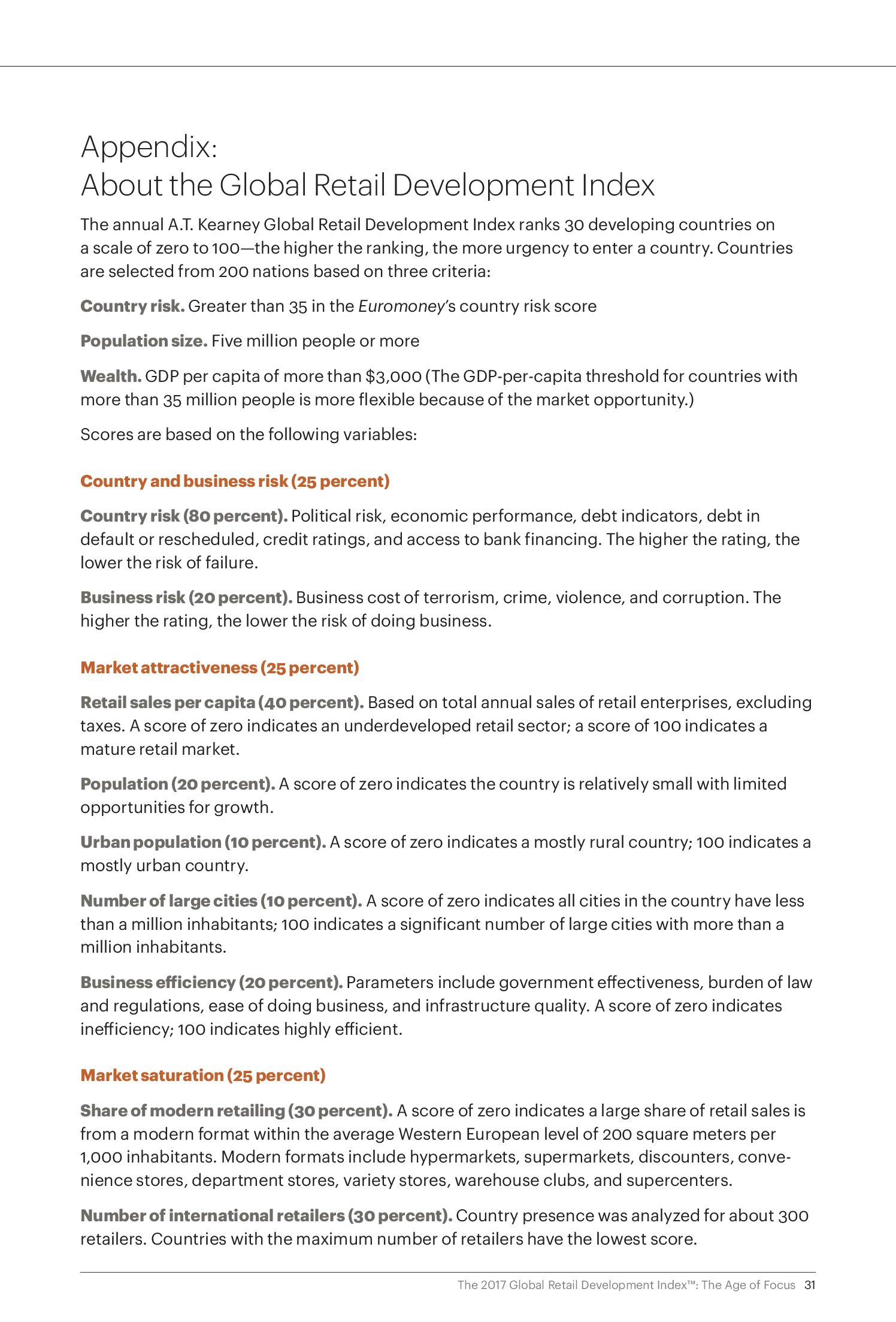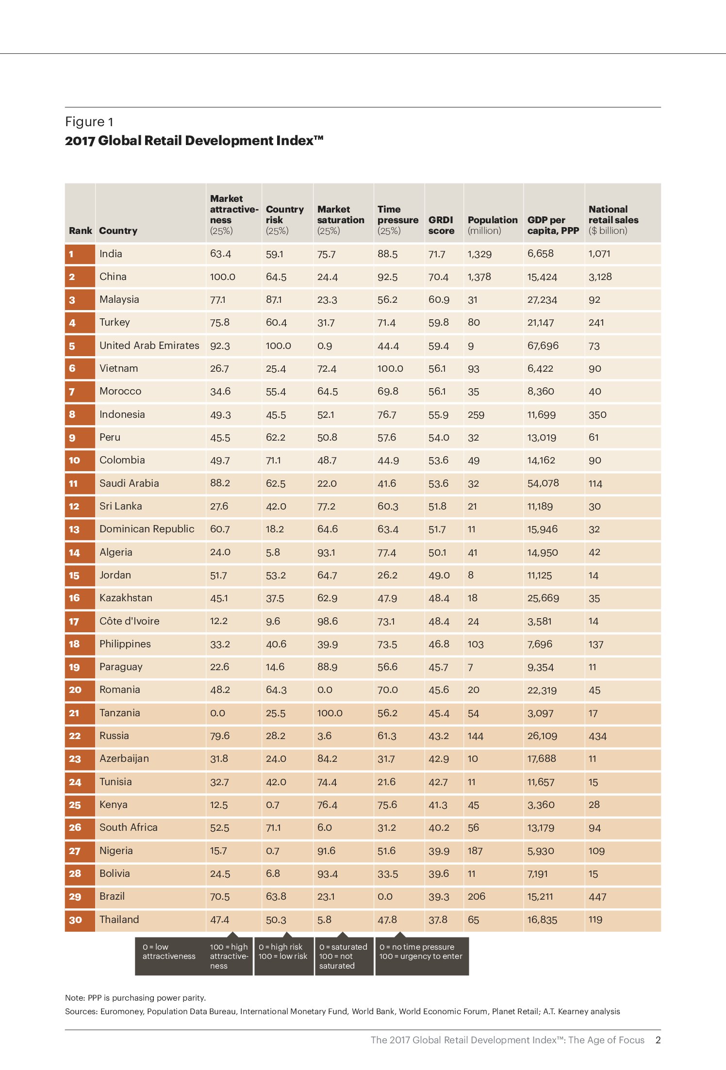 A.T. Kearney的零售业发展指数采用100分制,主要评估四个方面:市场吸引力、国家风险、市场饱和度和时间压力(零售增长速度有多快)。