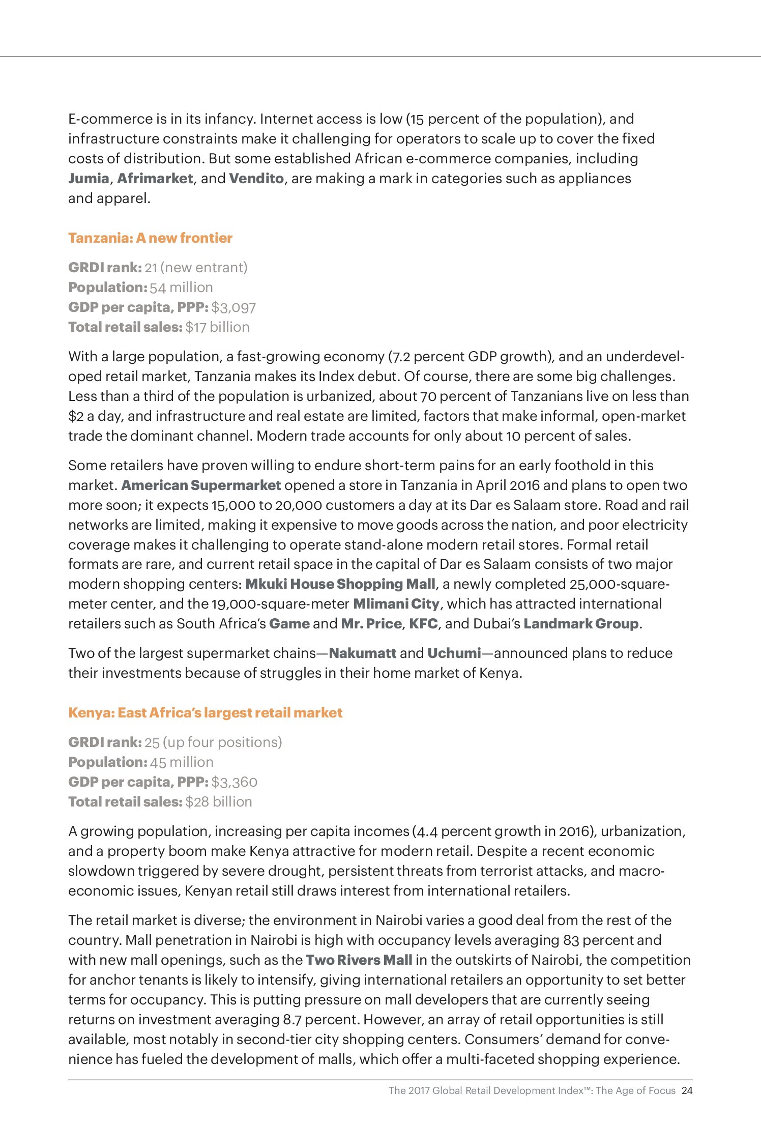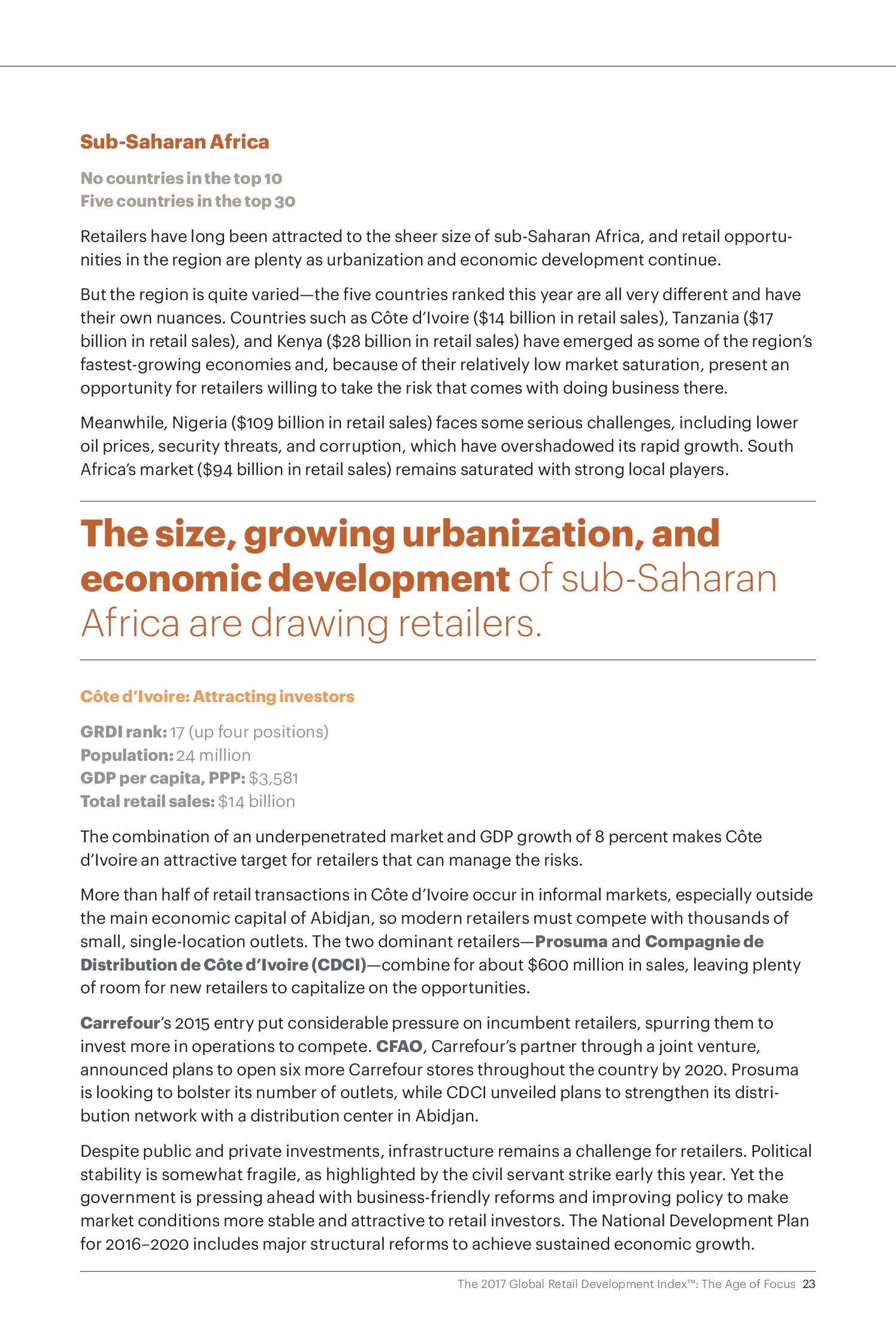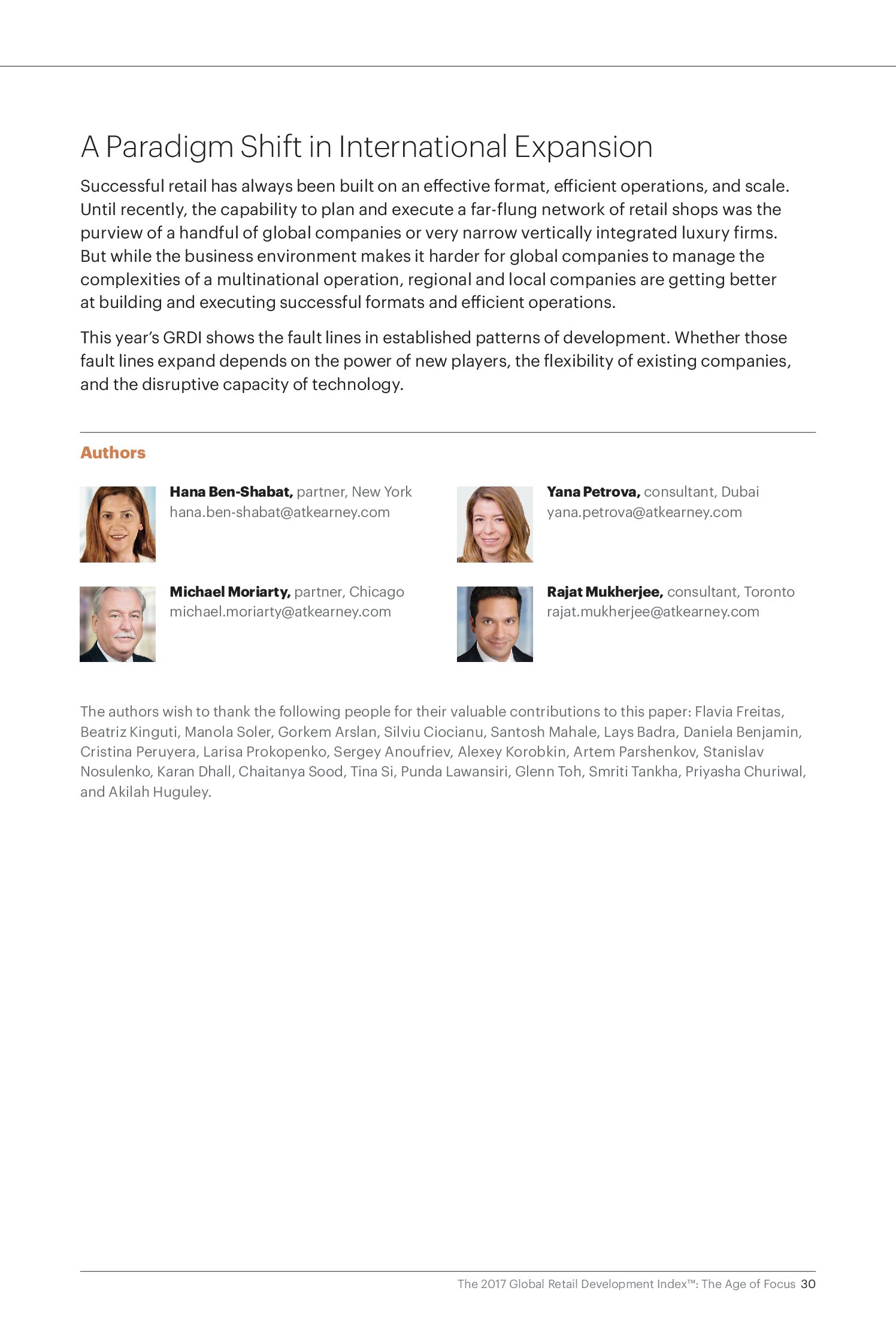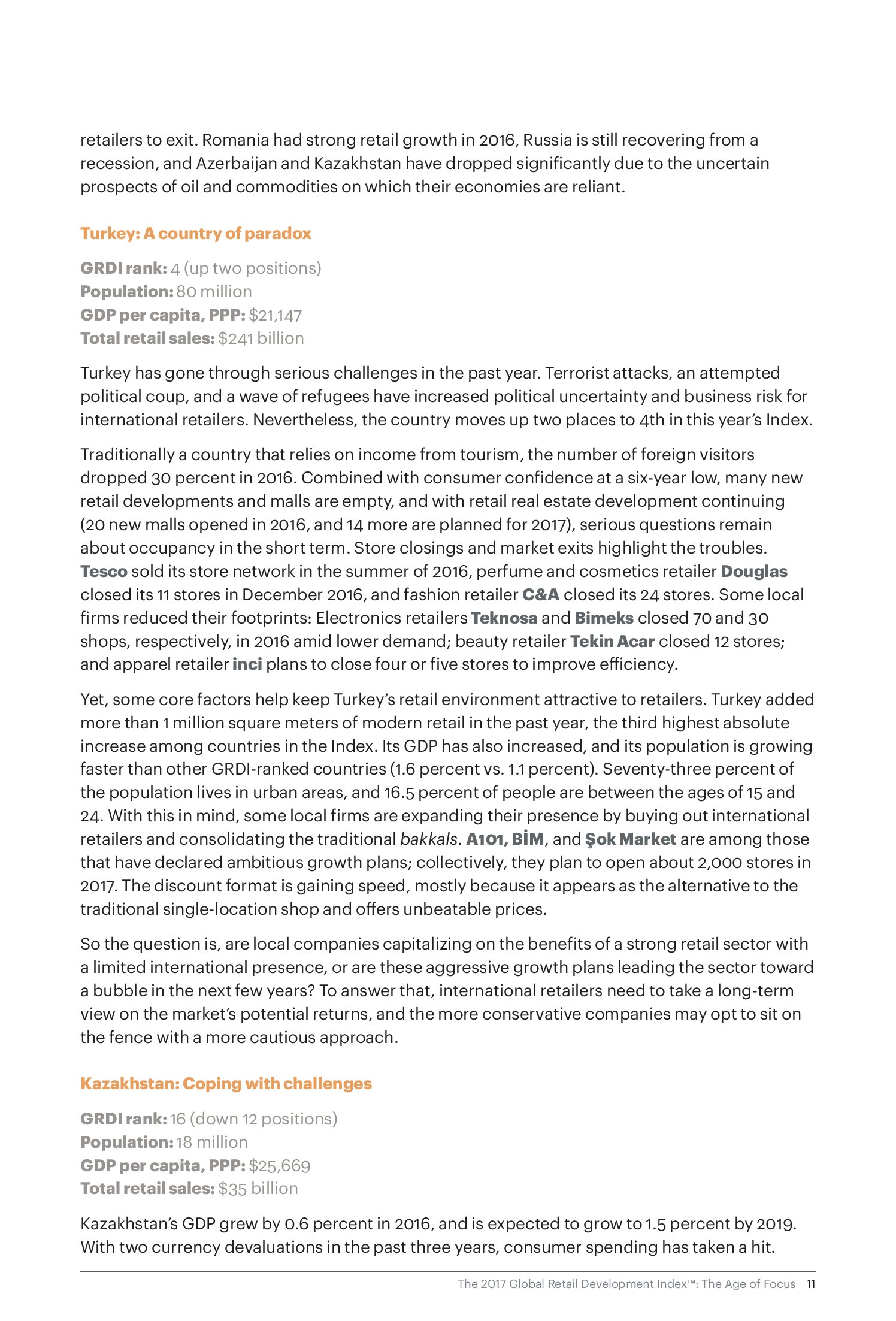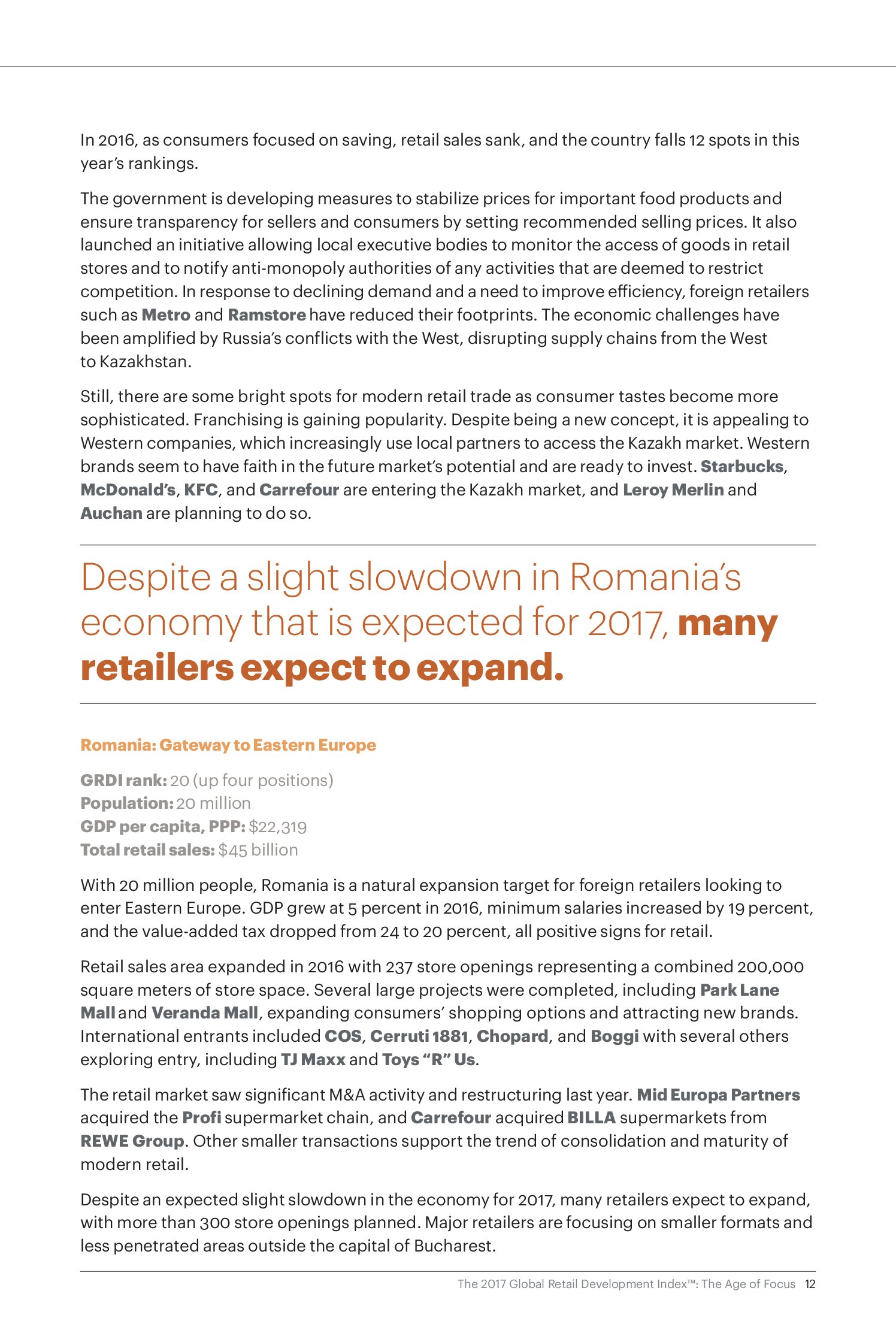 A.T. Kearney的零售业发展指数采用100分制,主要评估四个方面:市场吸引力、国家风险、市场饱和度和时间压力(零售增长速度有多快)。