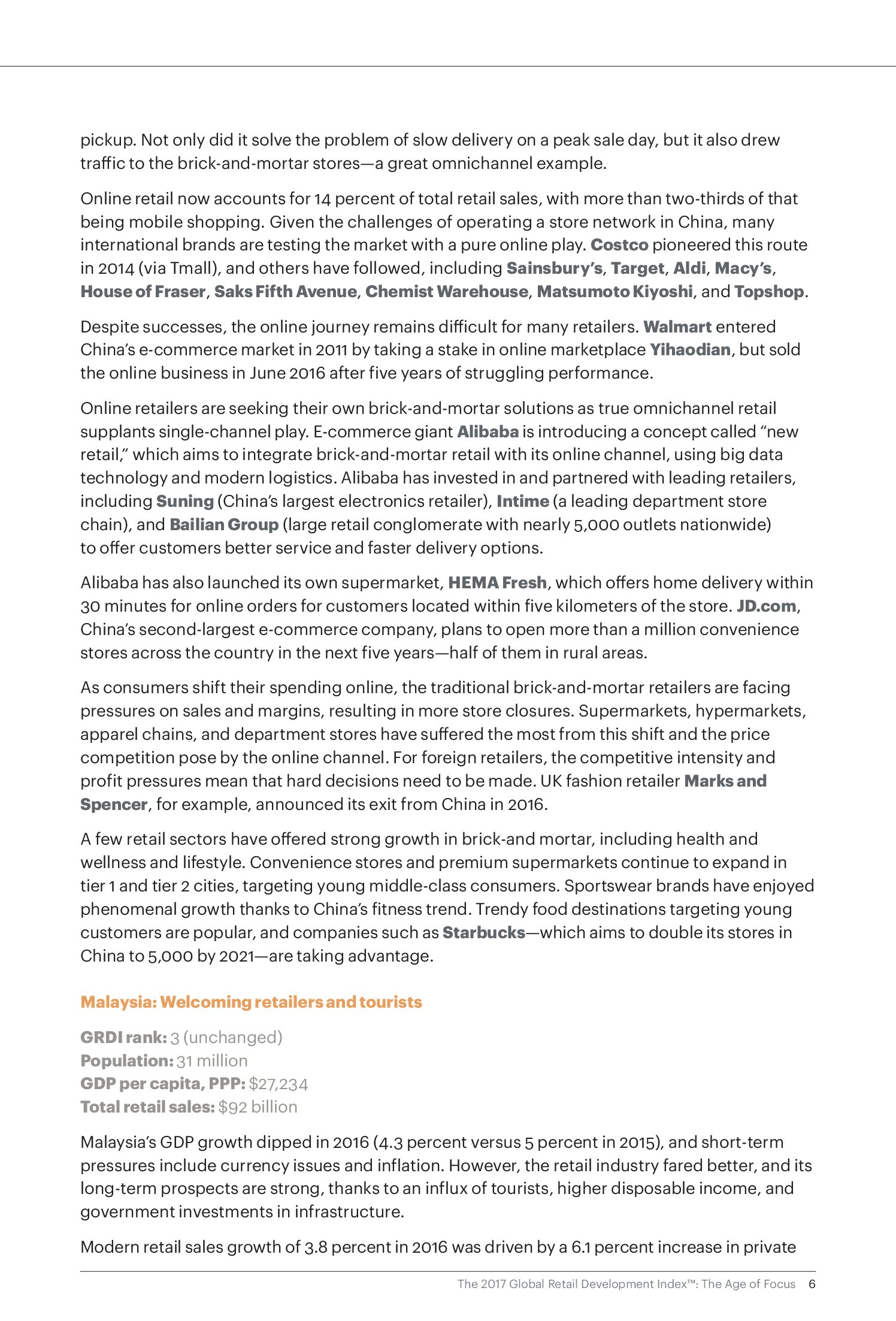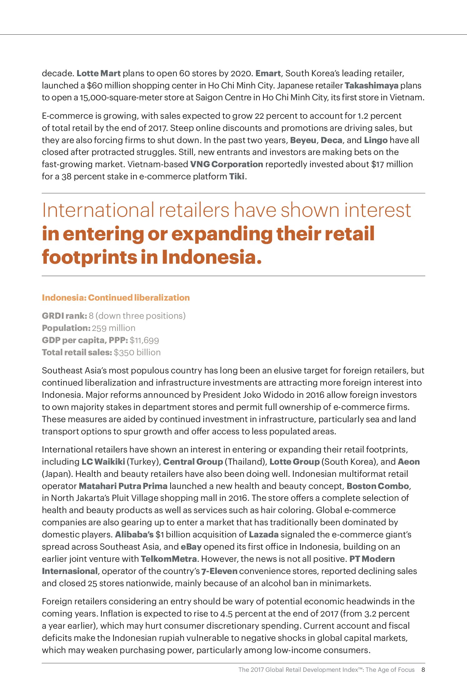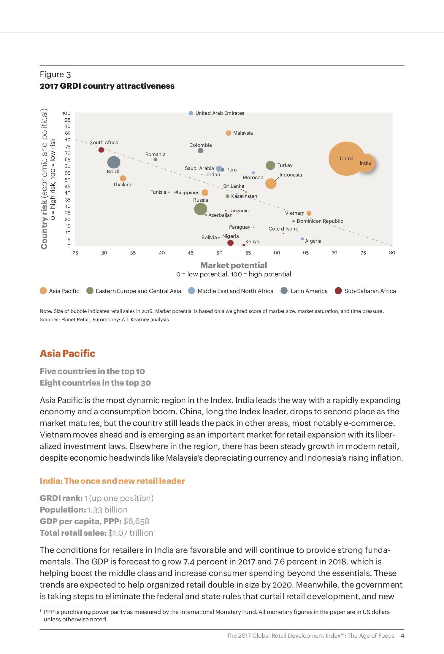 数据显示,亚太地区已经成为商业发展的温床。GRDI排名前十位的国家中,有一半在亚太地区,包括印度、中国、马来西亚、越南和印度尼西亚。特别是中国和印度,拥有庞大的人口,零售总额达数万亿,经济和政治风险相对较低,加上市场潜力巨大,促使这两个国家排名最高。