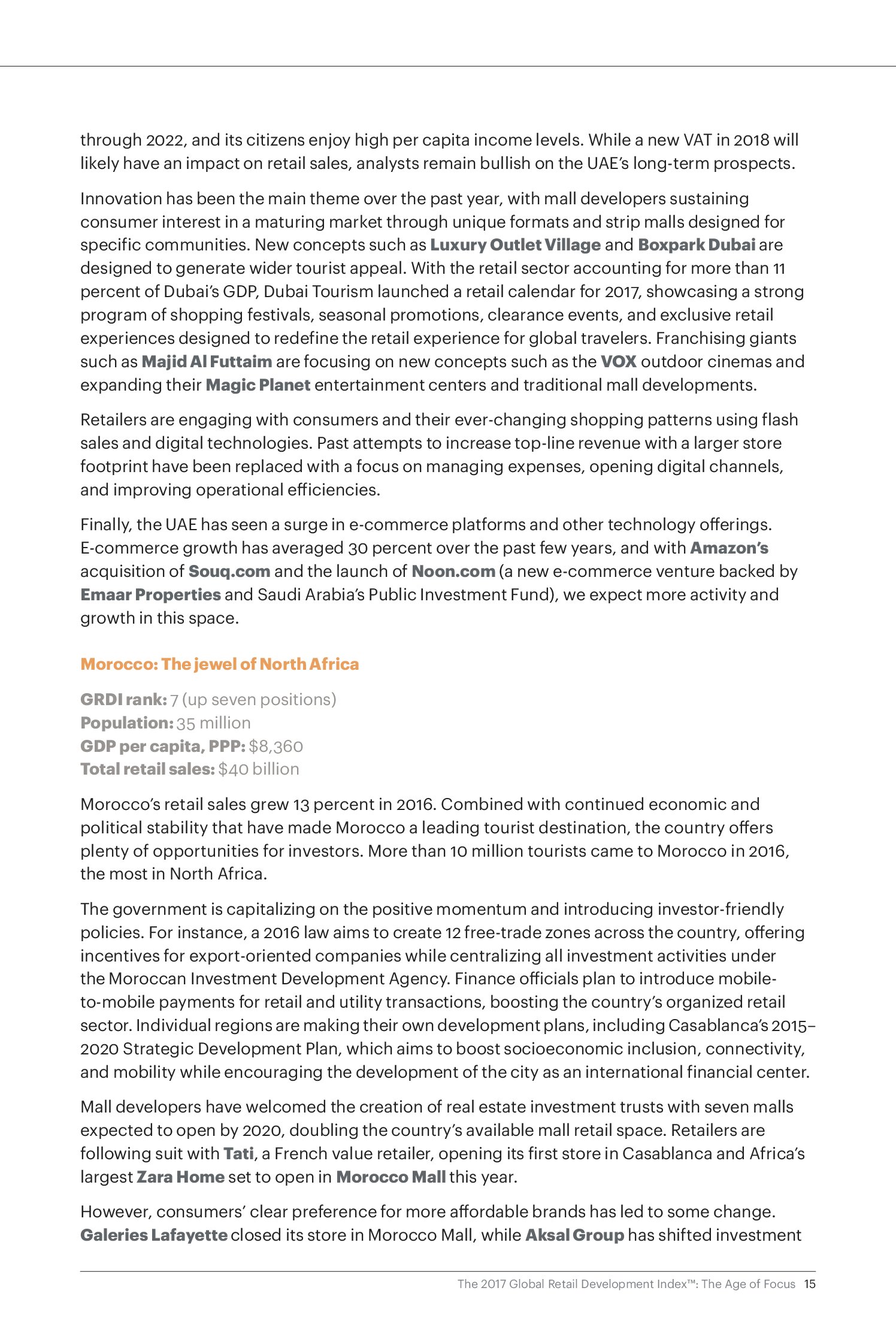 马来西亚GRDI为60.9分,主要得益于国家风险(87.1分)的分数相对较强,推动其成为排名第三的发展中国家。其次是土耳其(GRDI为59.8分)整体成绩稳中有升。阿拉伯联合酋长国(GRDI为59.4)排在第五位,在国家风险上获得了100分,市场吸引力达到了92.3,但是,市场高度饱度仅获得0.9分。