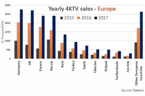 Dataxis发布数据指出,2016年欧洲共售出4K电视近1200万台,较2015年增加了102%。这些销量主要来自英国(200万),德国(200万),法国(170万),俄罗斯(140万)以及意大利(88万)。