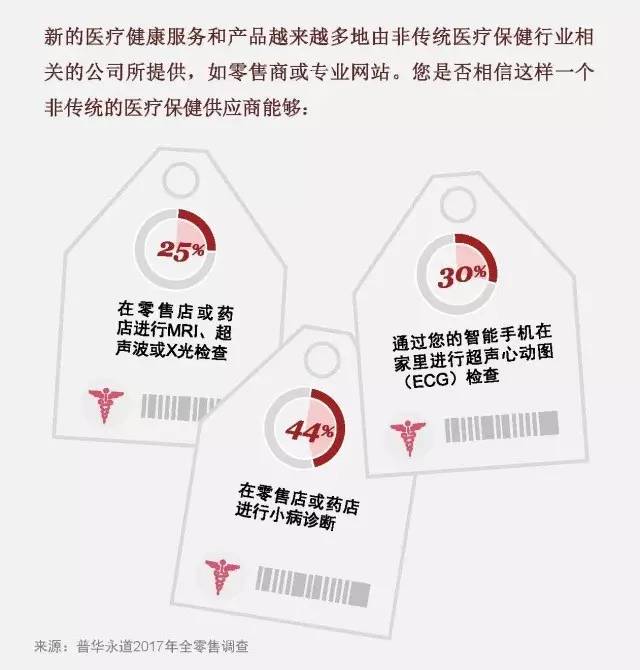 为了更好地了解零售商未来在这个领域的投资机会,在今年的调查中,我们询问了受访者关于接受各类零售商提供的医疗保健时的信任问题。下图结果显示我们的受访者已准备好接受零售商的医疗保健服务,这反映出消费者对零售医疗提供商的信任,喜欢其便利性。本页图表甚至显示我们的全球受访者中,有四分之一的人接受在零售药店进行MRI或超声波检查。