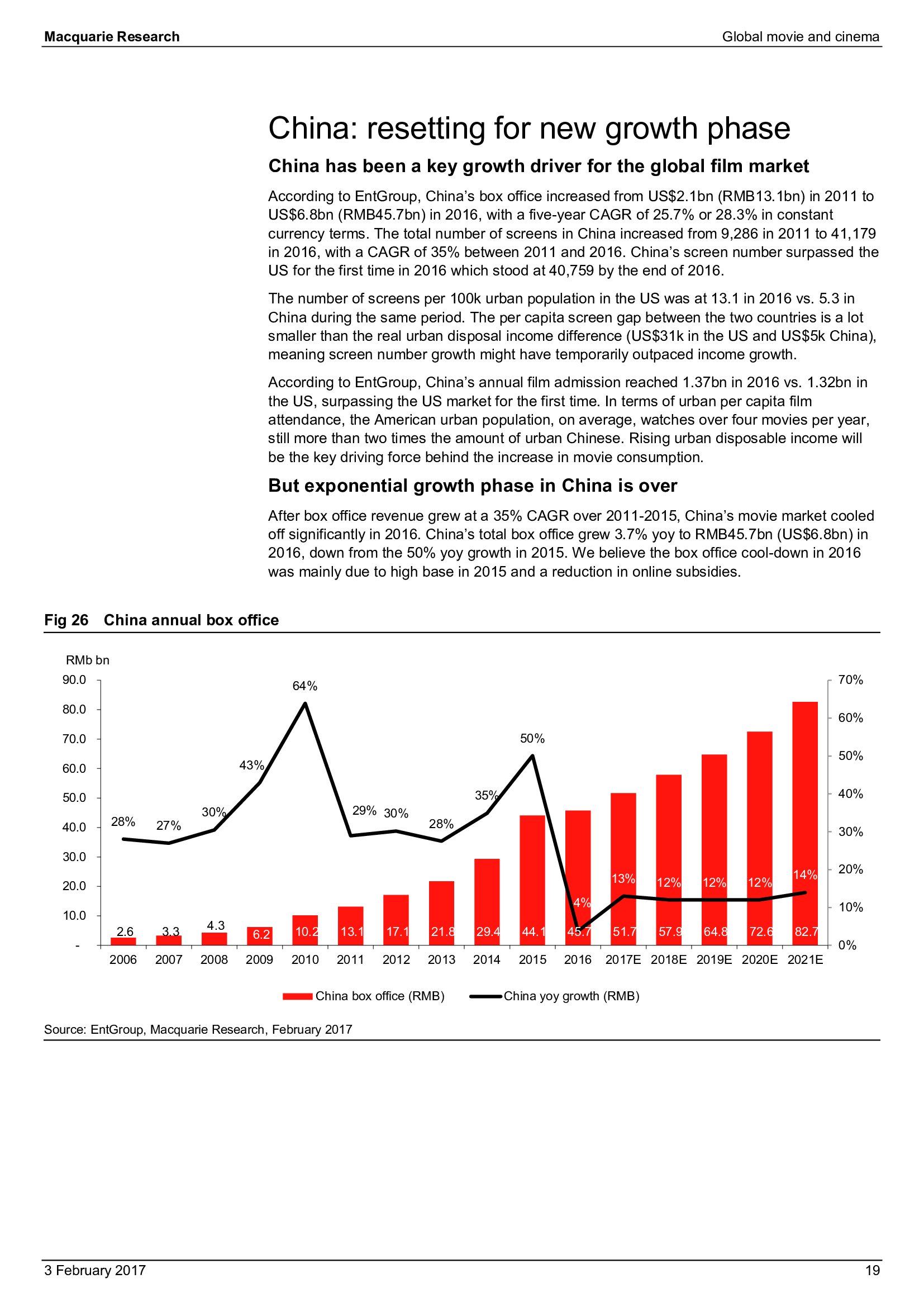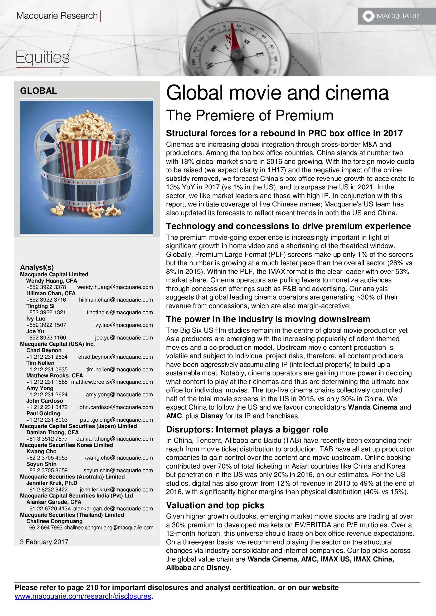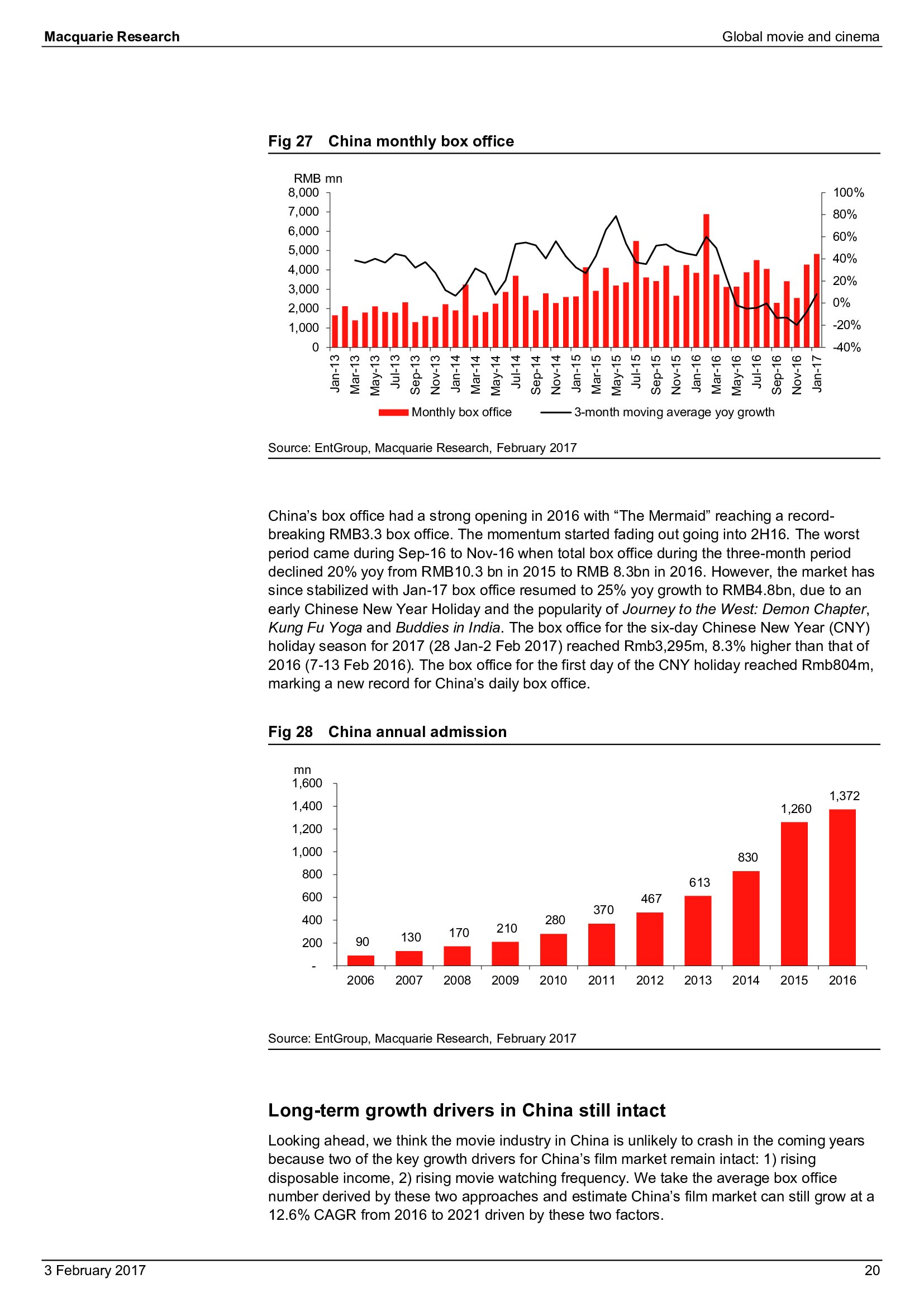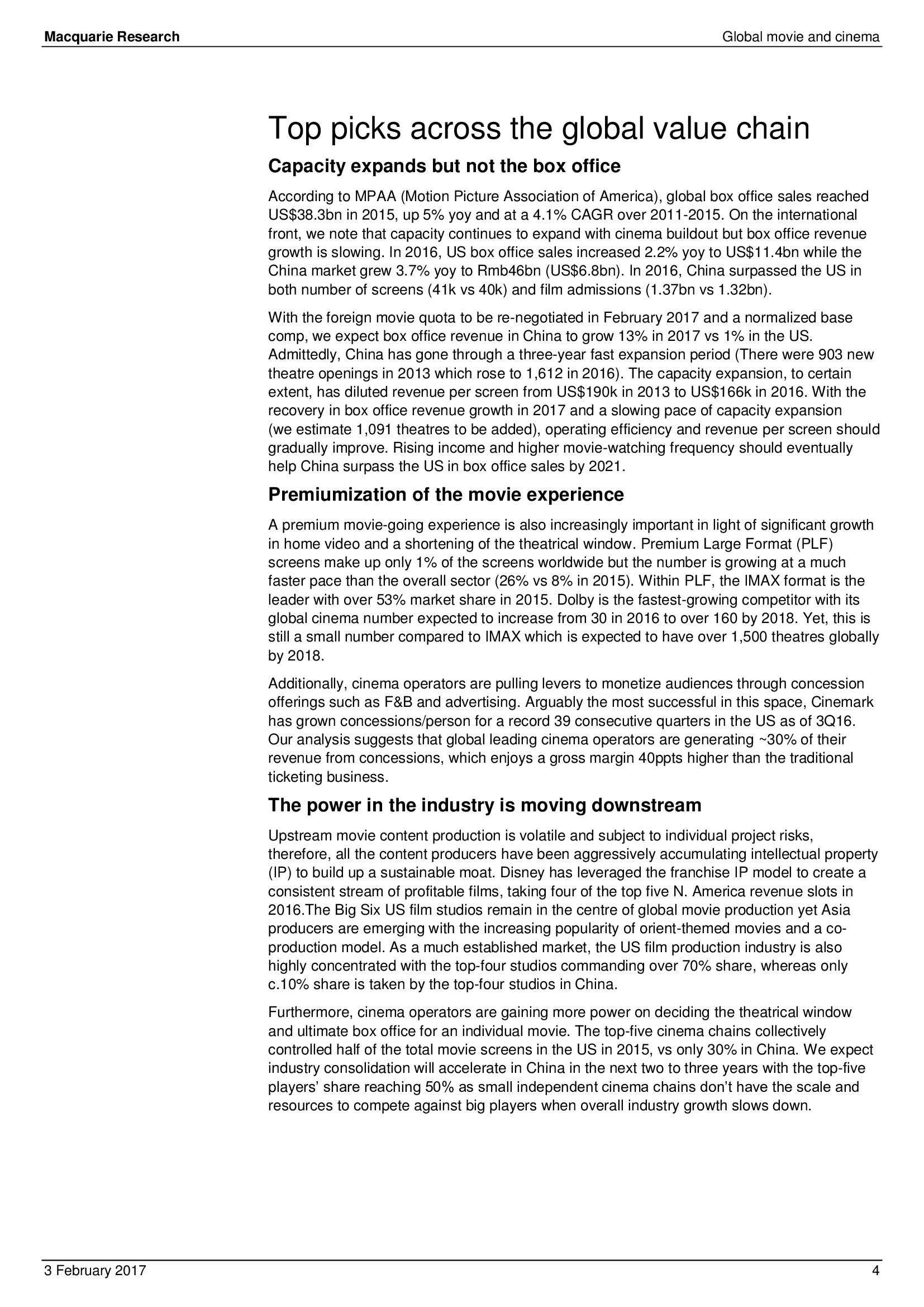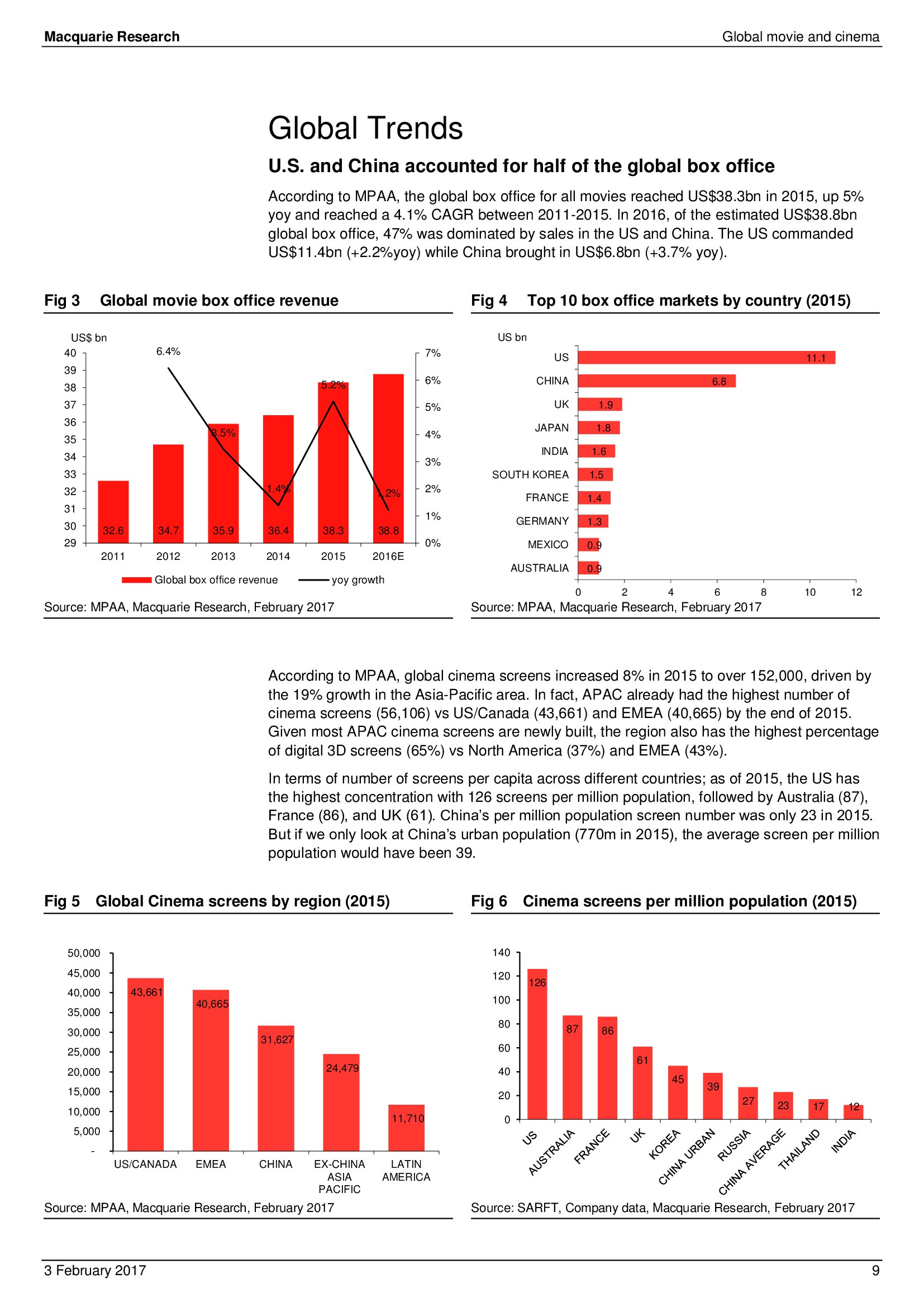 Macquarie Research发布了“2017年全球电影和影院报告”,报告分析了全球电影行业发展趋势。