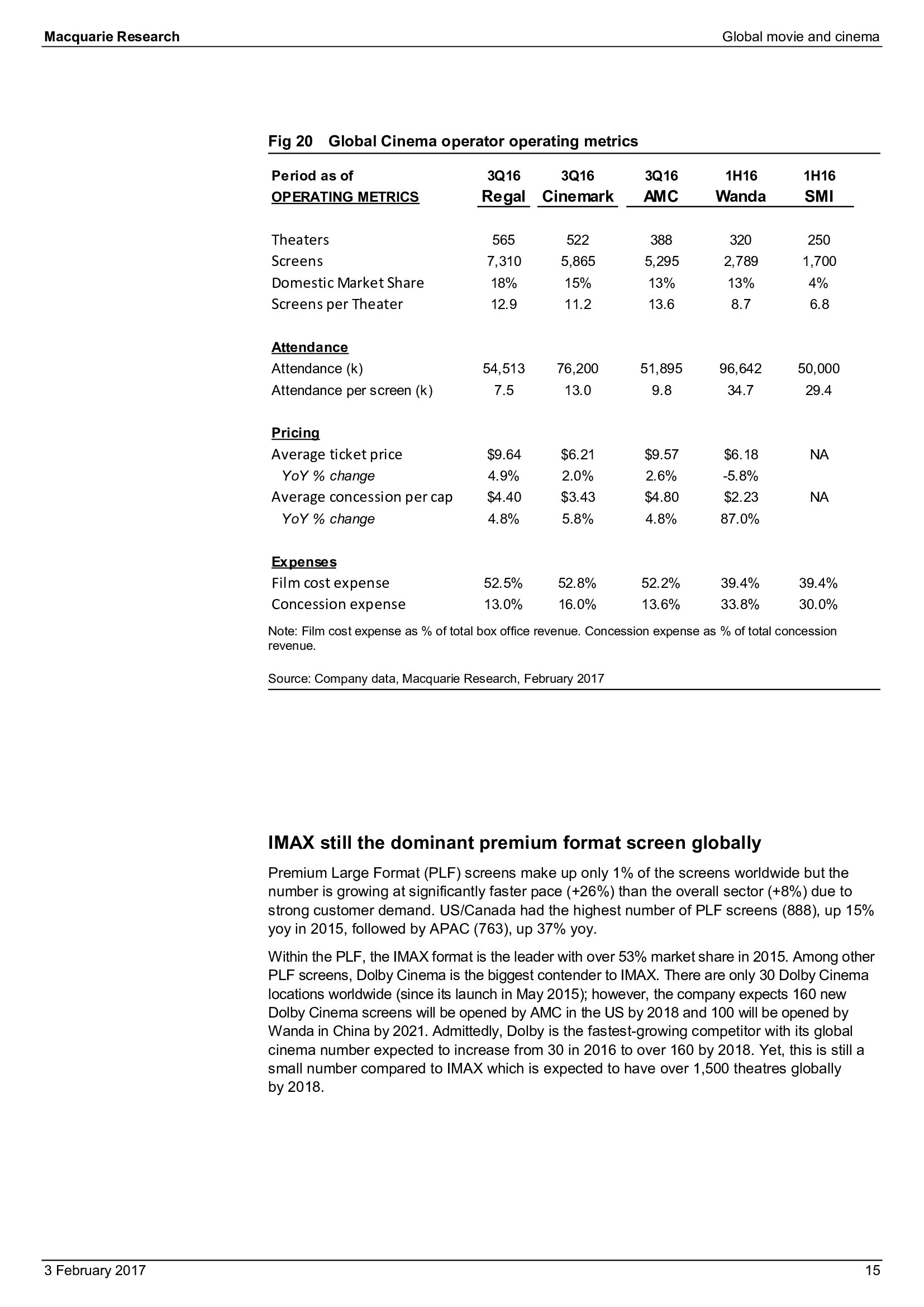 2015年,IMAX是PLF屏幕市场的主宰,份额超过53%。杜比影院是IMAX最大的竞争对手;但是全球只有30家杜比影院。