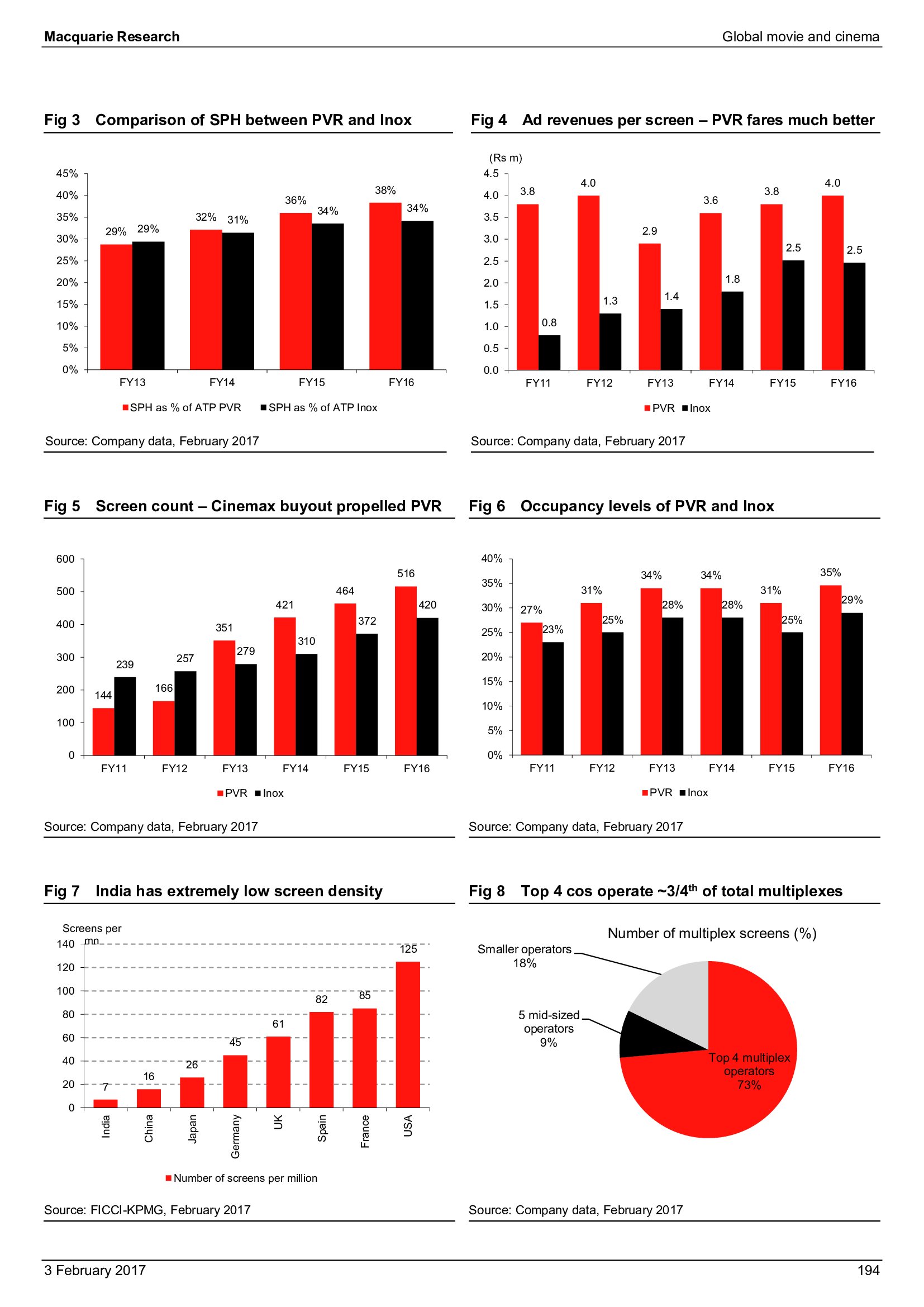 人均屏幕占有量方面,截至2015年,美国每百万人口拥有126个屏幕,密度最高。其次是澳大利亚(87)、法国(86)和英国(61)。2015年,中国百万人口屏幕人数仅为23;但是,如果只看中国的城市人口,平均每百万人口拥有39个屏幕。