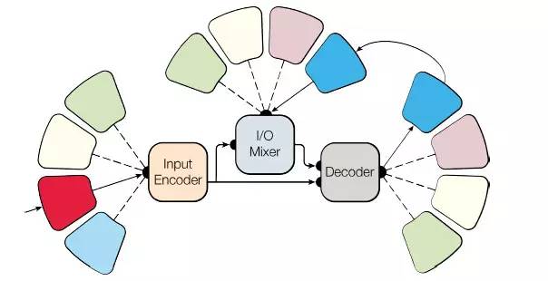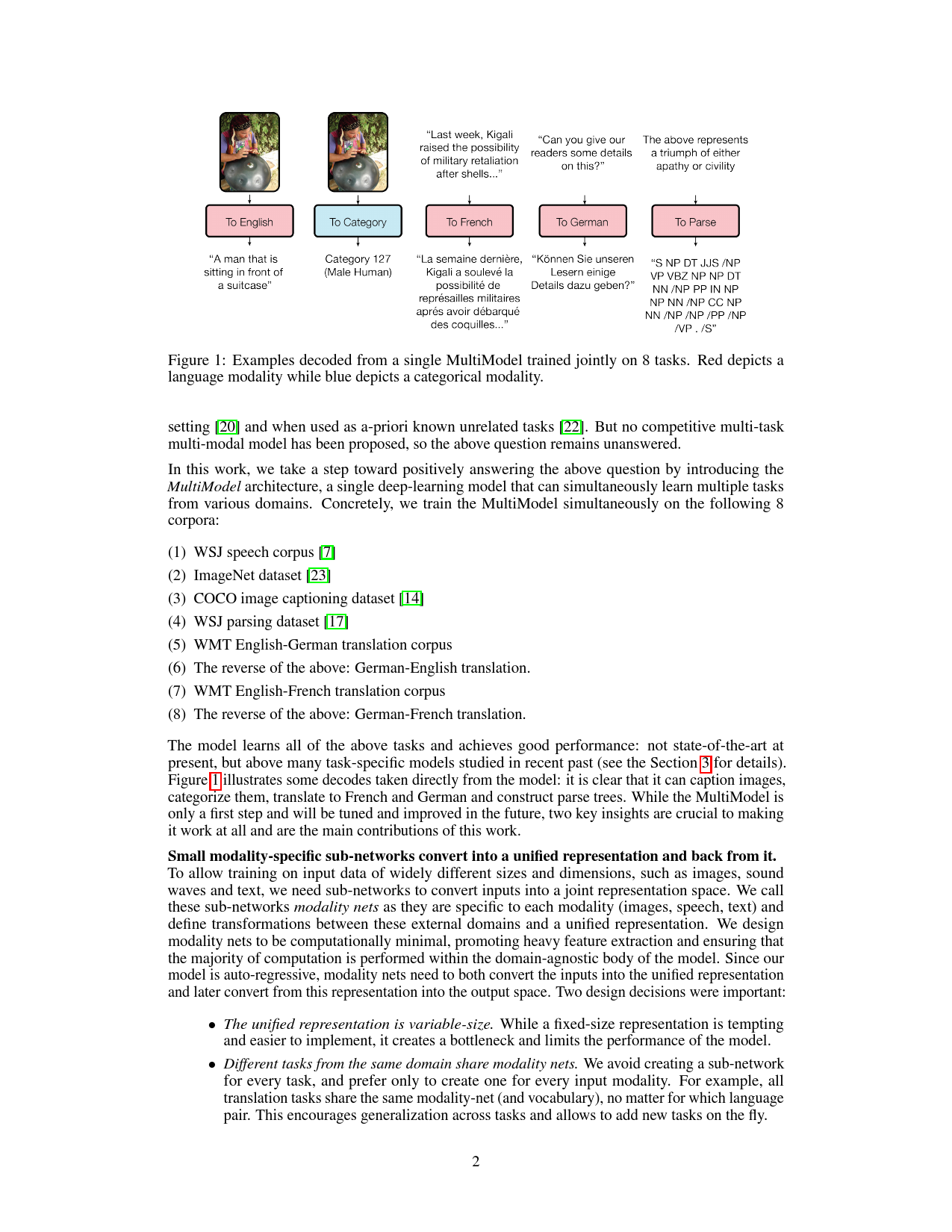图一展示单个多模型(MultiModel)的解码示例,该模型在8个任务中进行了联合训练。其中红色的矩形框描绘了一种语言模式,而蓝色的矩形框描绘了分类模式。