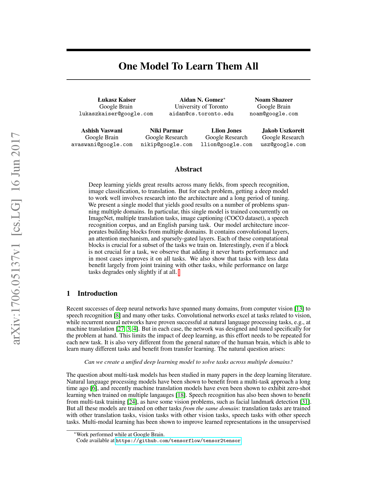 本篇论文是谷歌大脑(Google Brain)与多伦多大学合作的最新论文。谷歌大脑团队曾经负责研发了AlphaGo与TensorFlow框架等产品,其实力自然不消多说。而这一次谷歌大脑团队更是向当前深度学习架构繁多、应用领域不一等混乱现状发出挑战,霸气提出了通过单一模型联合学习多项任务。那么该模型是否真的如此神奇呢?赶紧随雷锋网AI科技评论来看看吧。