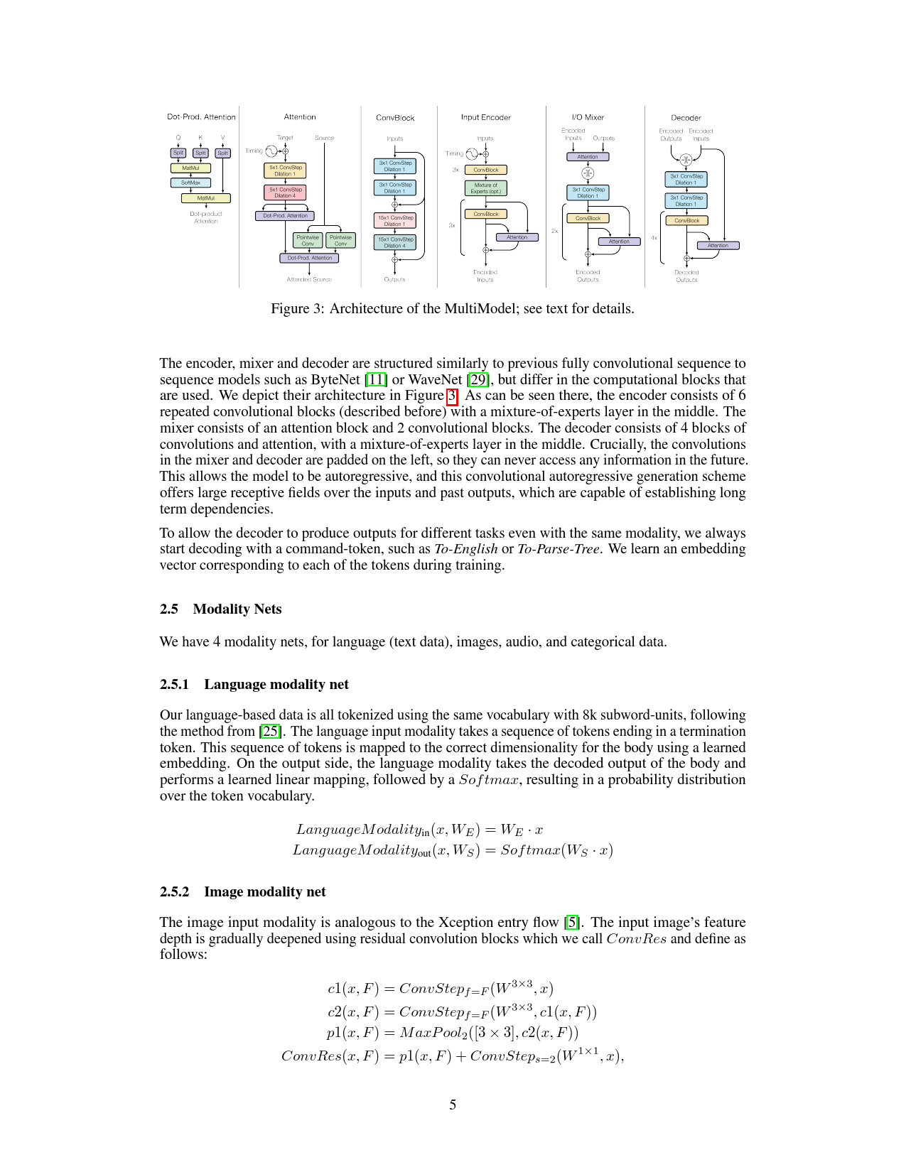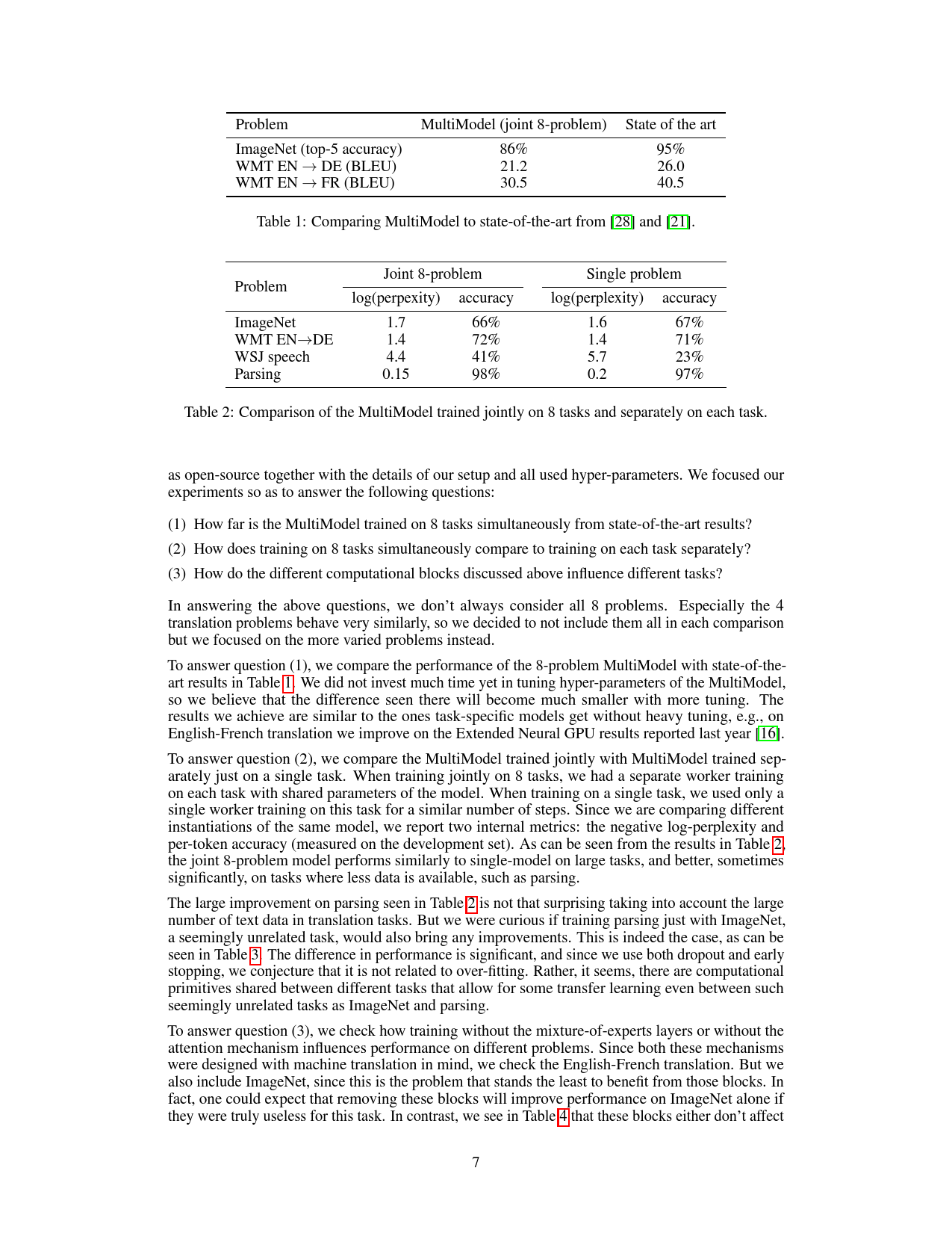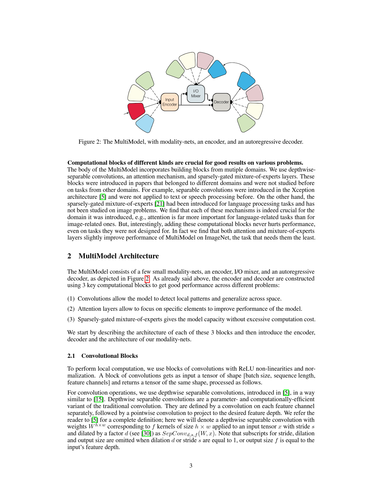 本论文的研究员提出了一种单一模型,该模型能够在多个领域的不同问题中都取得较好的结果。另外值得一提的是,该单一模型可以在ImageNet、多项翻译任务、图像标注(Image captioning,采用COCO数据集)、语音识别数据集和英语解析任务中同时进行训练。据悉,该单一模型架构借鉴了来自多个领域的深度学习模型架构所使用的构建块(Building blocks),该模型具有卷积层(Convolutional layers)、注意力机制(Attention mechanism)和稀疏门控层(Sparsely-gated layers)。并且模型中的每一个计算块(Computational blocks)对于训练任务中的某一子部分都至关重要。
