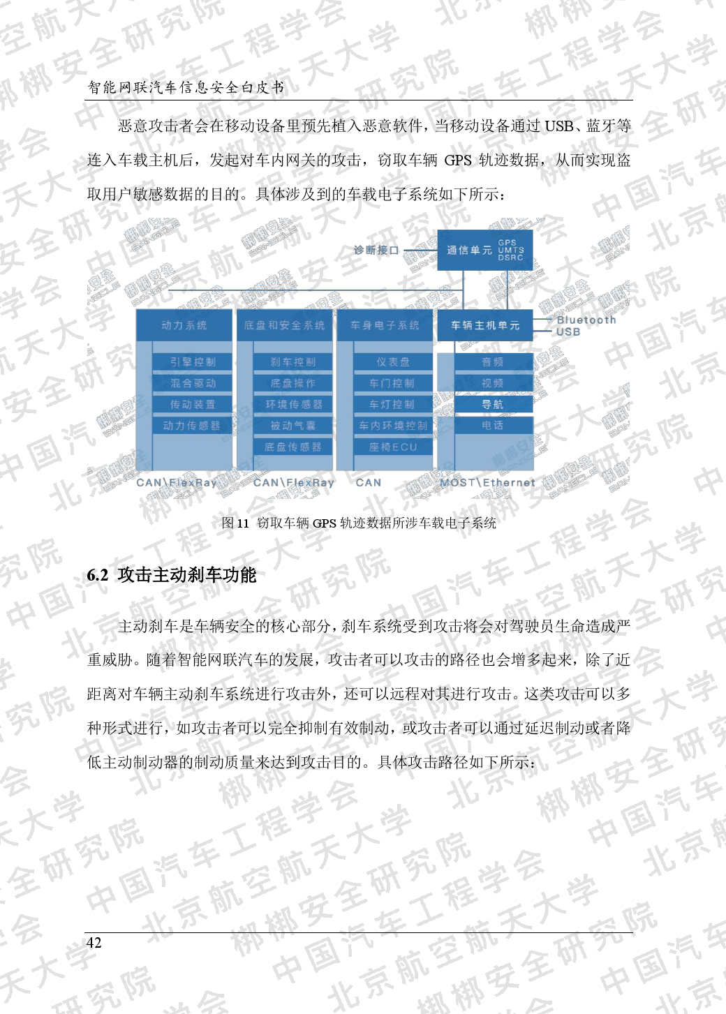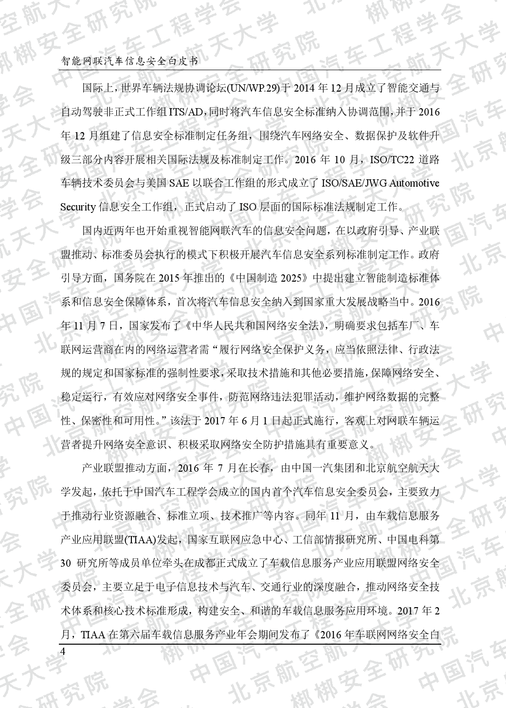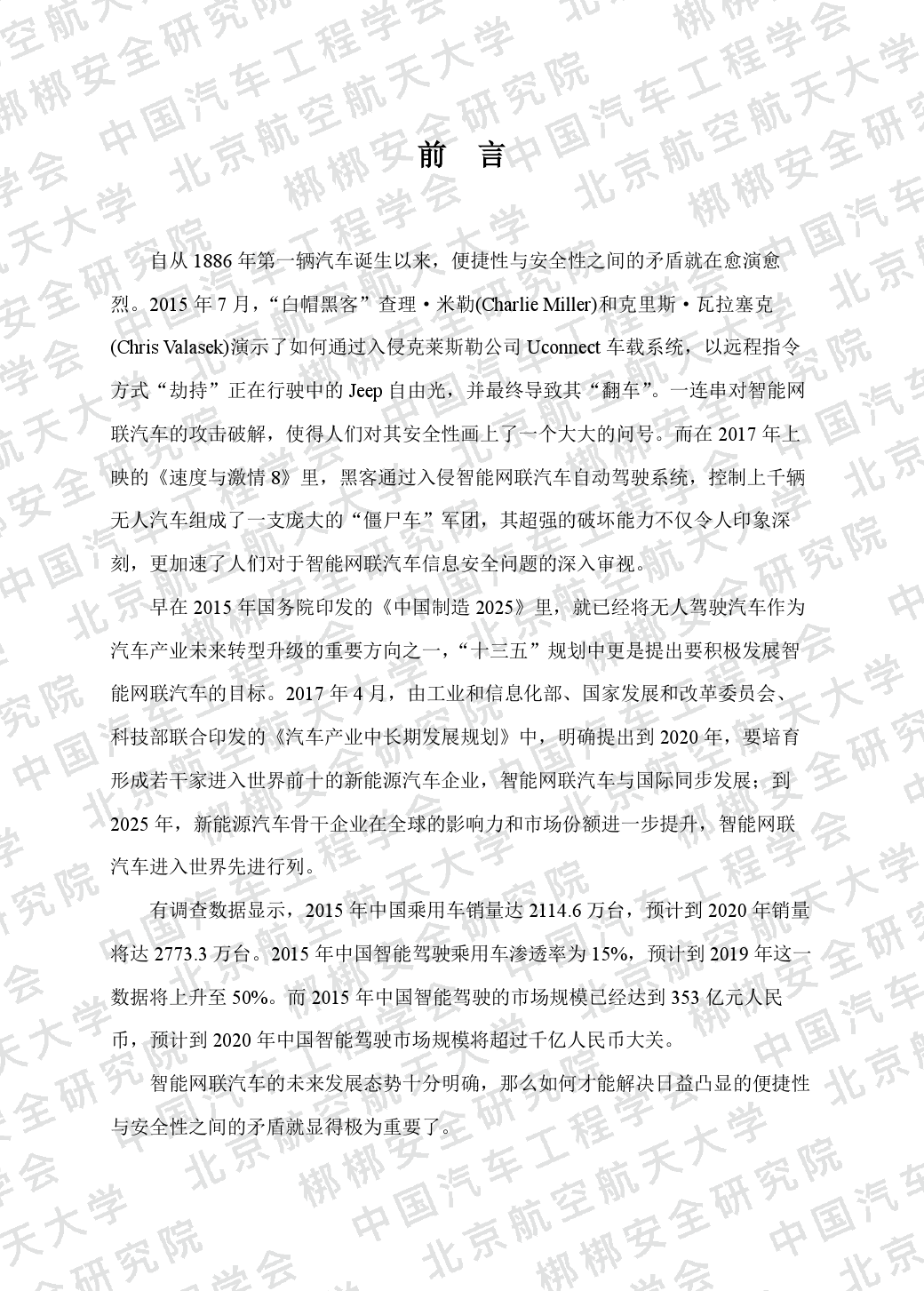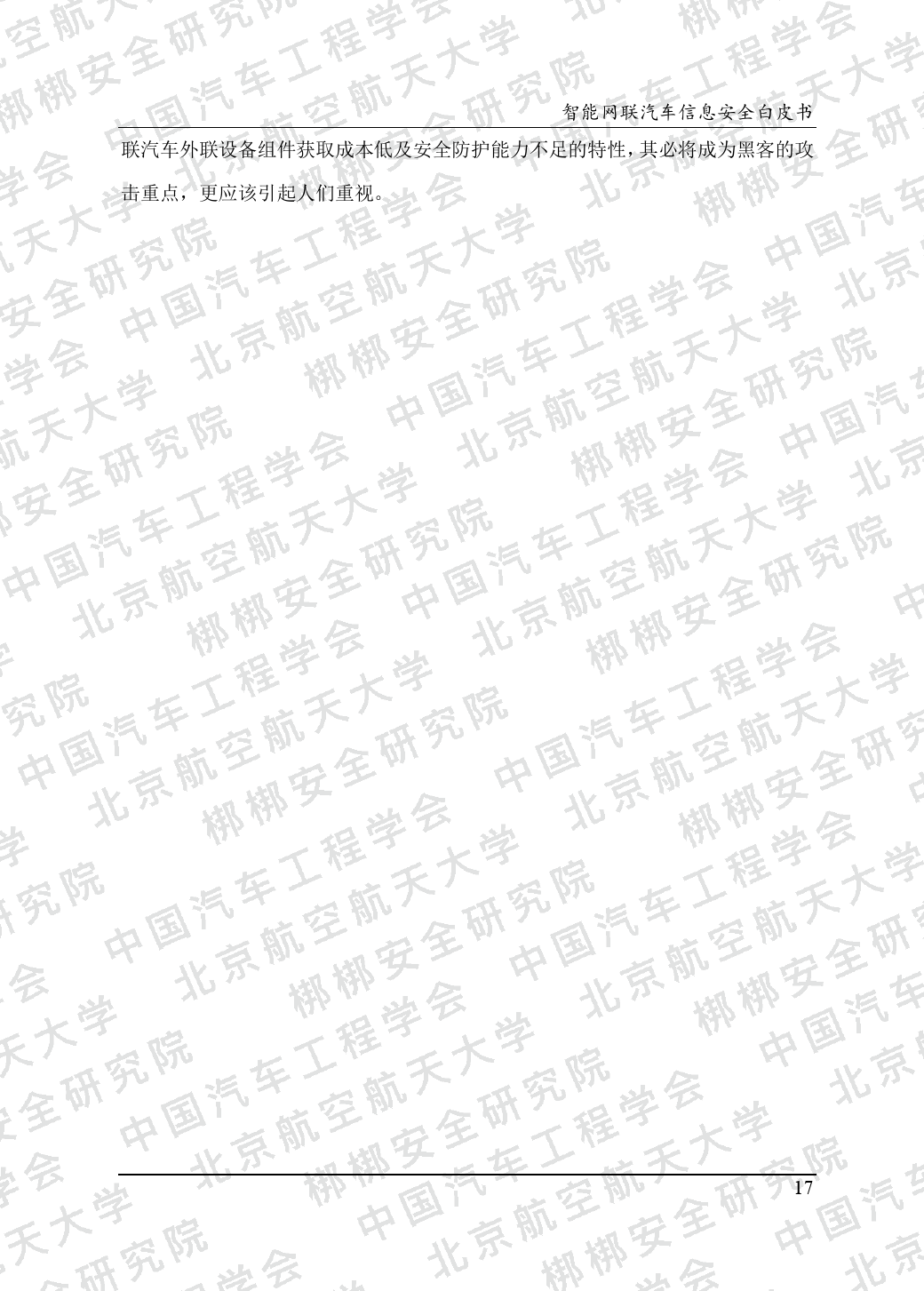 2017年6月12日,在中国智能网联汽车产业创新联盟成立大会上,由中国汽车工程学会、北京航空航天大学、梆梆安全研究院联合编撰的《智能网联汽车信息安全白皮书》正式发布。