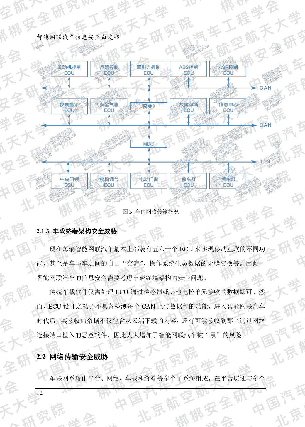 《智能网联汽车信息安全白皮书》总结提出,当前智能网联汽车主要面临来自节点(T-BOX、IVI、终端升级、车载OS、车载诊断系统接口、车内无线传感器)、网络传输、云平台、外部互联生态安全4个层面的12大安全威胁。在黑客攻击的威胁下,智能网联汽车安全性变得愈发脆弱,甚至可能导致致命事件的发生。