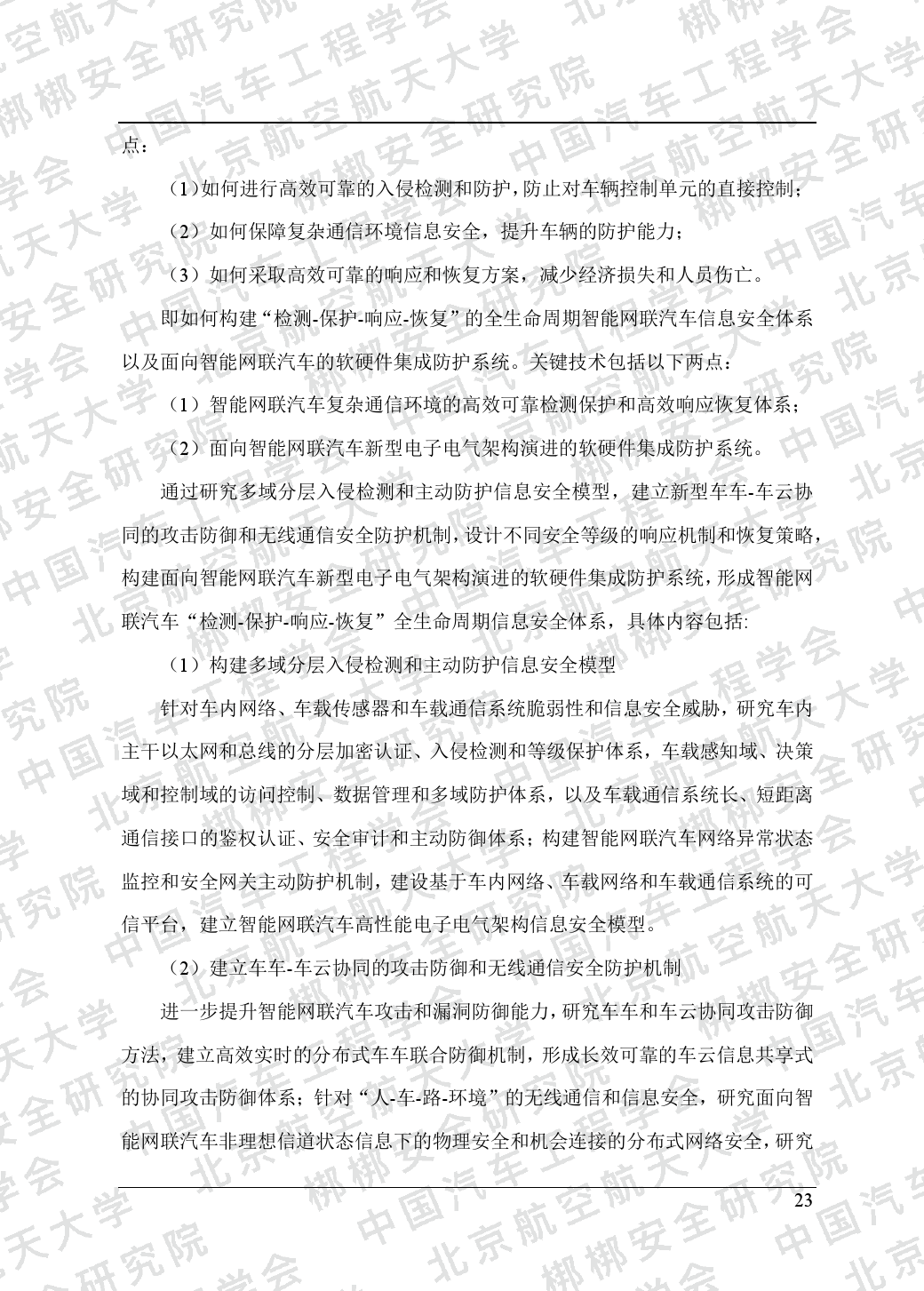 智能网联汽车的信息安全问题应着重解决如何进行高效可靠的入侵检测和防护,防止对车辆控制单元的直接控制;如何保障复杂通信环境信息安全,提升车辆的防护能力;如何采取高效可靠的响应和恢复方案,减少经济损失和人员伤亡。即在方法论指导下,构建“检测-保护-响应-恢复”全生命周期智能网联汽车信息安全体系,以及面向智能网联汽车的软硬件集成防护系统。