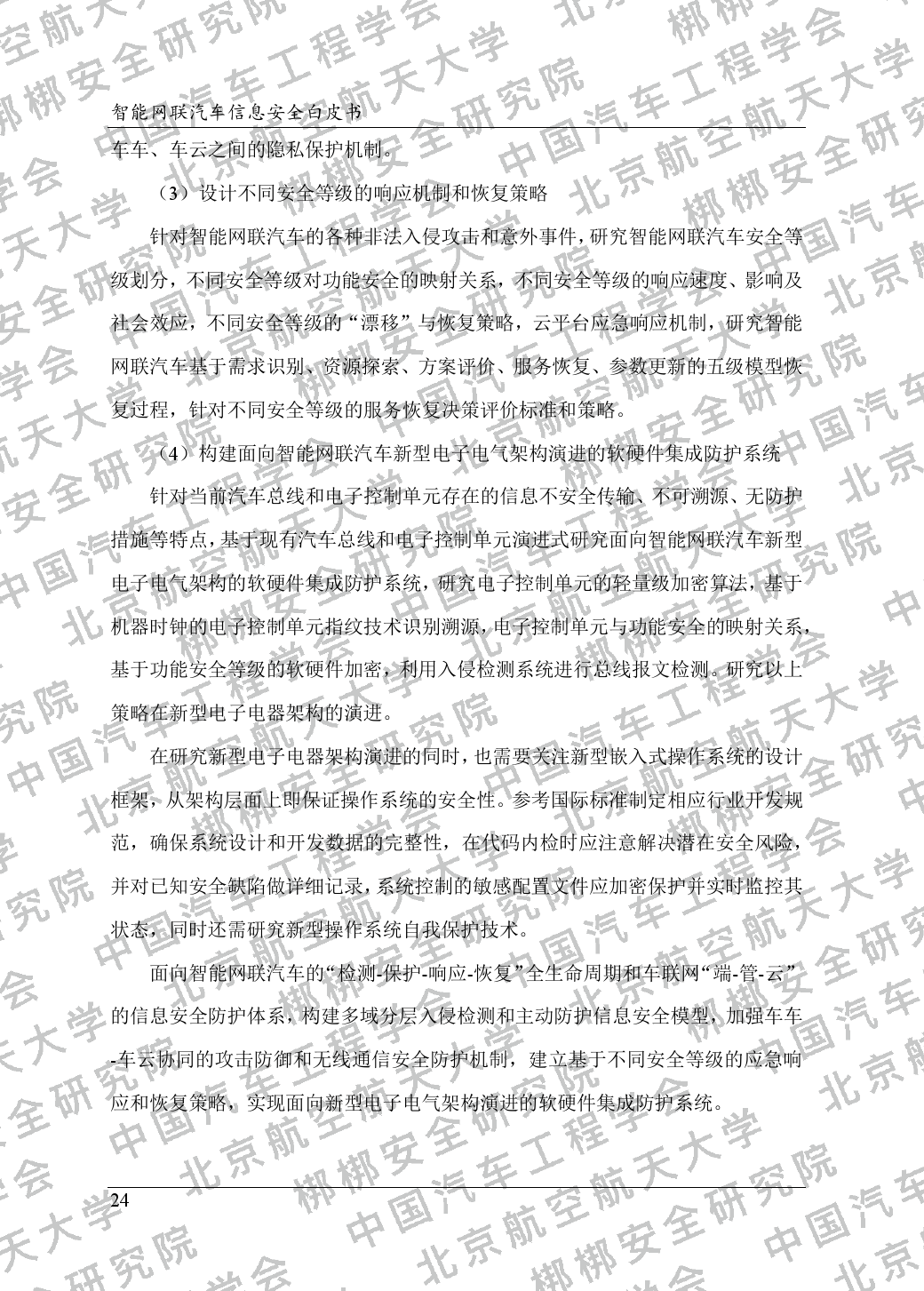 以方法论为指导,通过研究多域分层入侵检测和主动防护信息安全模型,建立新型车车-车云协同的攻击防御和无线通信安全防护机制,设计不同安全等级的响应机制和恢复策略,构建面向智能网联汽车新型电子电气架构演进的软硬件集成防护系统,形成智能网联汽车“检测-保护-响应-恢复”全生命周期信息安全体系,研究新型电子电器架构演进的同时关注嵌入式操作系统的安全。