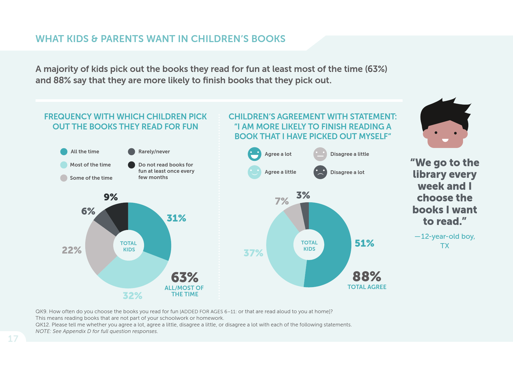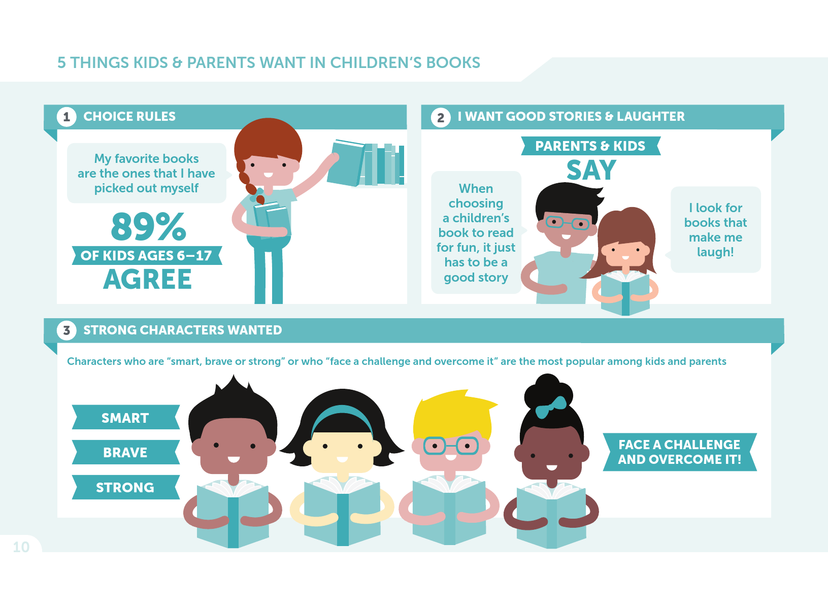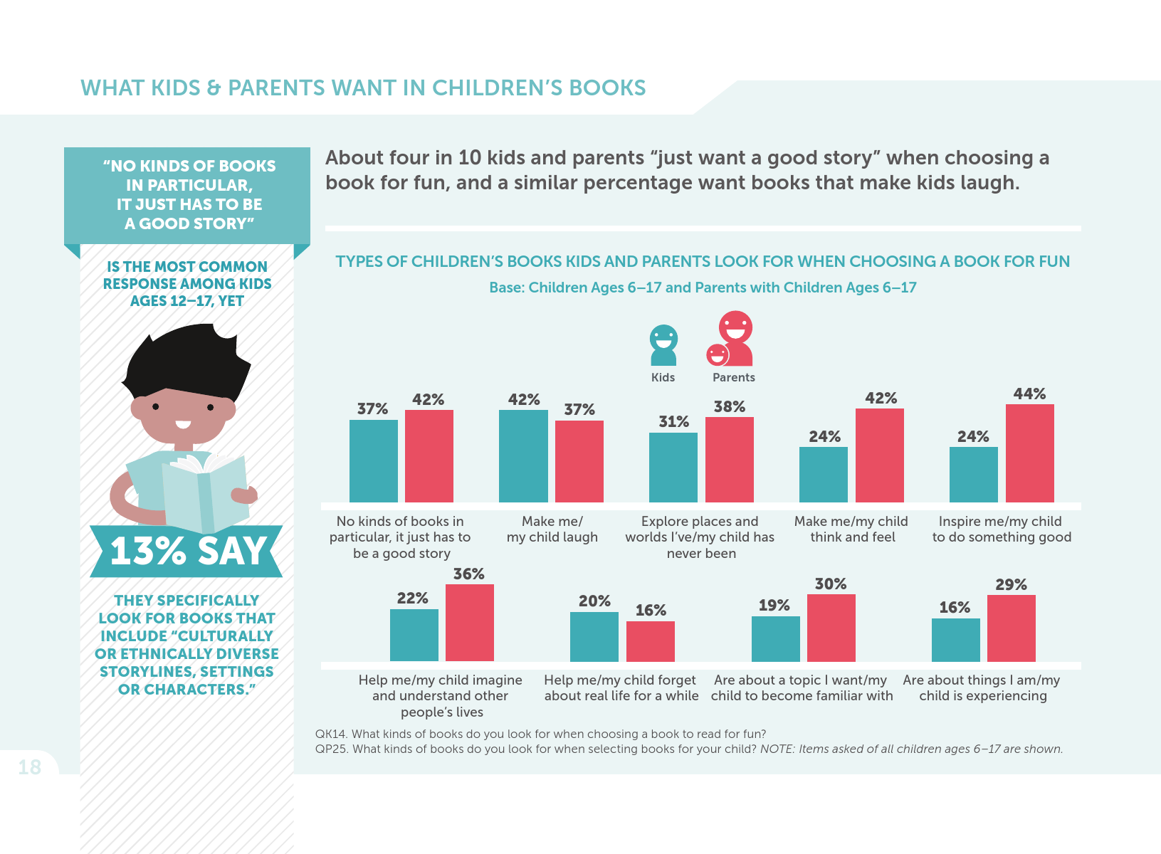 近40%的孩子和家长在选择书的时候,都会挑选“just want a good story”(好故事)以及“make me/my child laugh”(好笑)的书籍,家长和孩子在这两点上想法都很相似。
