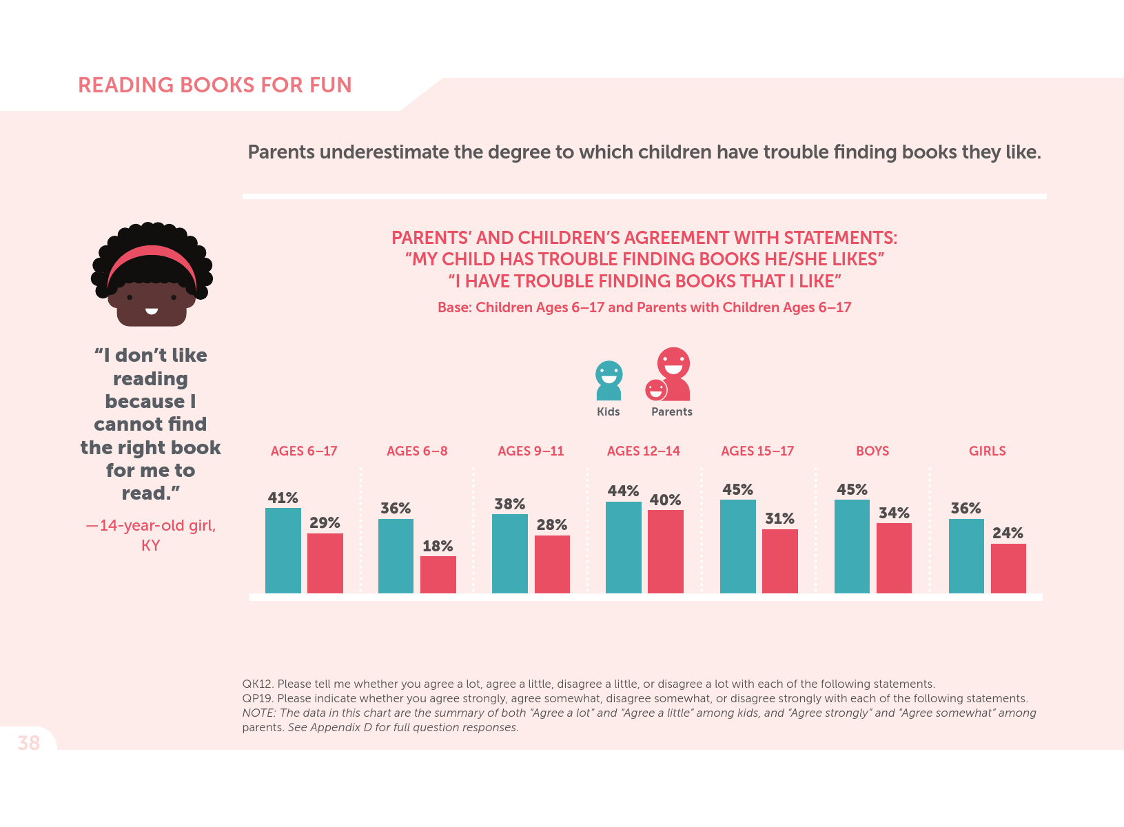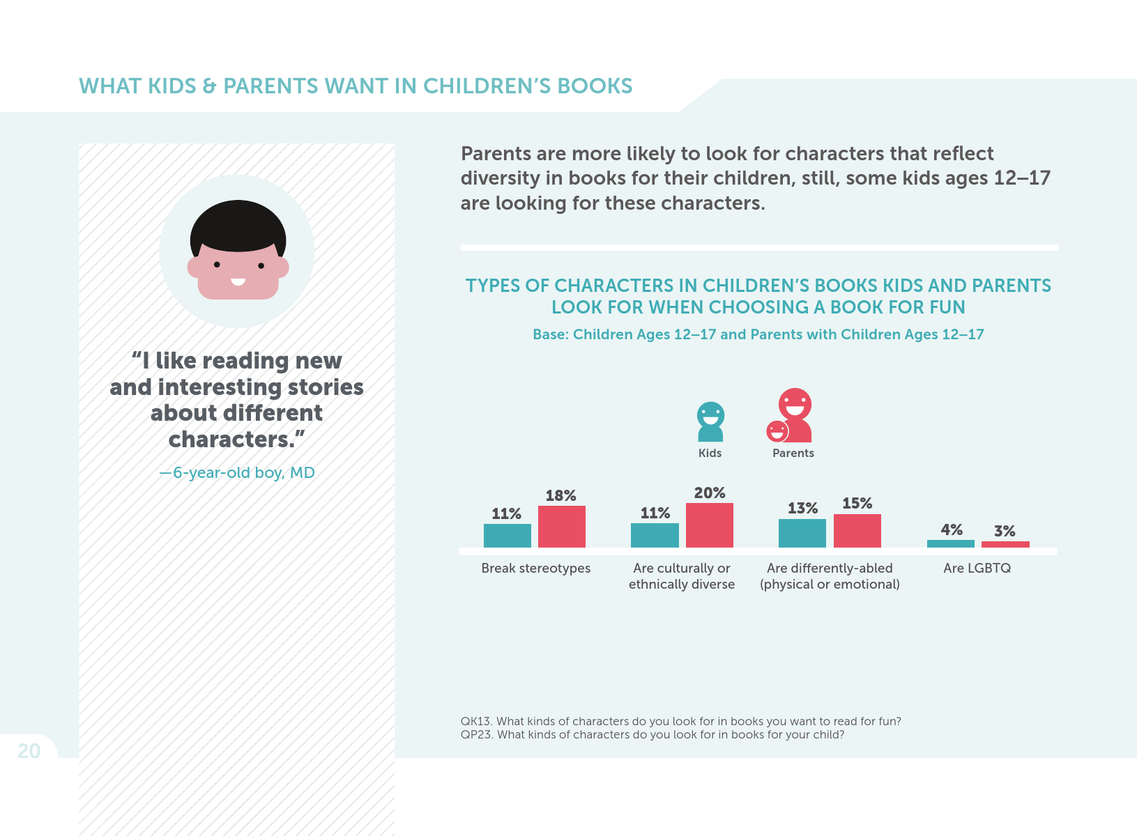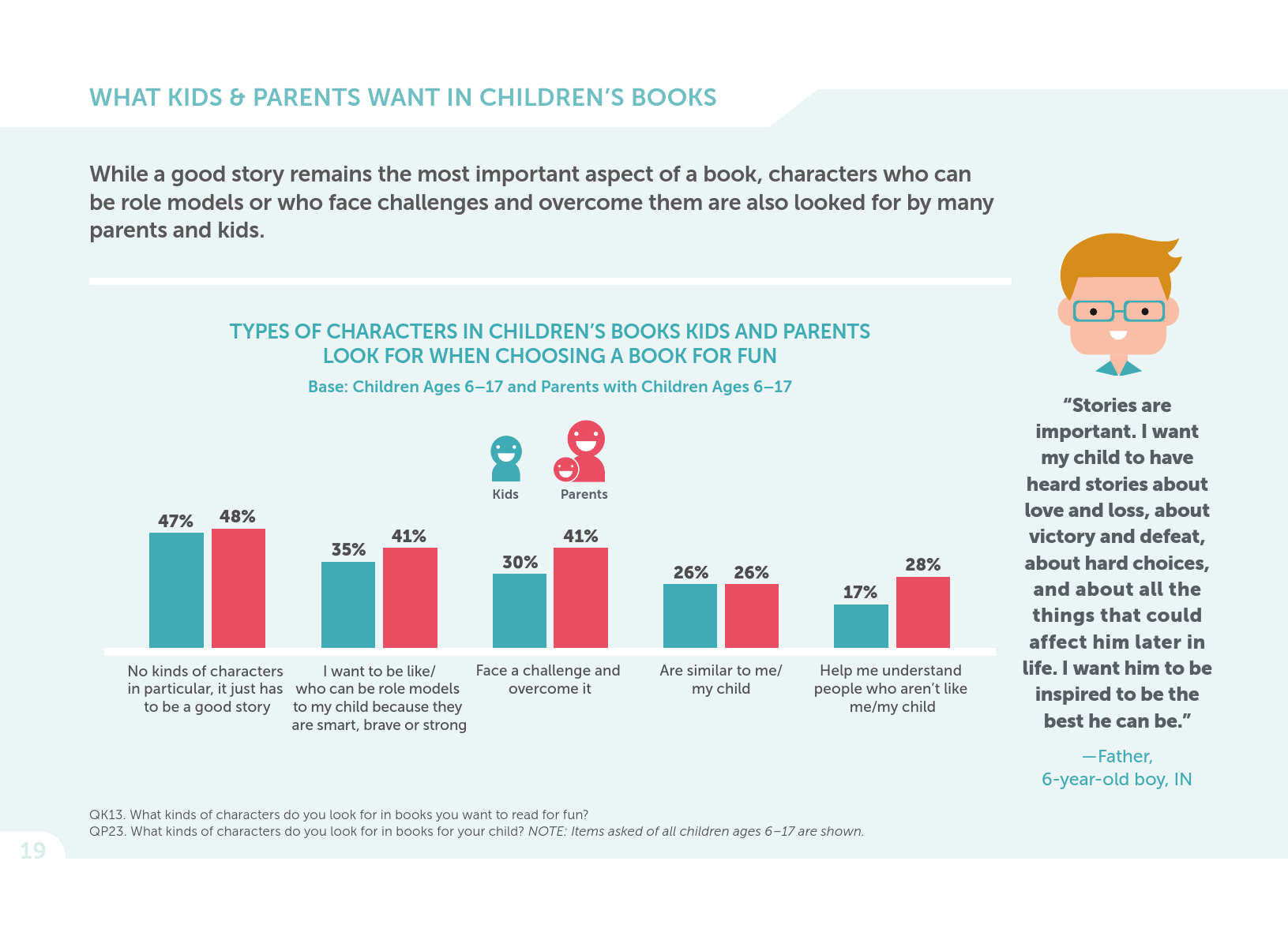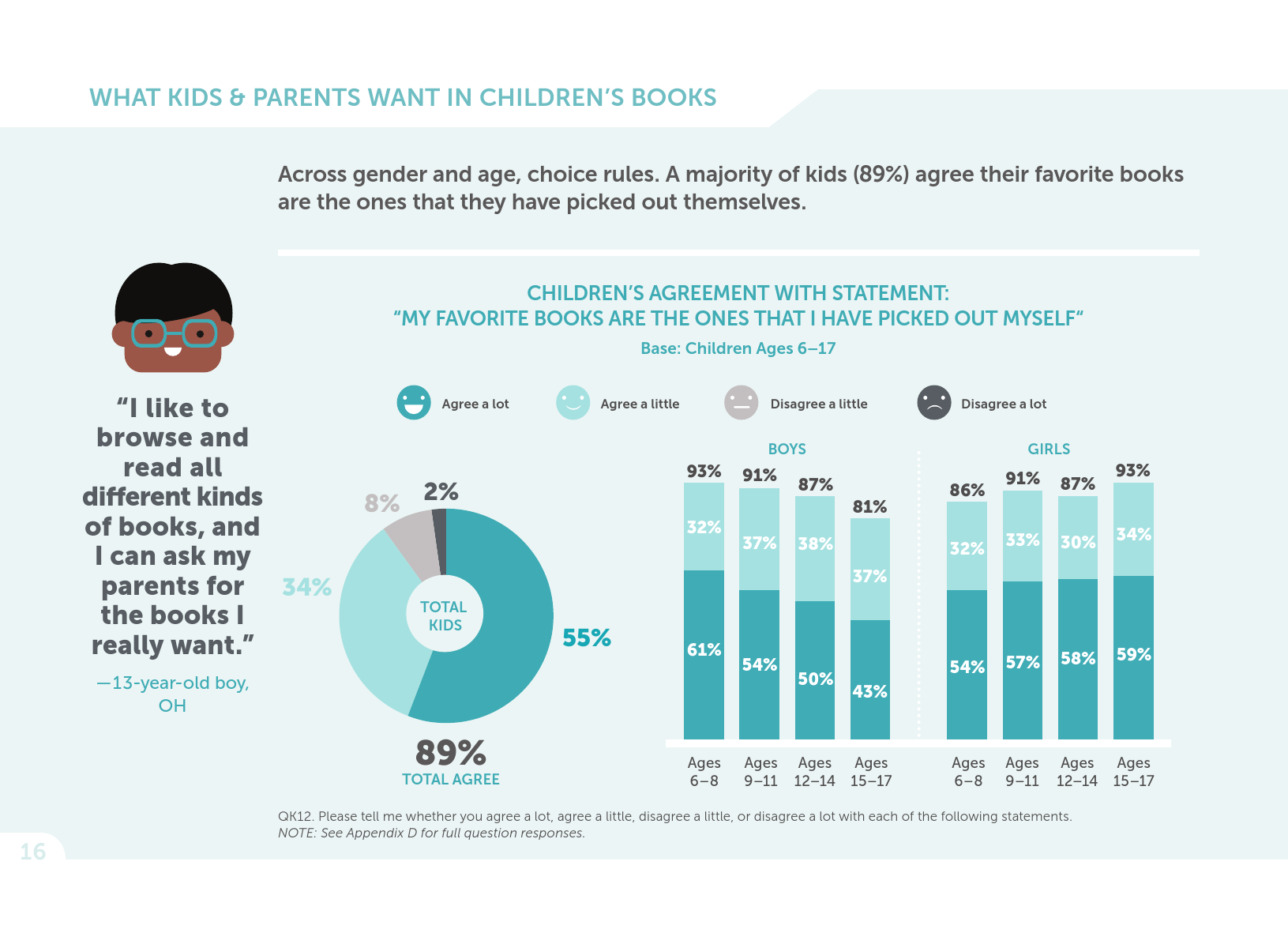 近40%的孩子和家长在选择书的时候,都会挑选“just want a good story”(好故事)以及“make me/my child laugh”(好笑)的书籍,家长和孩子在这两点上想法都很相似。