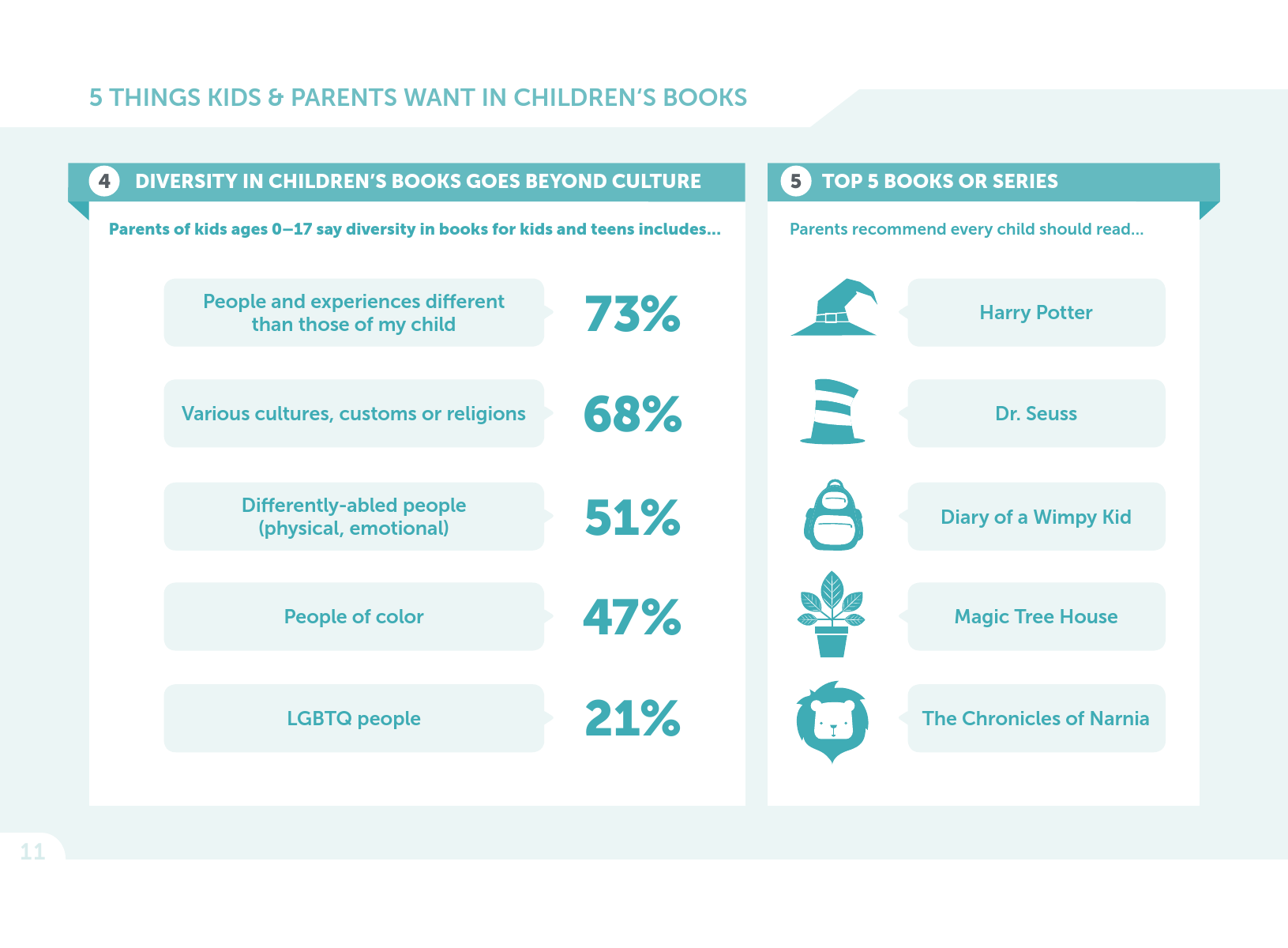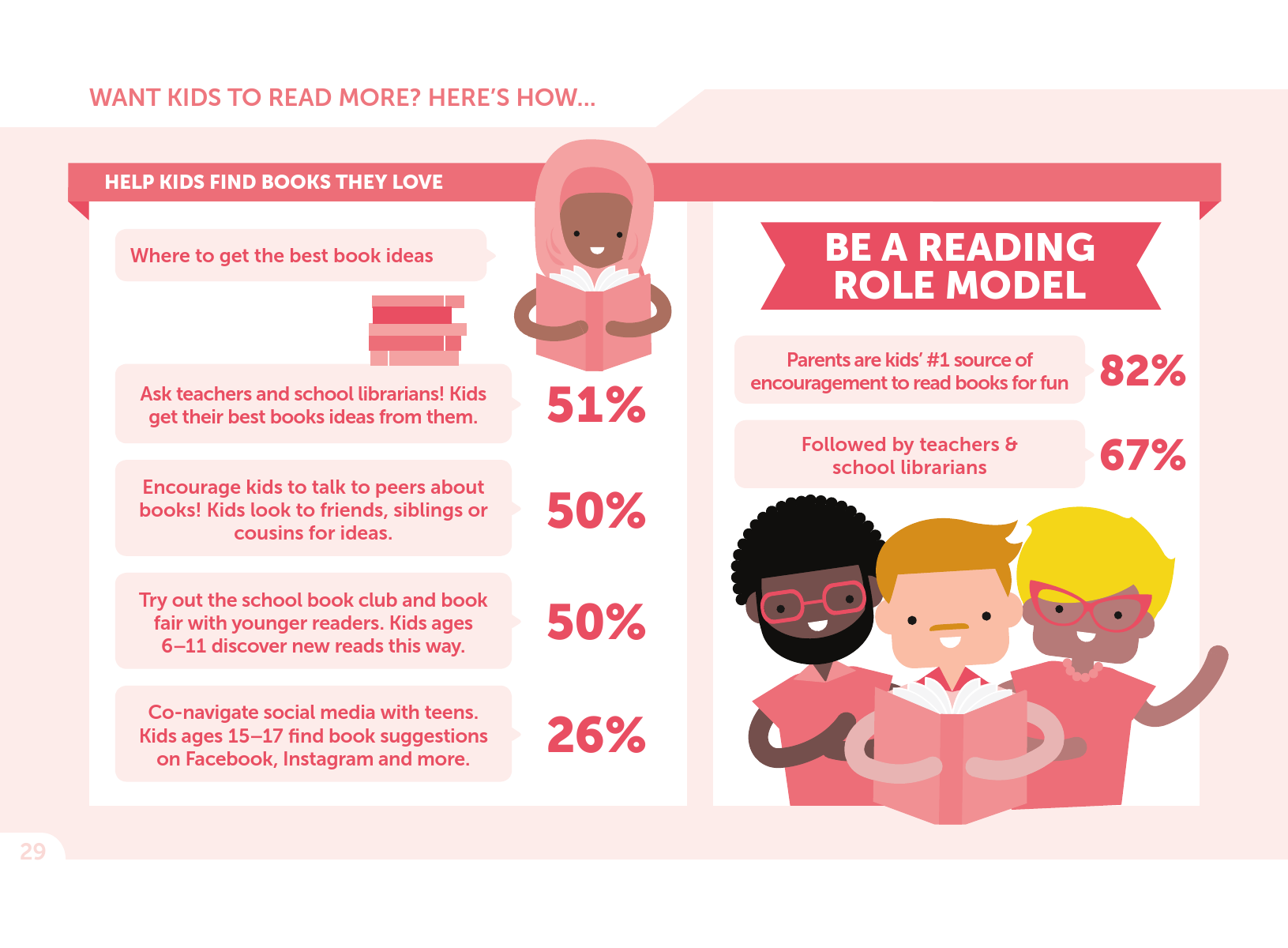 在为孩子挑选合适的书时,一半的家长都会参考老师或者图书馆老师的意见,会鼓励孩子咨询朋友或同辈亲戚,一半6-11岁孩子的家长会通过学校“读书俱乐部”(book club)和书展挑选。