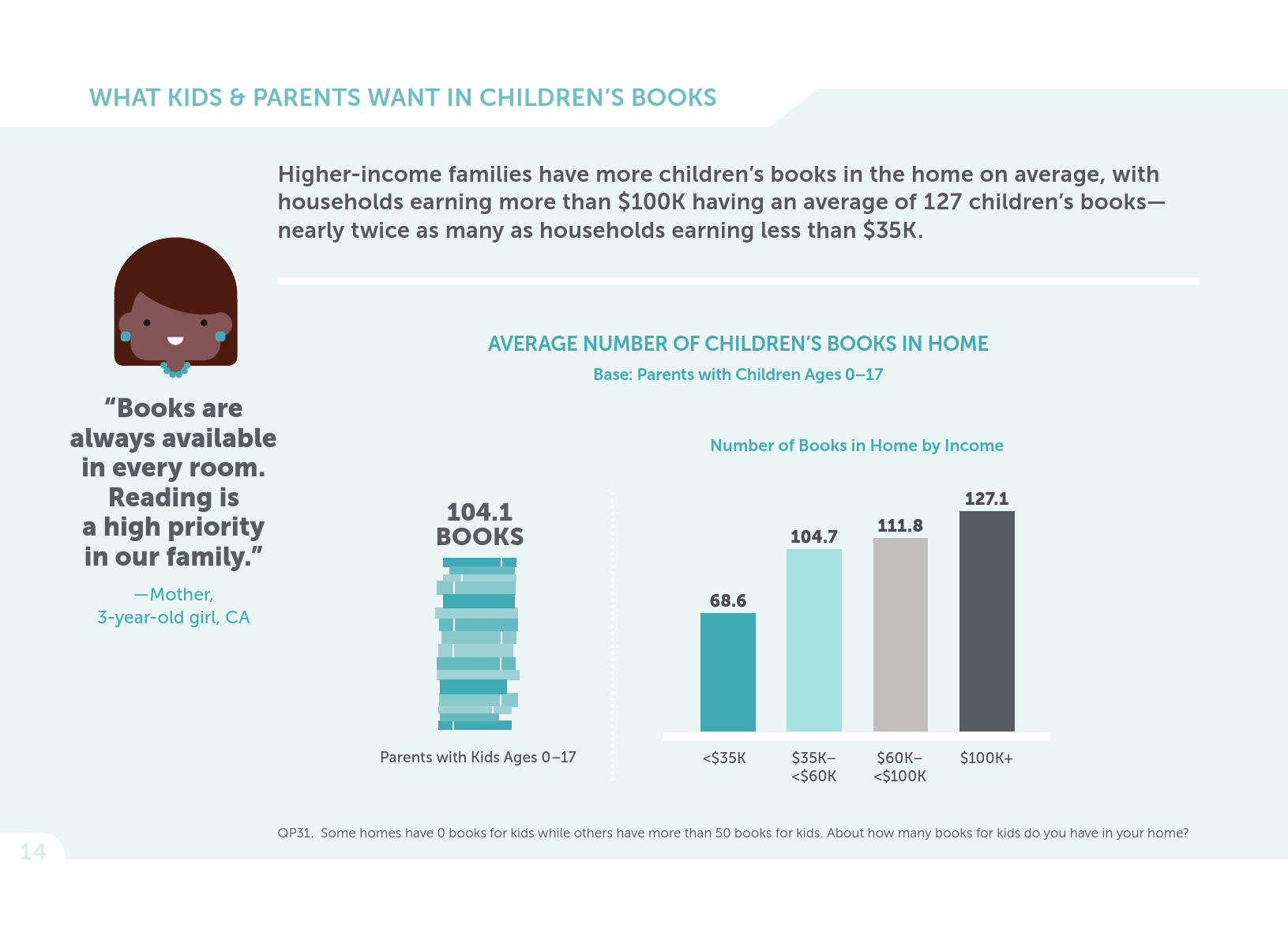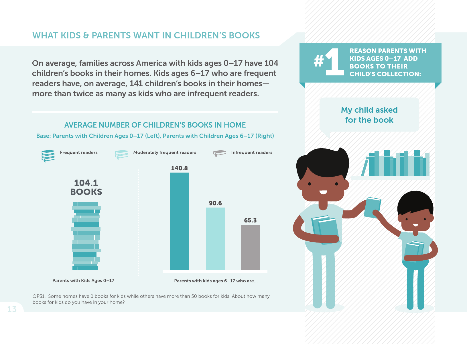 家有0-17岁孩子的家庭平均拥有104.1本童书,其中6-17岁的孩子中,经常阅读者拥有140.8本书,中等阅读者拥有90.6本书,而极少阅读者也拥有65.3本。