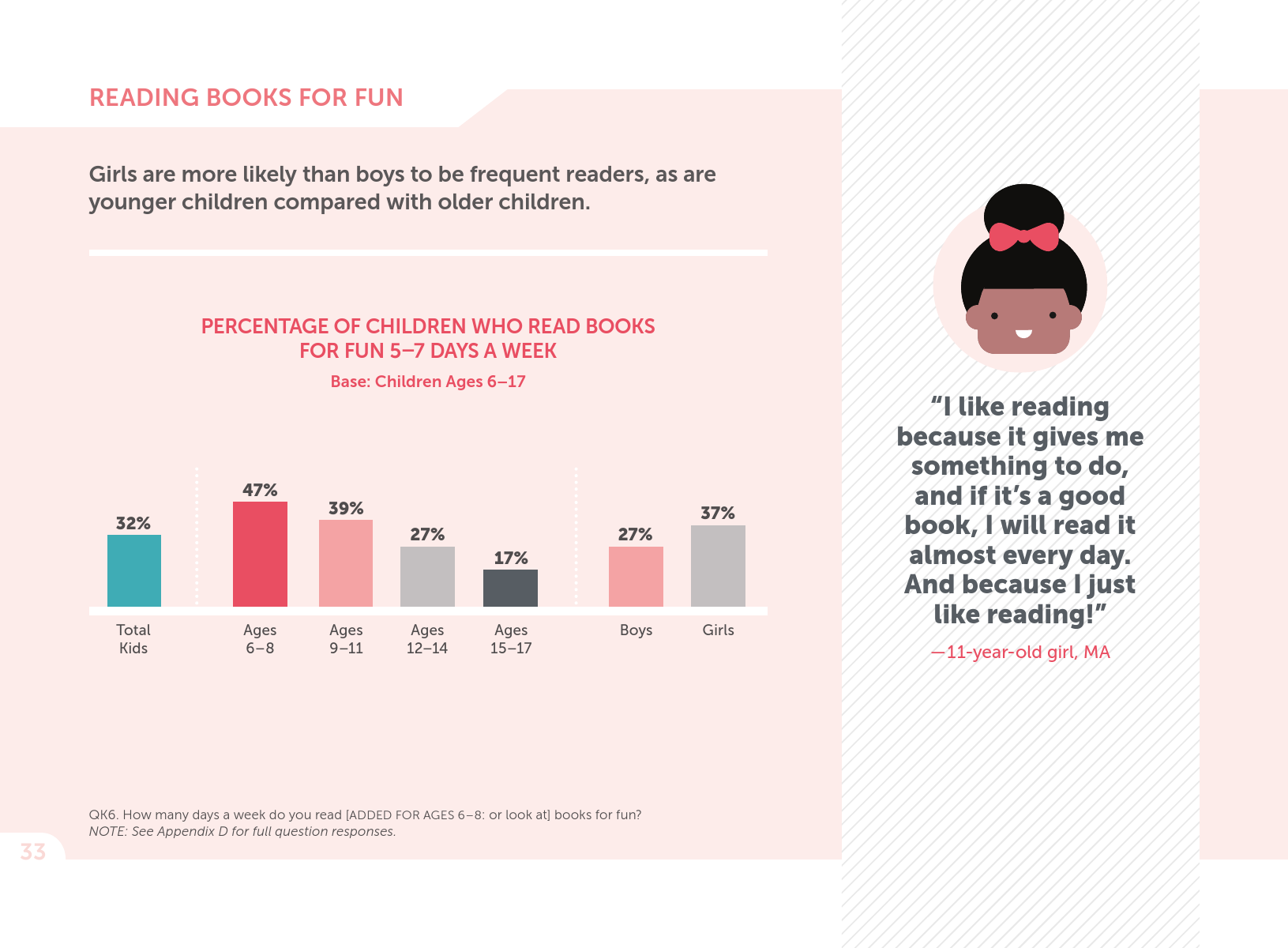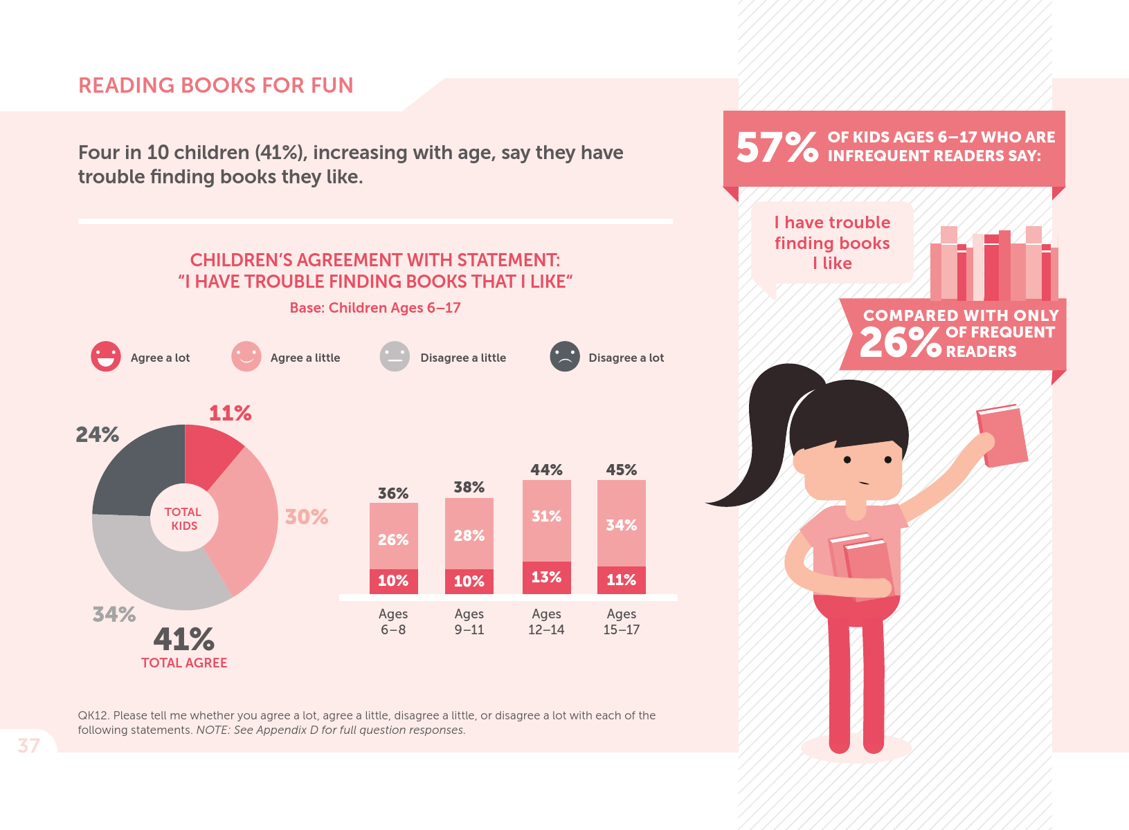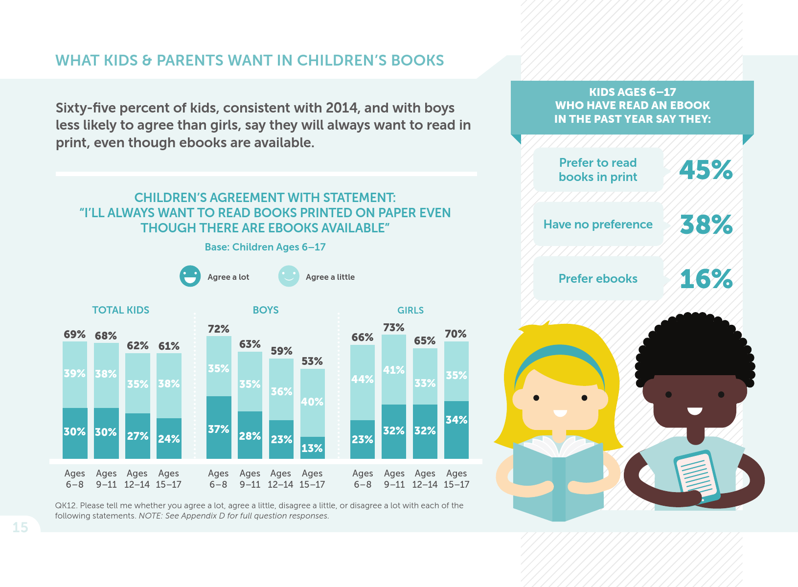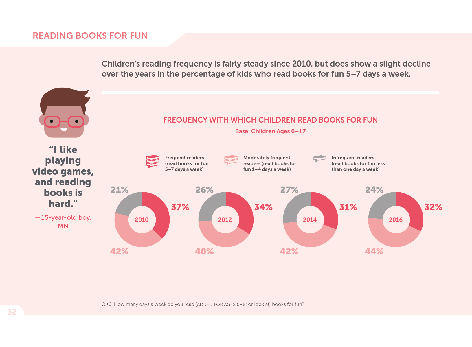 6-8岁这个年龄段经常阅读者的比例是47%,9-11岁变成为39%,而到了15-17岁组则降为17%。