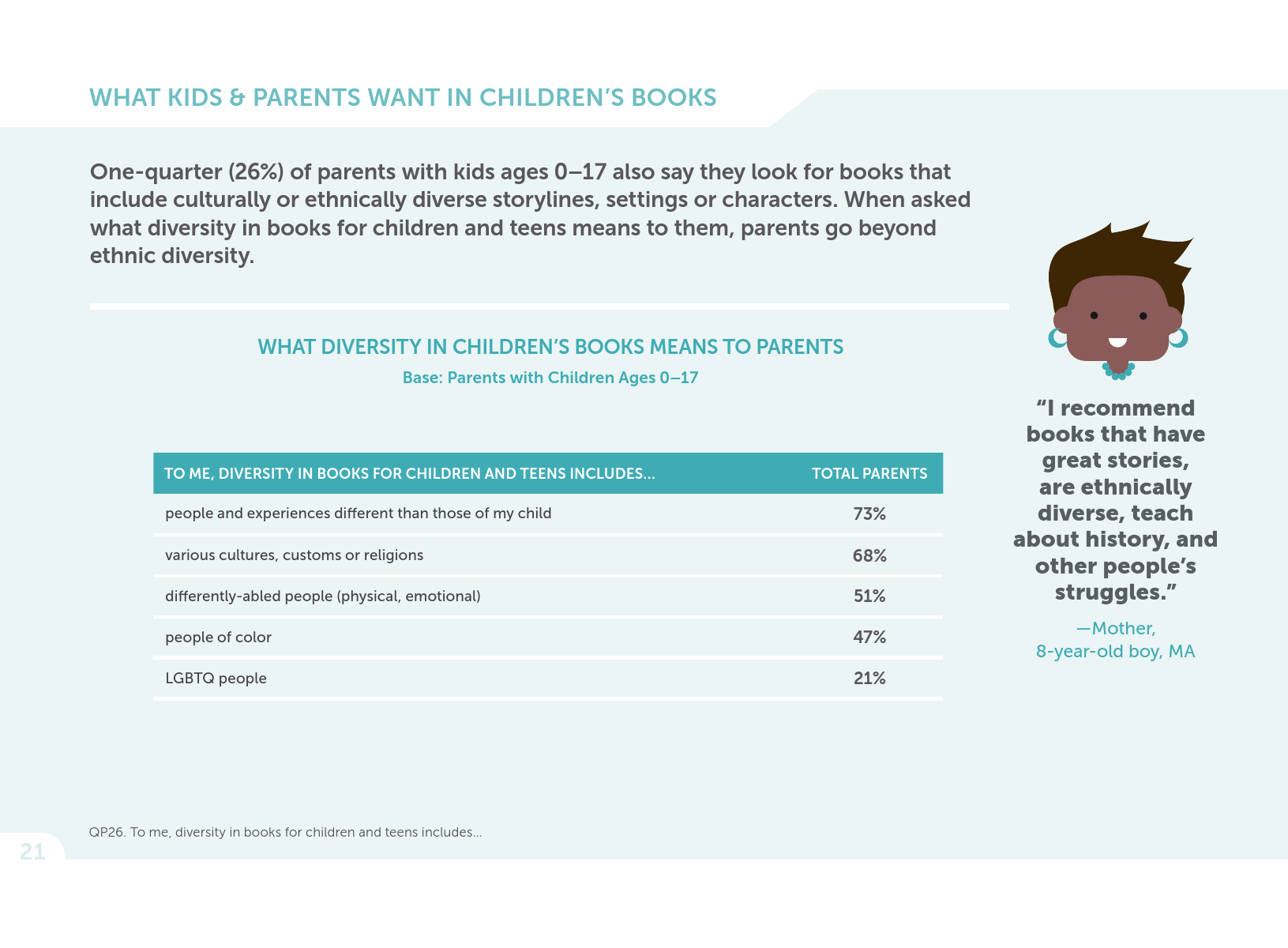 差异比较大的是,家长在为孩子选书的时候更看重“Inspire my child to do something good”(能启发孩子做有意义的事情)以及“Make my child think and feel”(让孩子思考和用心感受)。