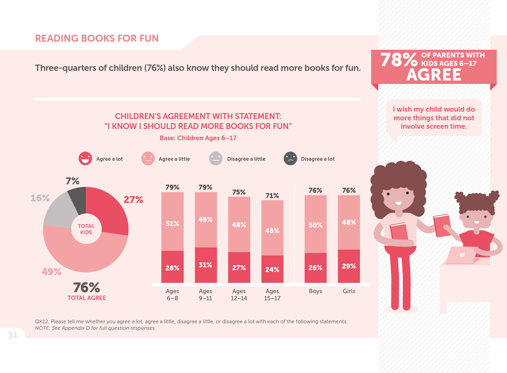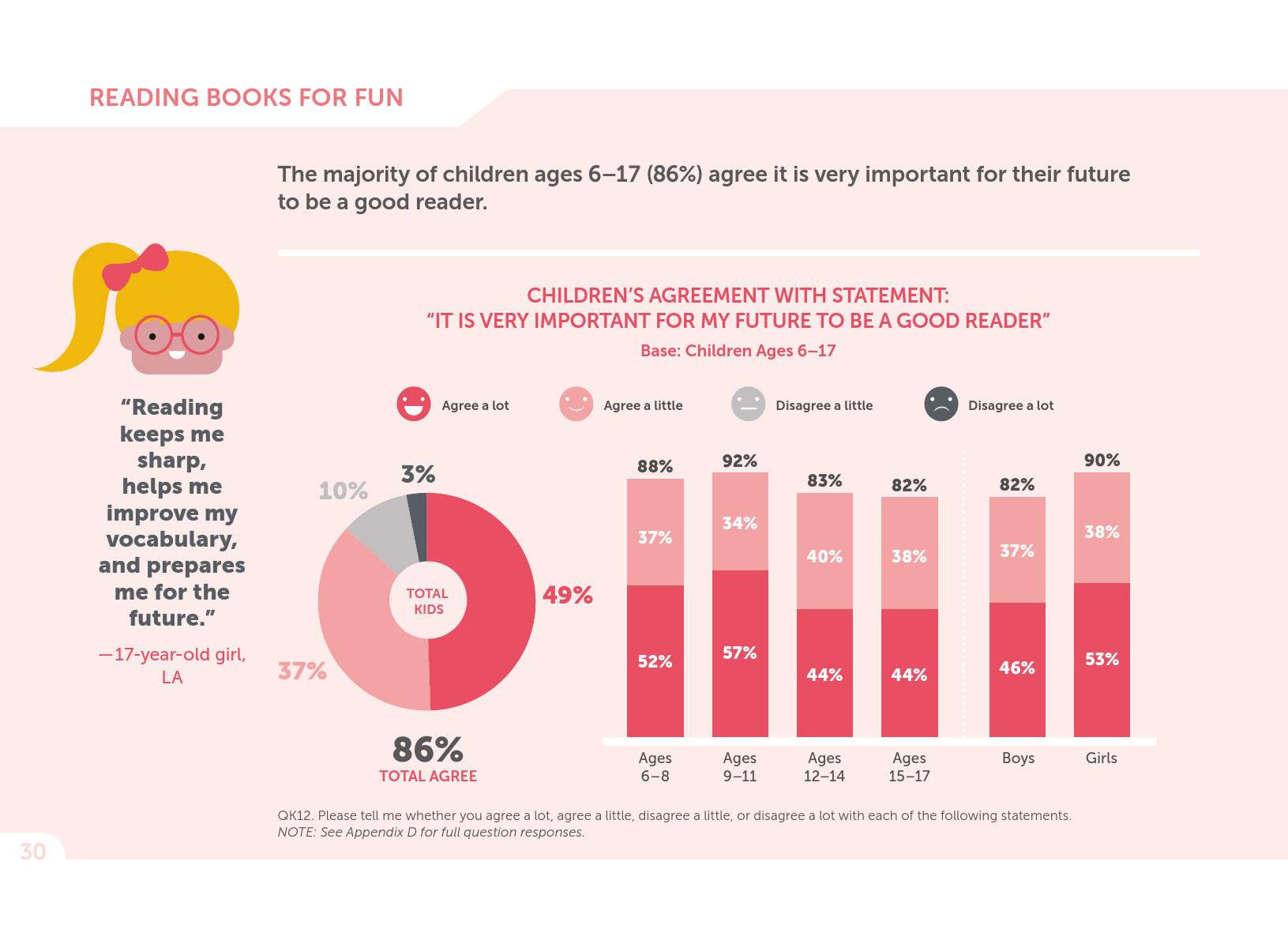 当被问及是否同意“阅读对我的未来很重要”,49%的6-17岁孩子表示非常同意这一说法,37%的表示同意一些,两项相加,86%这个年龄段的孩子都觉得阅读是重要的。而且有趣的是,越小的孩子认同率越高,看来阅读习惯真的是应该从小培养。