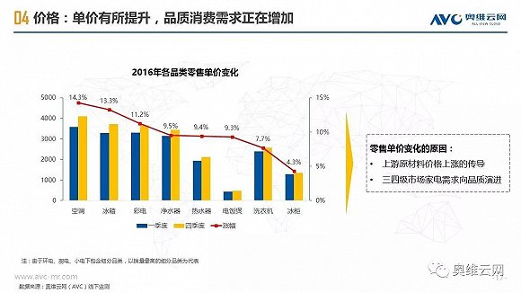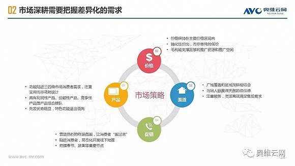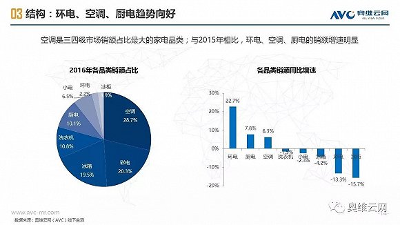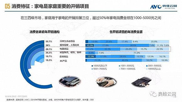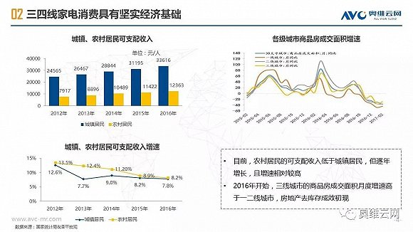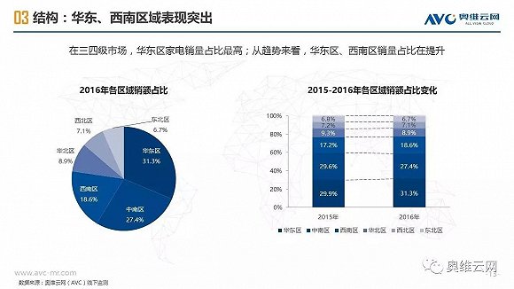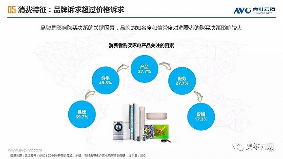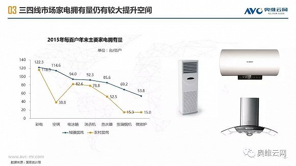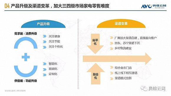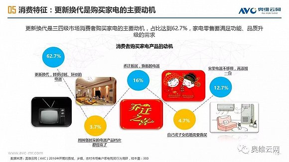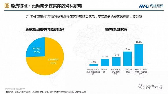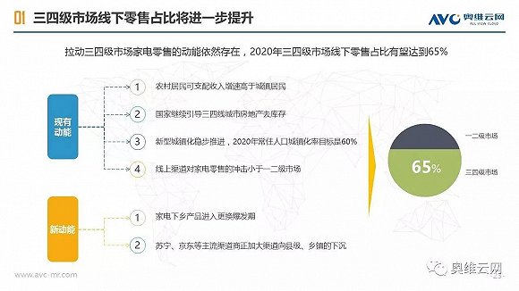 2016年,中国线下家电零售出现销额负增长,给行业敲响警钟。与受线上冲击明显、终端格局较为稳定的一二级市场相比,三四级市场线下家电零售表现相对平稳,2016年销额仅下降1.7%(同期一二级市场下降4.5%),环电、厨电、空调等品类销额增长明显,专卖店、区域连锁掌控主要市场份额,家电品质需求正在增加。同时,三四级市场的家电消费有其明显的特征,如更新换代成为购买家电的主要动机、品牌诉求超过价格诉求、更倾向于在实体店购买等。基于拉动三四级市场家电零售进一步发展的动能分析,奥维云网(AVC)认为2020年中国三四级市场线下零售占比有望达到65%,家电厂商、渠道商需要深耕三四级市场,在产品、价格、渠道、促销方面把握消费者独特的购买需求,采用差异化的市场运营策略,才能赢得更大的市场份额。