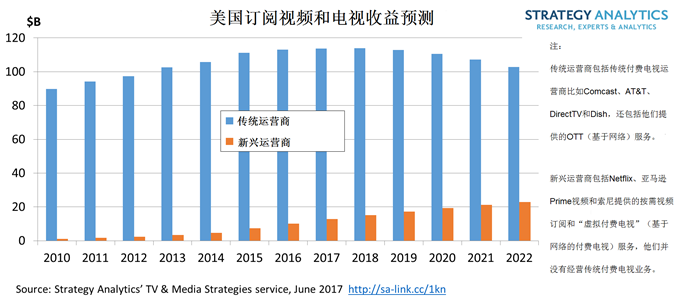 - Comcast和A&T等知名电视付费公司,包括他们传统的付费电视服务和DIRETV NOW这样新的基于互联网的服务,仍将在2022年占总的市场收益份额的80%。