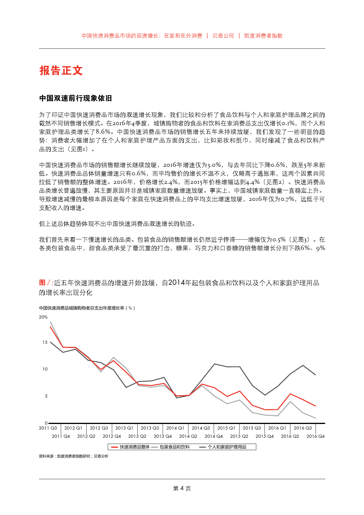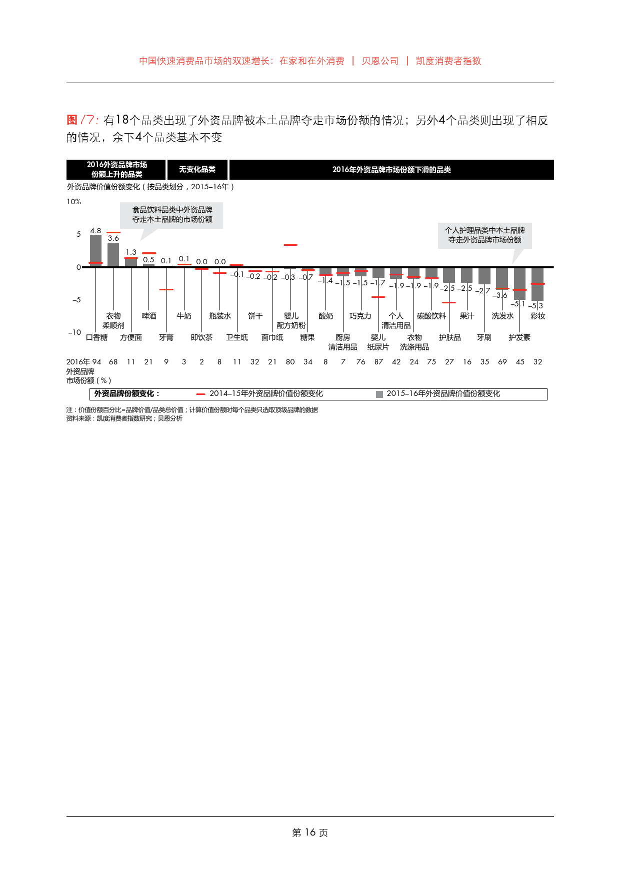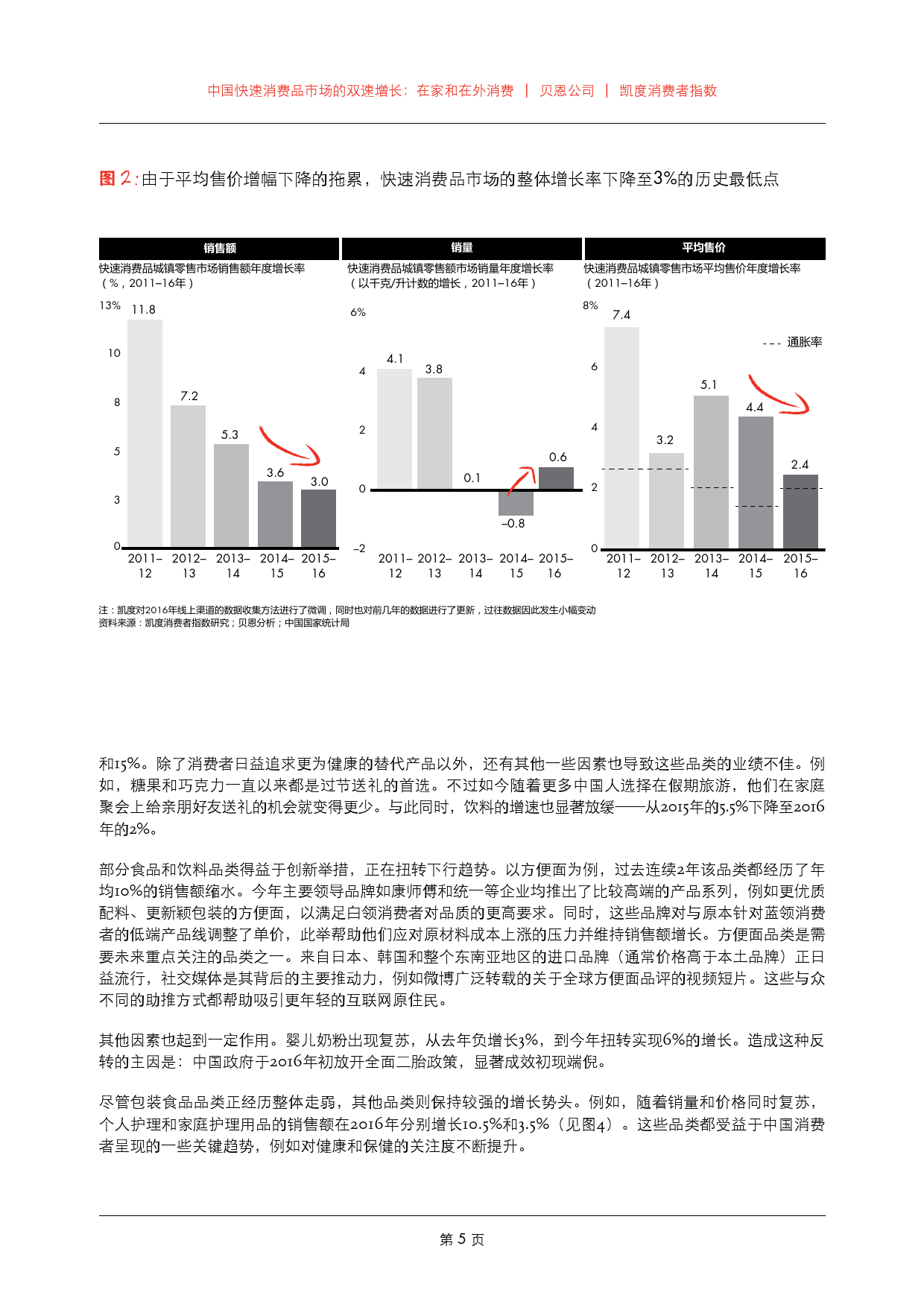 今年的报告发现,就包括食品、饮料、家庭护理及个人护理在内的整个快速消费品市场而言,双速增长趋势依然得到延续。同时,纳入2016年研究的所有品类的家庭消费依然疲软,增速为3%,创五年新低。究其原因,在于销量增长平缓、价格上涨减速,从而拖累了快速消费品市场的整体销售额增长。