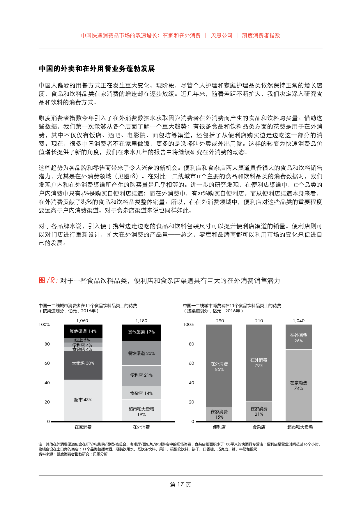 通过智能手机搜集其在外消费食品饮料的情况,并结合其他数据来源,对餐饮渠道的整体动态进行了深入剖析。结果显示,从2013到2016年,用于家庭消费的食品年增速为3%,然而同一时期的食品外卖增速却高达44%,外出就餐增速也达到10%。这一变化为快速消费品(FMCG)的价值增长开辟了新视野,为具备前瞻性的品牌带来了重要机遇。