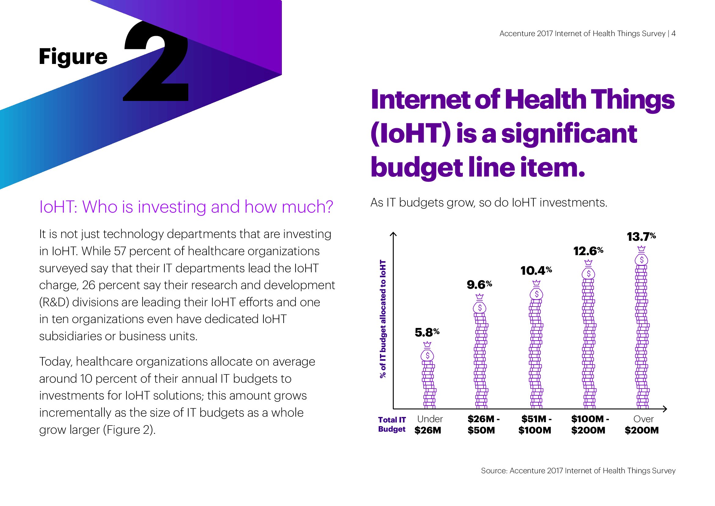 医疗结构内投资物联网的主要是IT部门(57%),其次是研发部门(26%)。
