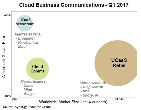 Synergy Research第一季度的数据显示,云通信市场同比增长23%,主要是由于UCaaS(统一通信即服务)快速普及推动市场增长。零售UCaaS服务占整个市场的70%以上,但是,UCaaS批发市场规模越来越大。整个云通信市场每年收入总额超过20亿美元。 按季度收入细分,RingCentral是云通信市场的领导者,并且其市场份额一直在不断增长。其次是8×8、Mitel和ShoreTel。