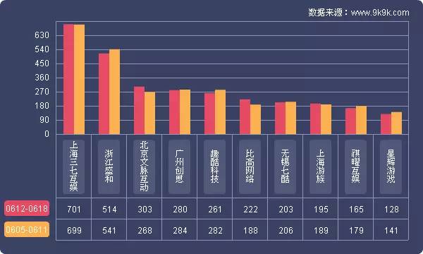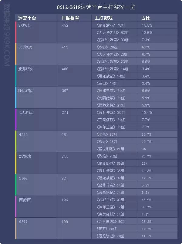 点评:本周各运营平台主打游戏开服情况较上周变化不大;其中37游戏上调主打游戏《大天使之剑》的开服频率为9服/天。《攻沙》、《剑侠情缘兵器谱》则新晋为360游戏主打产品,开服占比分别为6.7%、5.5%。