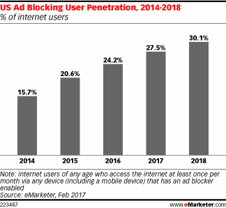 根据eMarketer的预测,今年,将有超过1/4的美国网民使用广告拦截,和2014年的16%相比增长明显。