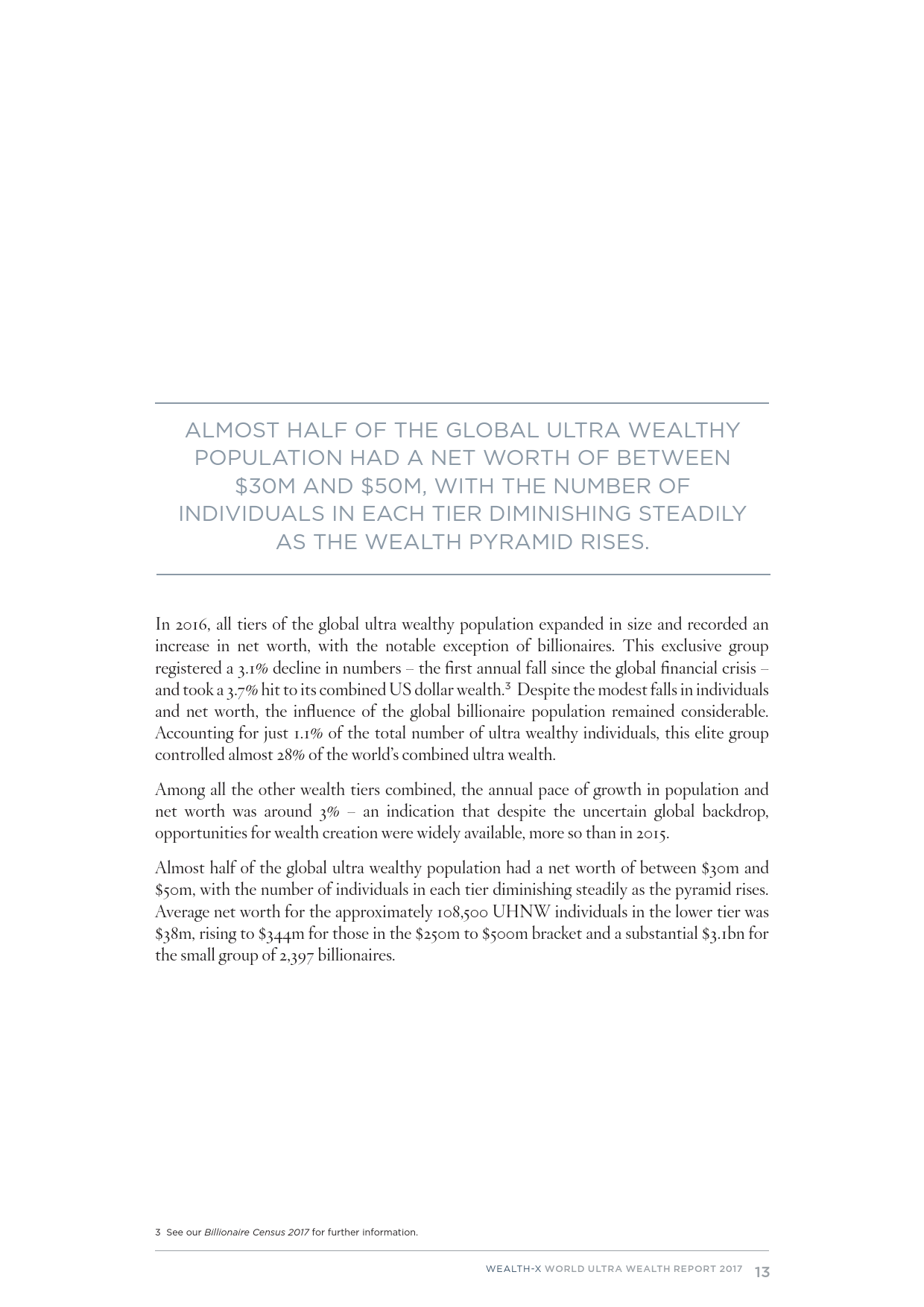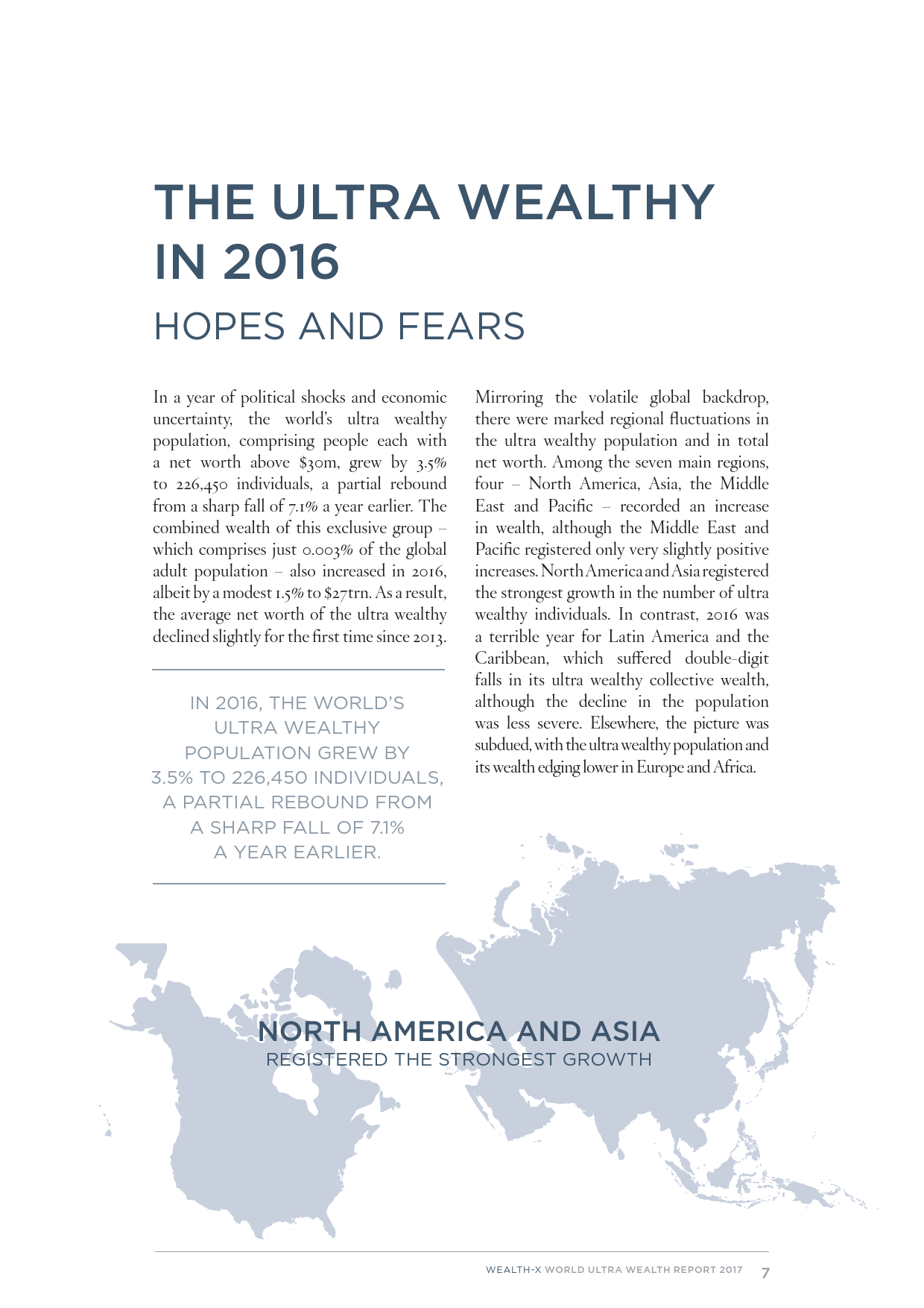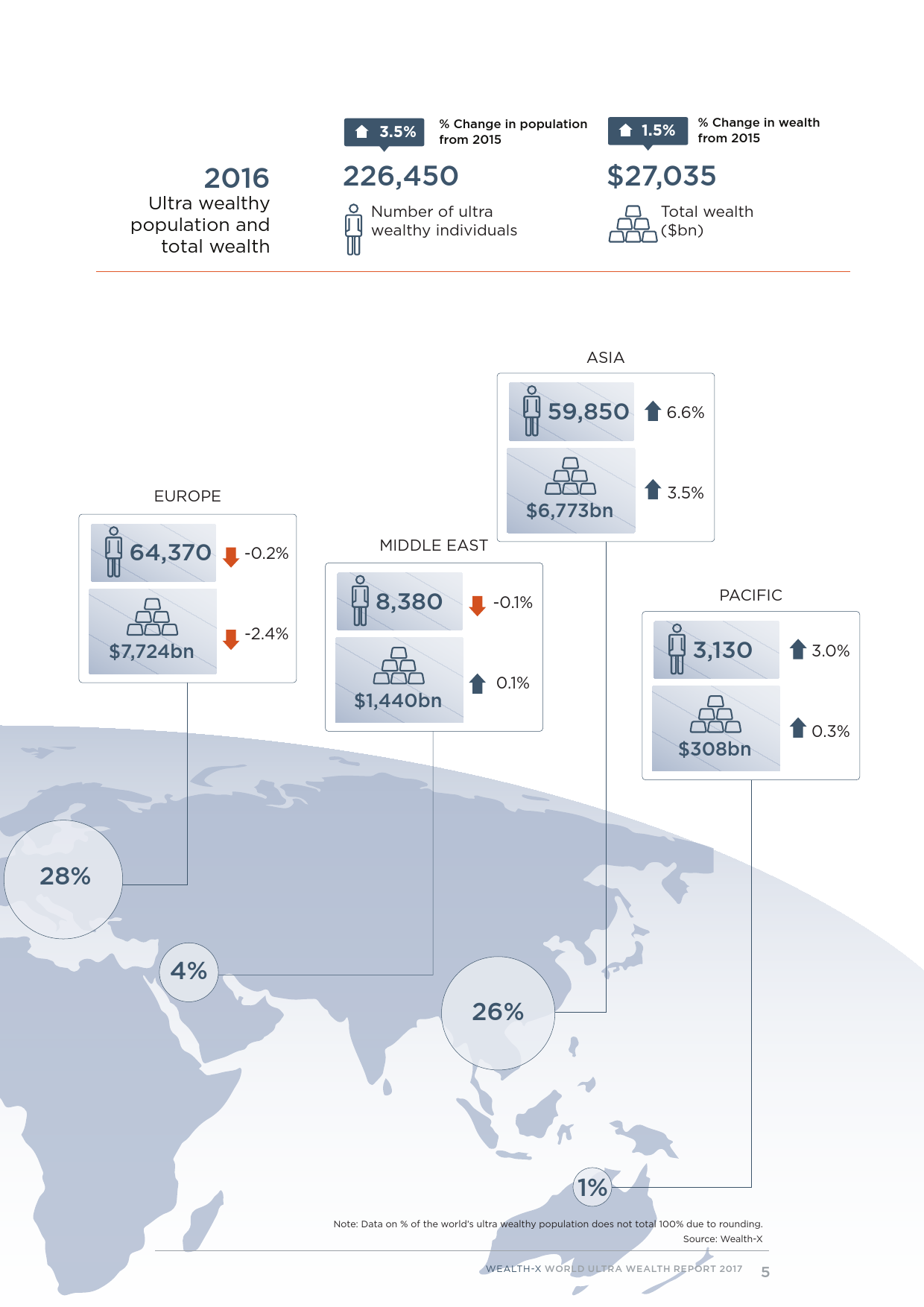 报告显示,全球超高净值人士(主要居所以外净资产超过3000万美元)数量达到226450人,较2015年增加3.5%。尽管在人数上仅占全球成年人口的0.003%,但他们的总财富达到27万亿美元,较2015年增加1.5%。