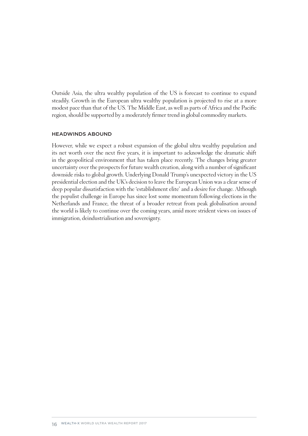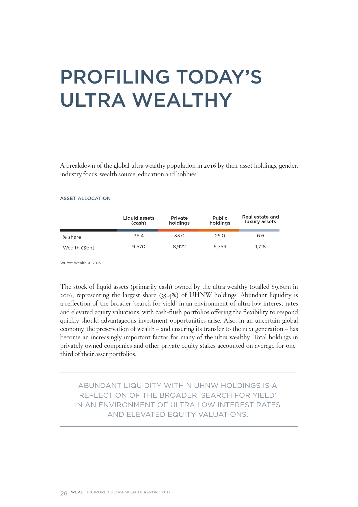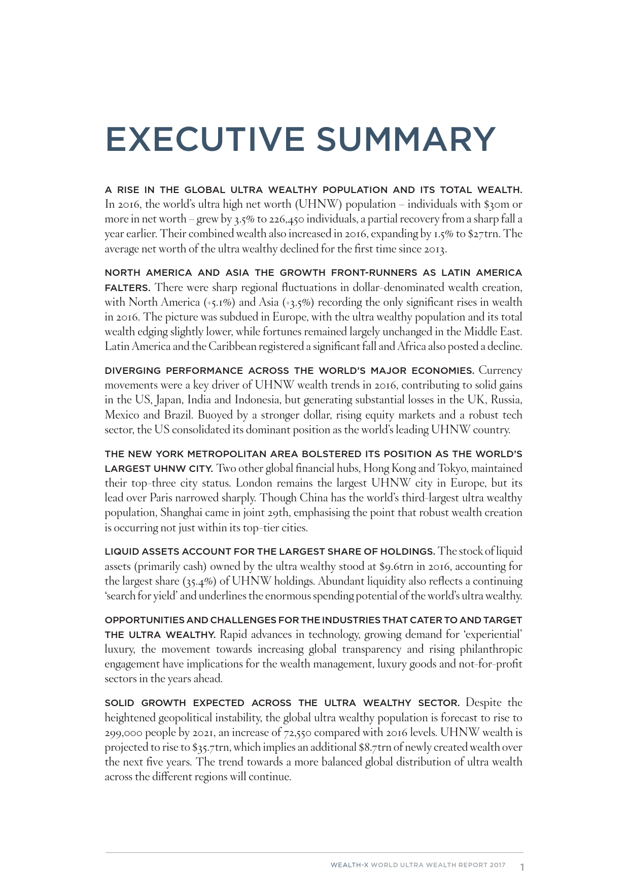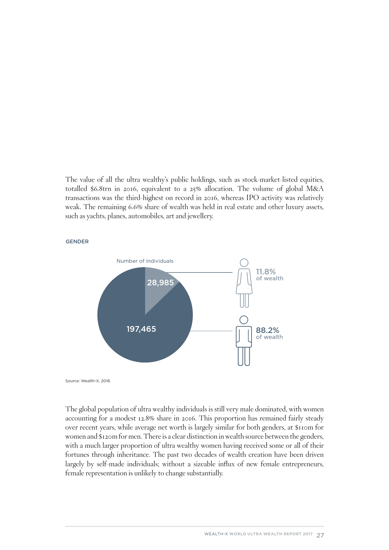 报告显示,全球超高净值人士(主要居所以外净资产超过3000万美元)数量达到226450人,较2015年增加3.5%。尽管在人数上仅占全球成年人口的0.003%,但他们的总财富达到27万亿美元,较2015年增加1.5%。
