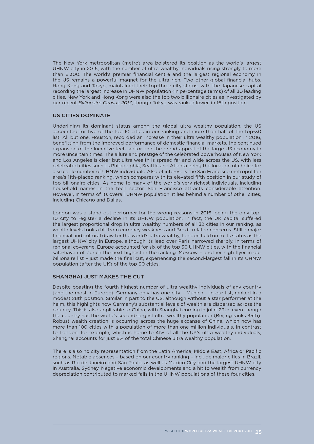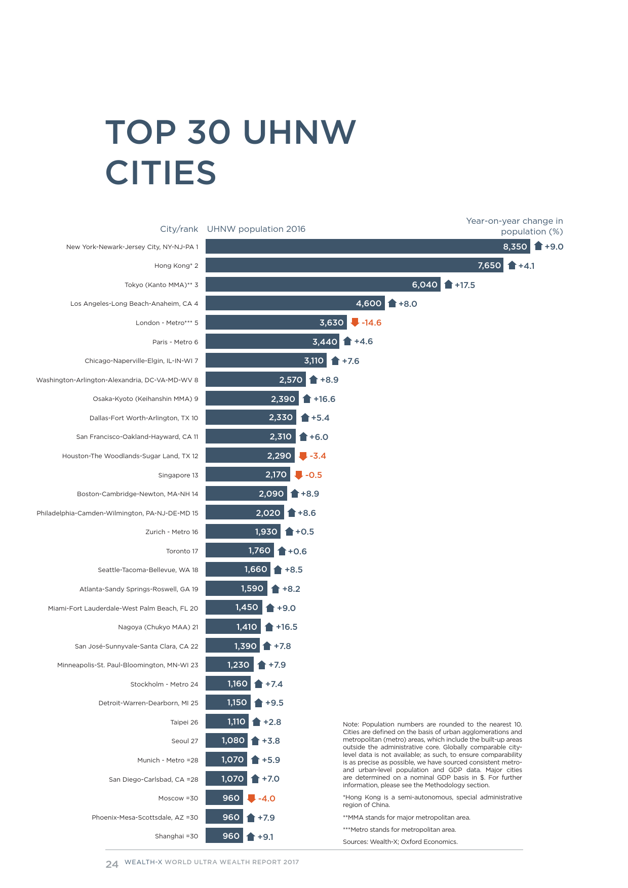 全球超级富豪人数最多的城市是纽约(8350人),第二是香港(7650人),东京排名第三(6040人)。排名第4至10的城市依次为:洛杉矶、伦敦、巴黎、芝加哥、华盛顿特区、大阪、达拉斯。