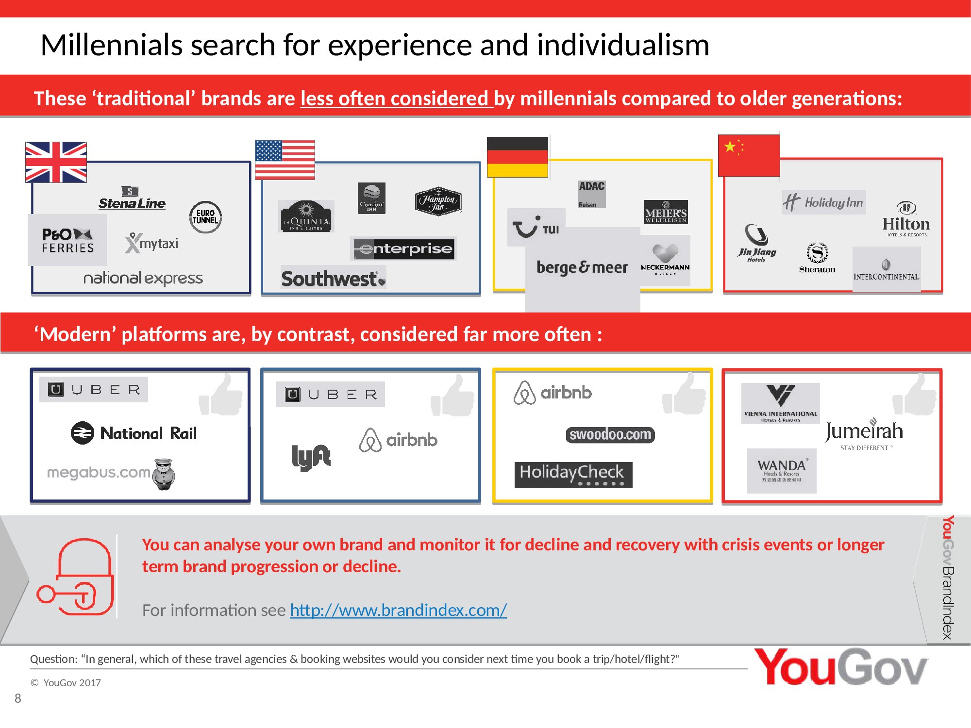 但是,调查显示旅游平台和代表没能满足千禧一代的需要。千禧一代在规划假期时,更喜欢使用Airbnb和Uber这样的平台和服务,而传统品牌则很少考虑。