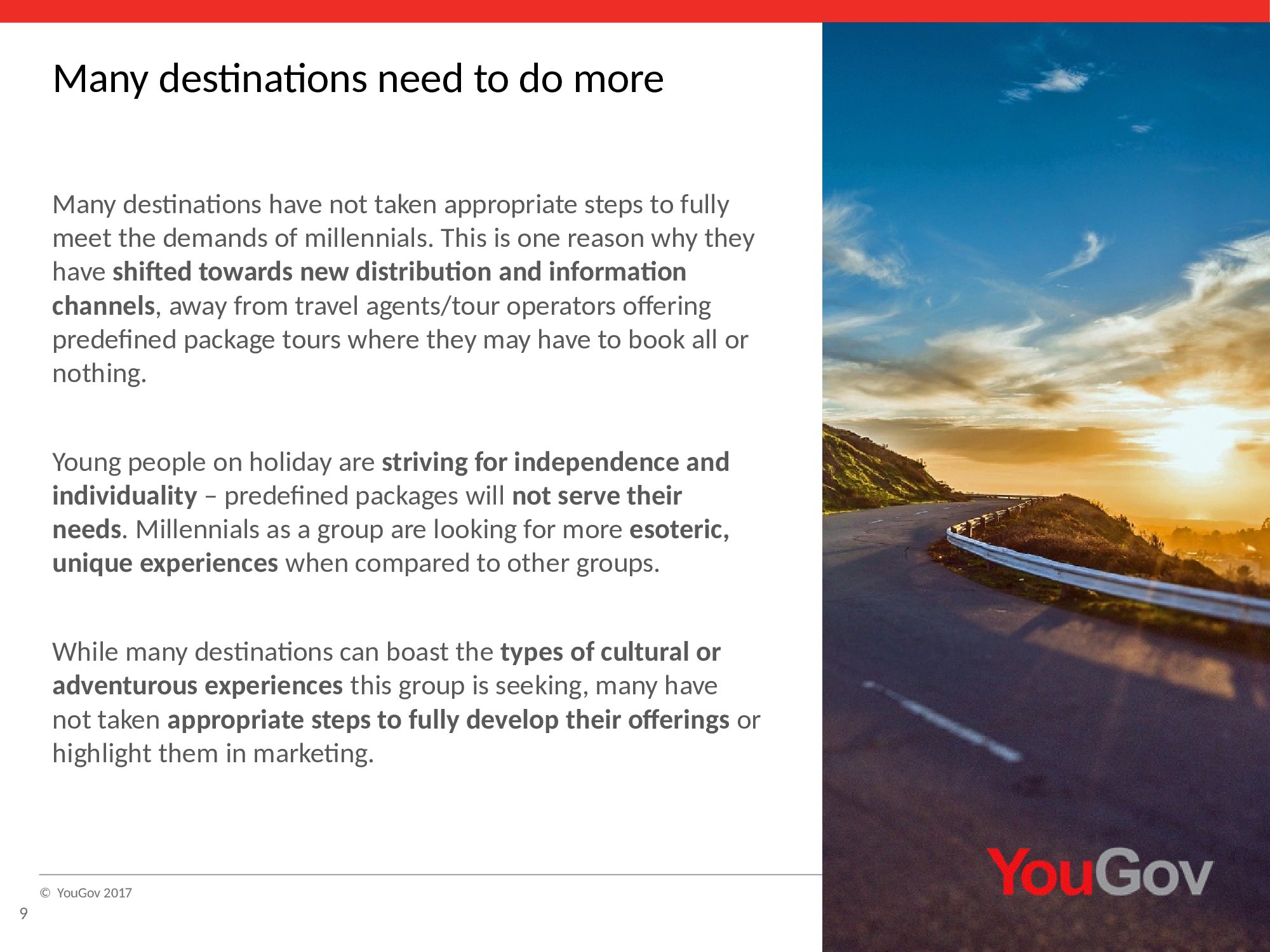 至于旅游目的地,则需要更多努力来满足千禧一代的需要。千禧一代希望寻找更深奥、更独特的体验,很多旅游景点可以为千禧一代提供更具文化特色和冒险体验。