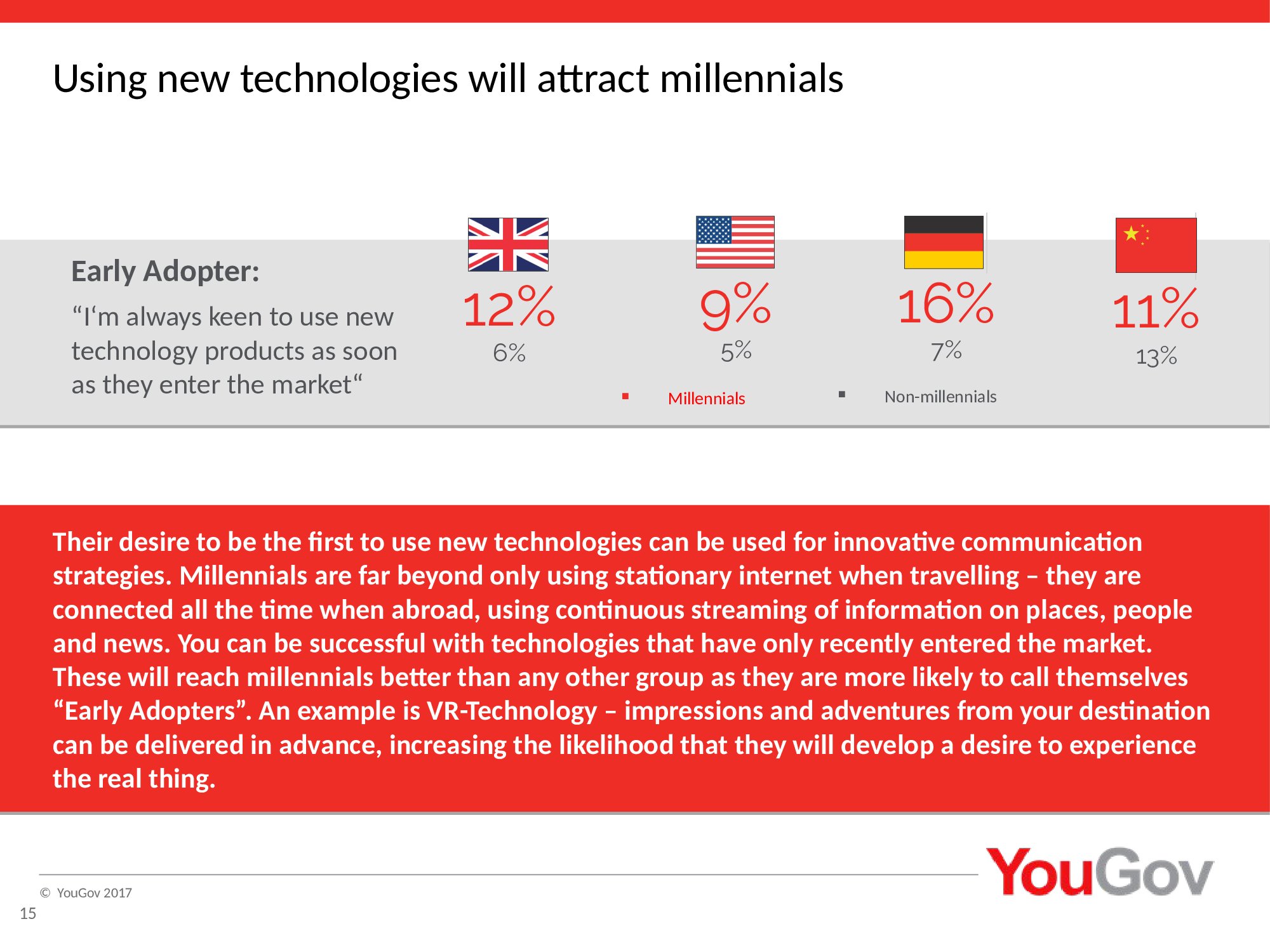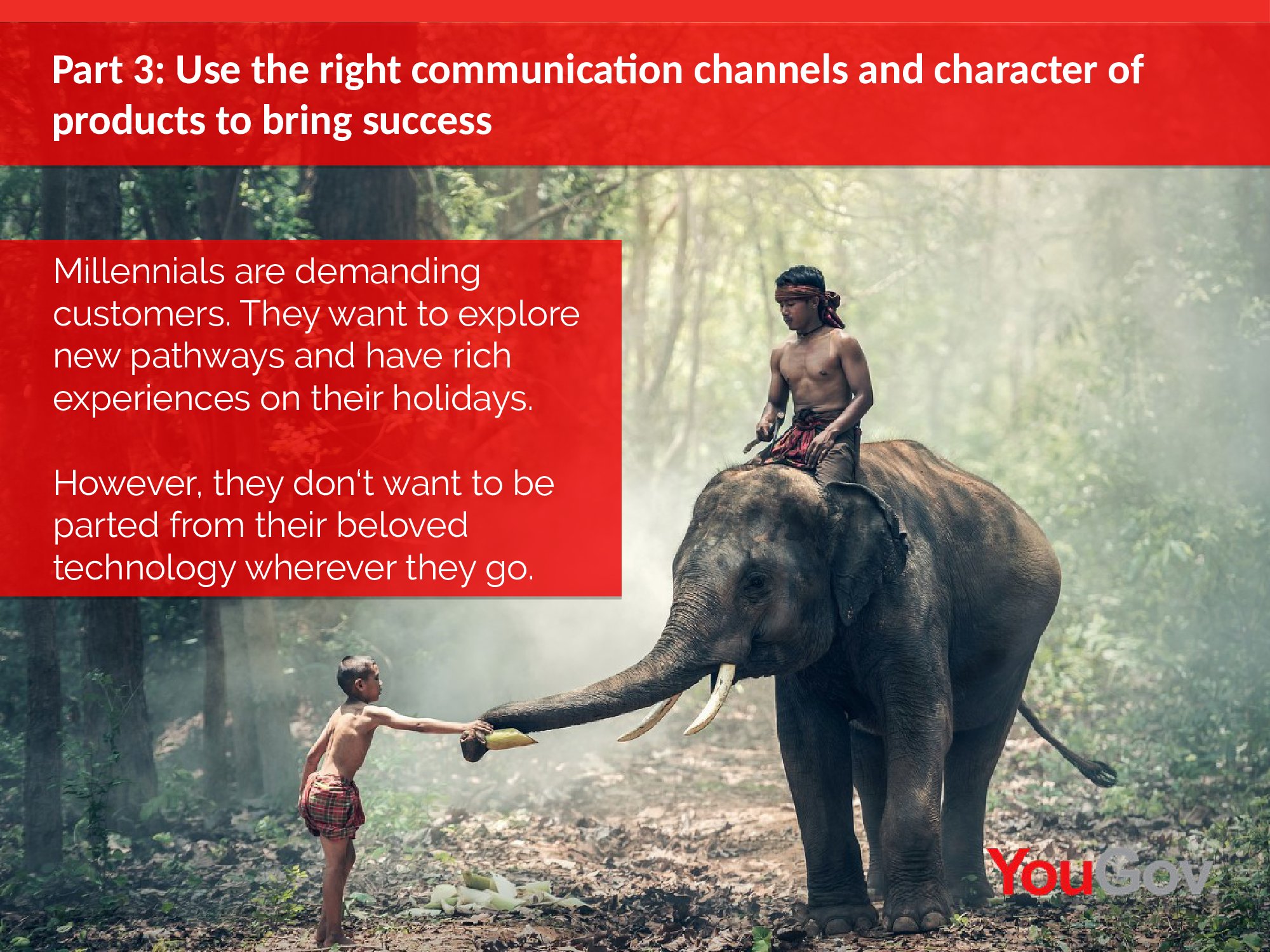 使用正确的交流渠道才能赢得千禧一代。千禧一代对旅游有着很高的要求,他们希望开发新线路,在假期获得丰富的体验。但是,他们并不希望在旅游的时候和自己钟爱的科技手段分开。