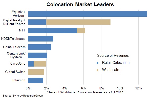 Synergy Research第一季度数据显示,Equinix和Digital Realty已经成为托管市场的领先者,收入份额分别达到11%和7%。这主要是由于Equinix完成29个Verizon数据中心收购交易,而Digital Realty和DuPont Fabros则宣布合并。其次是NTT(6%)和KDDI / Telehouse(3%)。还有一些运营商占2%的市场份额,包括中国电信、CenturyLink、CyrusOne、Global Switch 和Interxion。