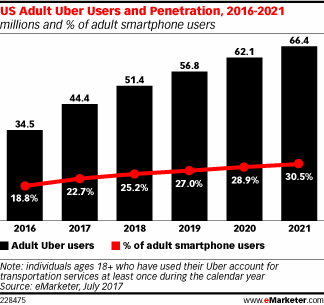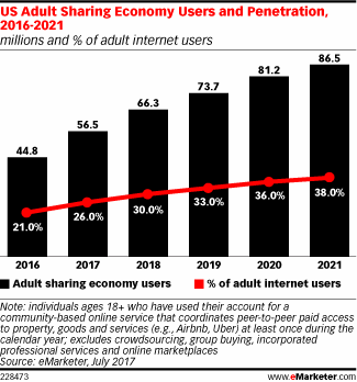 信任仍然是共享经济发展的最大障碍之一,特别是在提供服务方面。2017年4月,Maru / Matchbox调查发现,31%的美国消费者认为家庭共享平台(如Airbnb)不安全,还有28%的消费者对共享汽车服务持相同观点。、但是,随着消费者对共享经济越来越熟悉,用户数量将迅速上升。 Airbnb和Uber将是增长的最大动力。