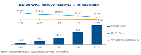 根据《中国景区民宿市场研究报告2017》内容显示,2016年在线旅游非标准住宿市场规模为89.4亿元,占在线住宿市场规模的比例为7.1%,预计2017年在线旅游非标准住宿市场规模将达140.0亿元,占在线住宿市场规模比例将达9.5%。