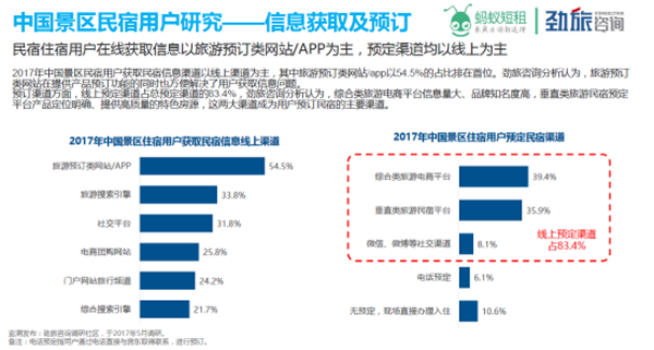 在预订方式上,2017年中国景区民宿用户获取民宿信息渠道以线上渠道为主,其中旅游预订类网站/app以54.5%的占比排在首位;预订渠道方面,线上预定渠道占总预定渠道的83.4%,其中,信息量大、品牌知名度高的综合类旅游电商平台,产品定位明确、提供高质量的特色房源的垂直类旅游民宿预定平台是用户预订宿的两大主要渠道。