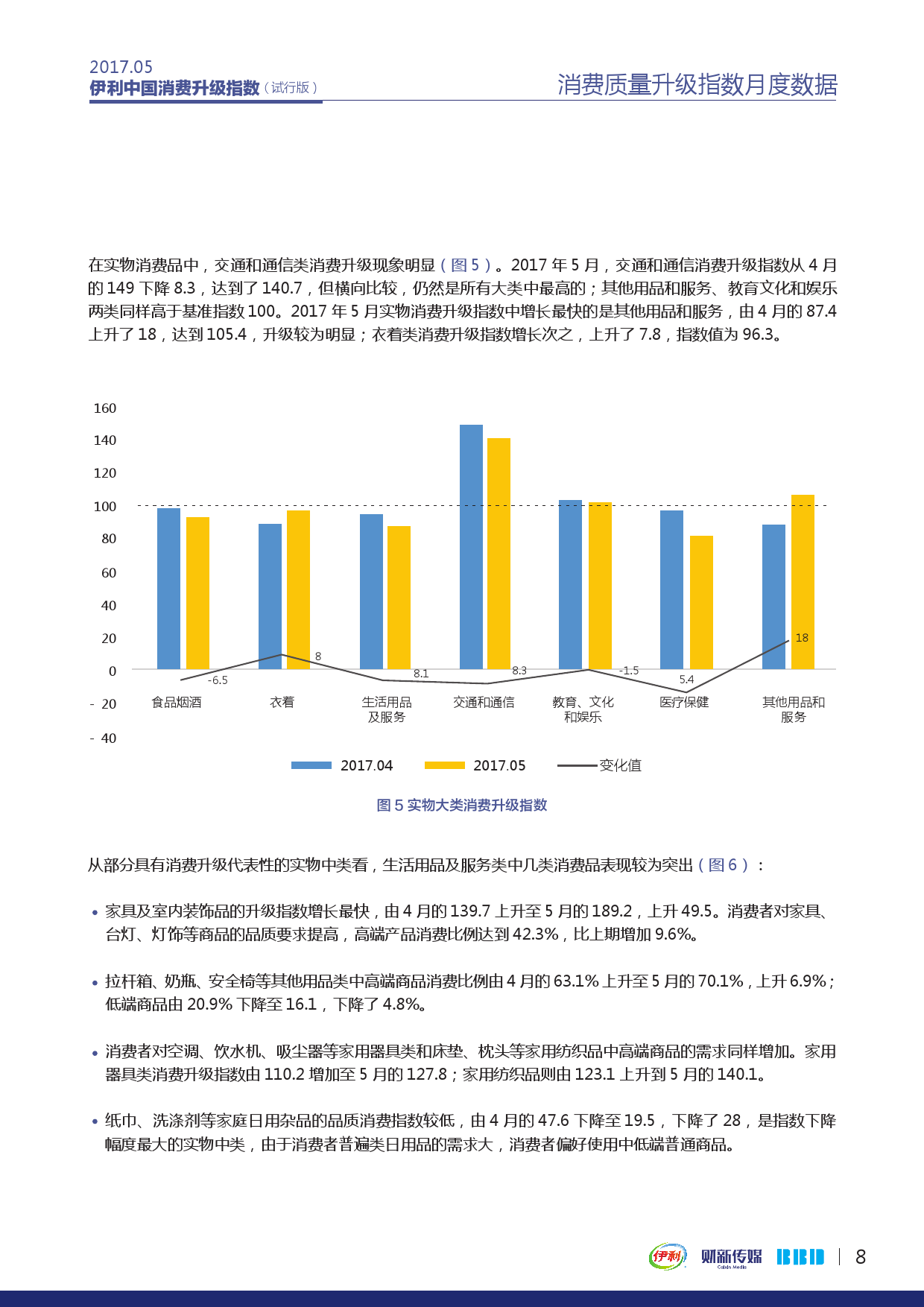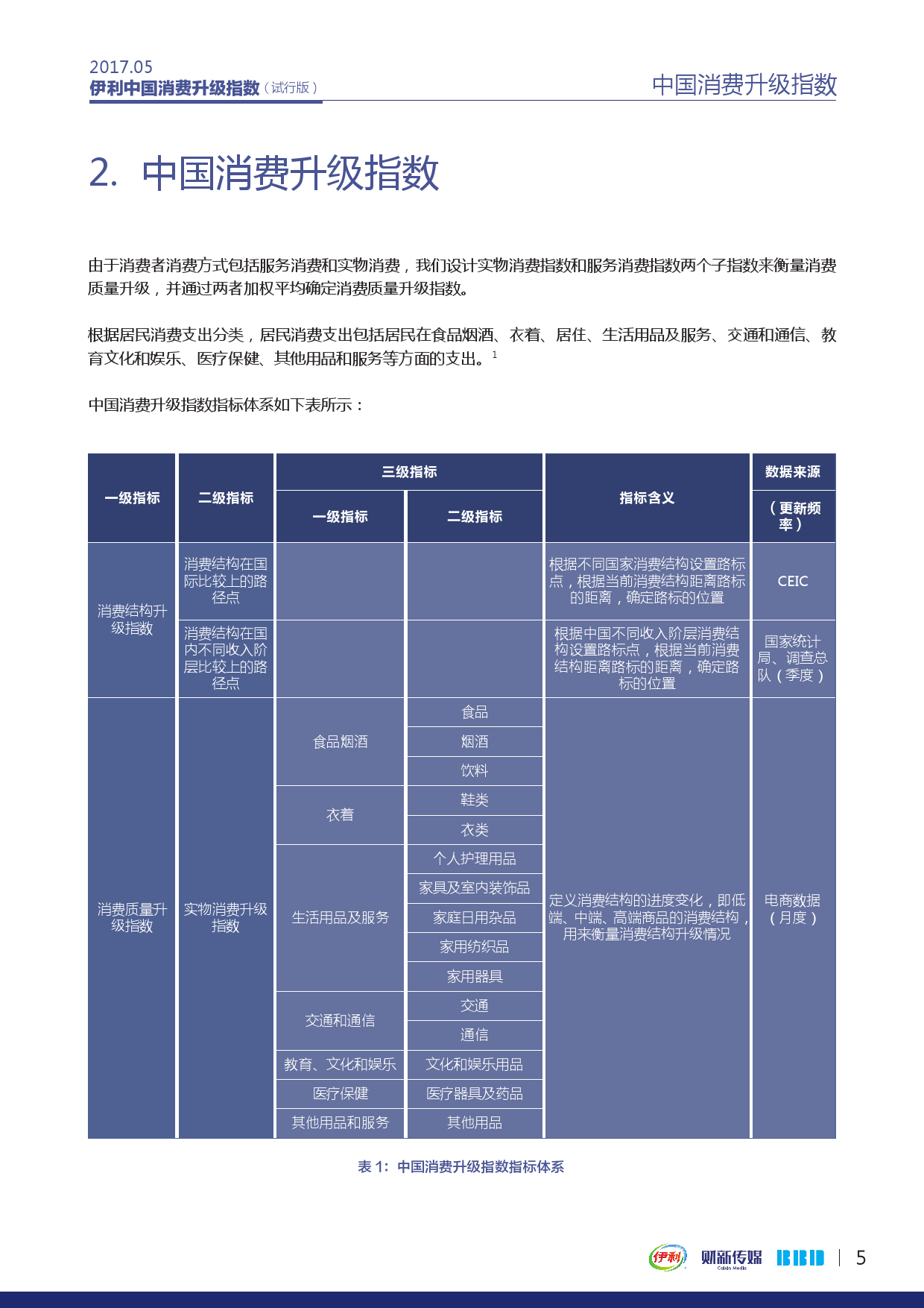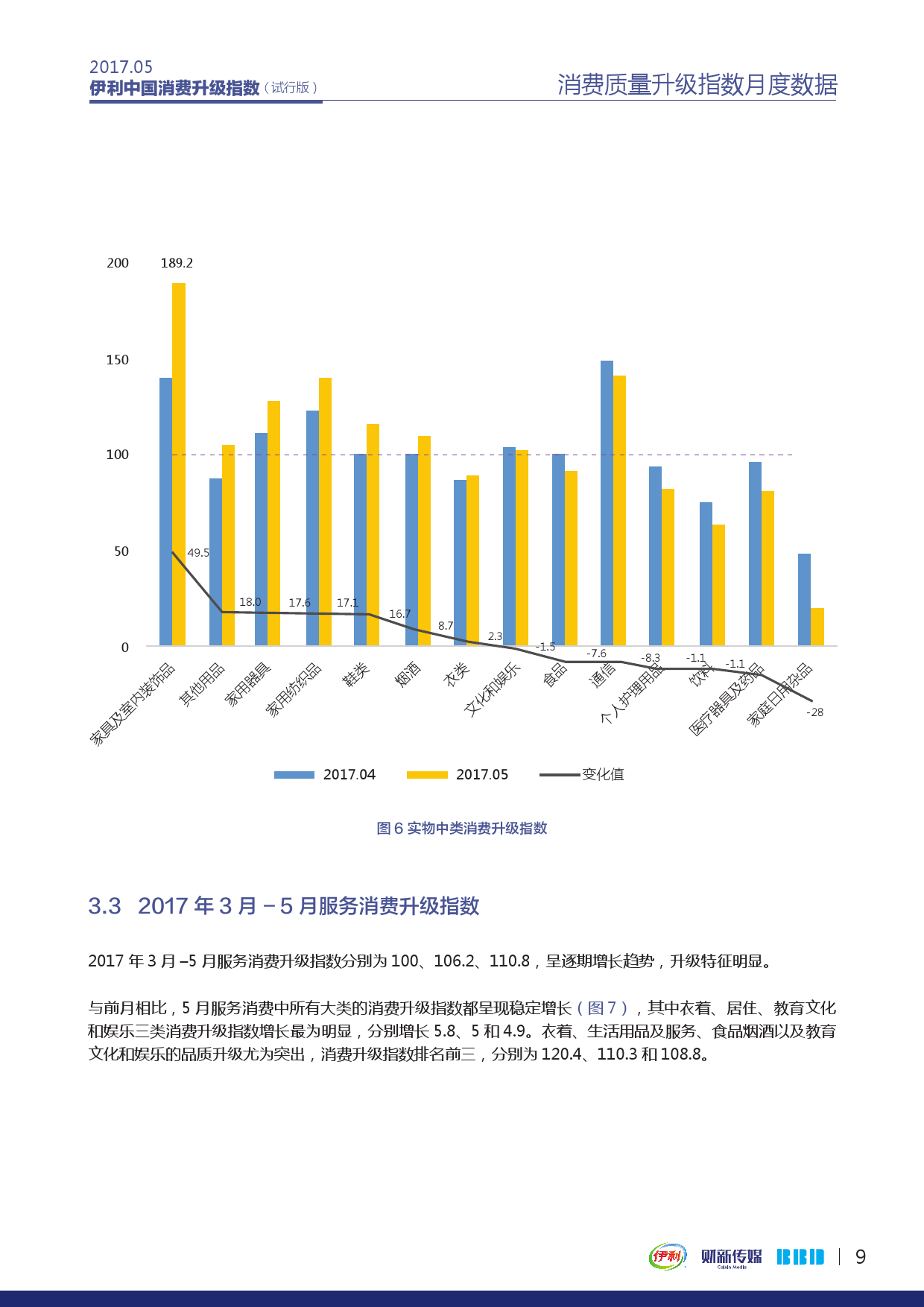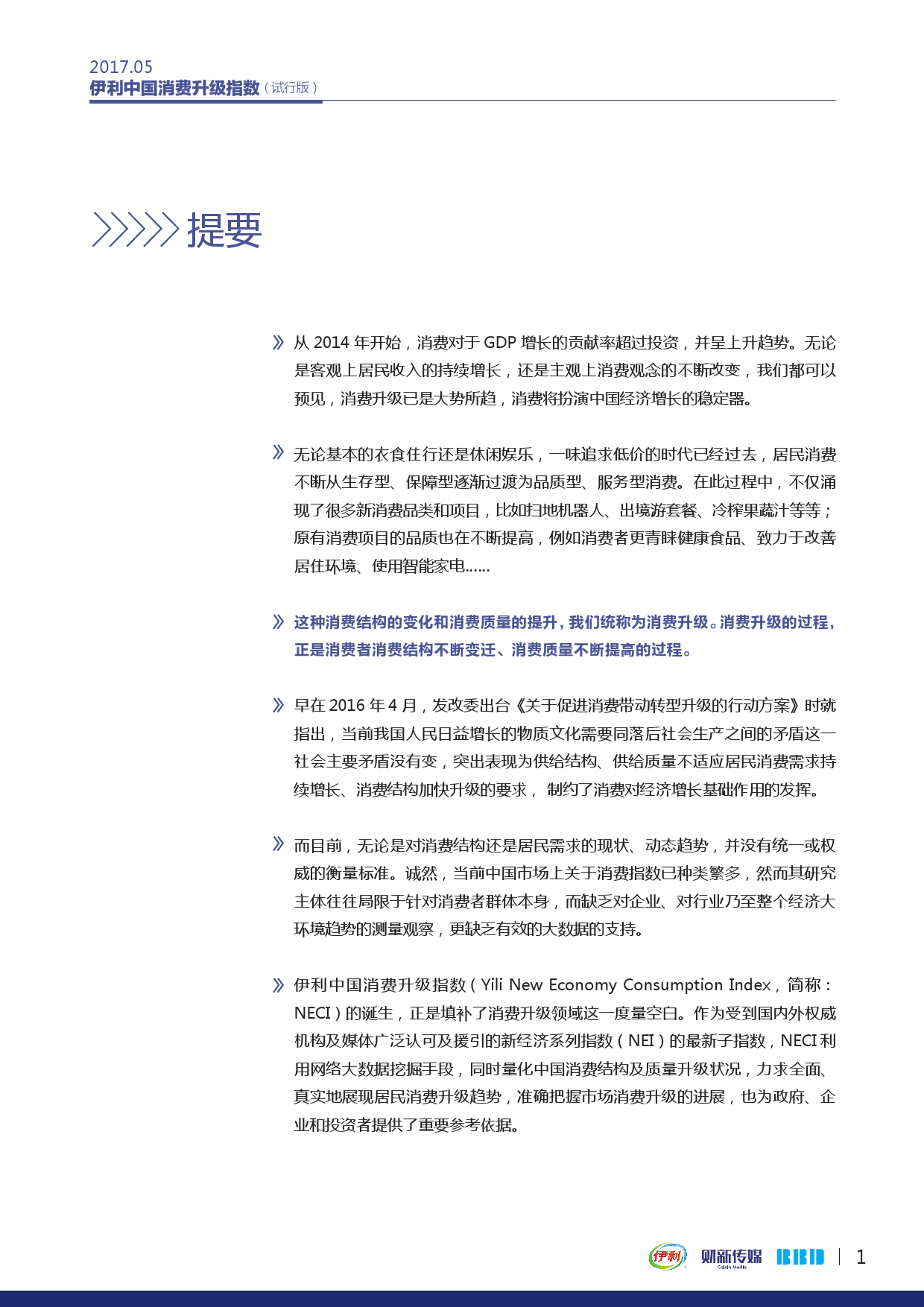 由财新传媒和数联铭品(BBD)合作研发、伊利集团冠名的伊利中国消费升级指数(Yili New Economy Consumption Index,简称NECI)发布试行版报告,并公布2017年3月-5月数据。
