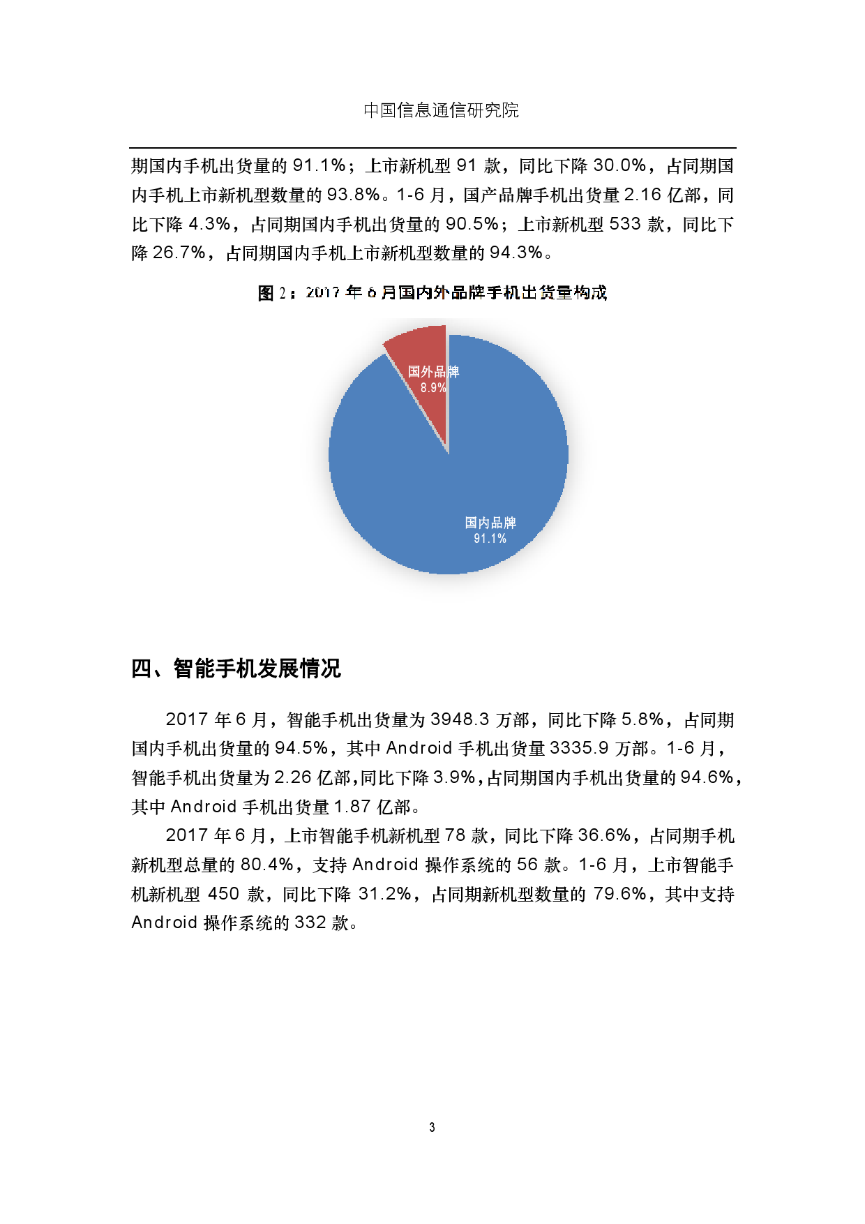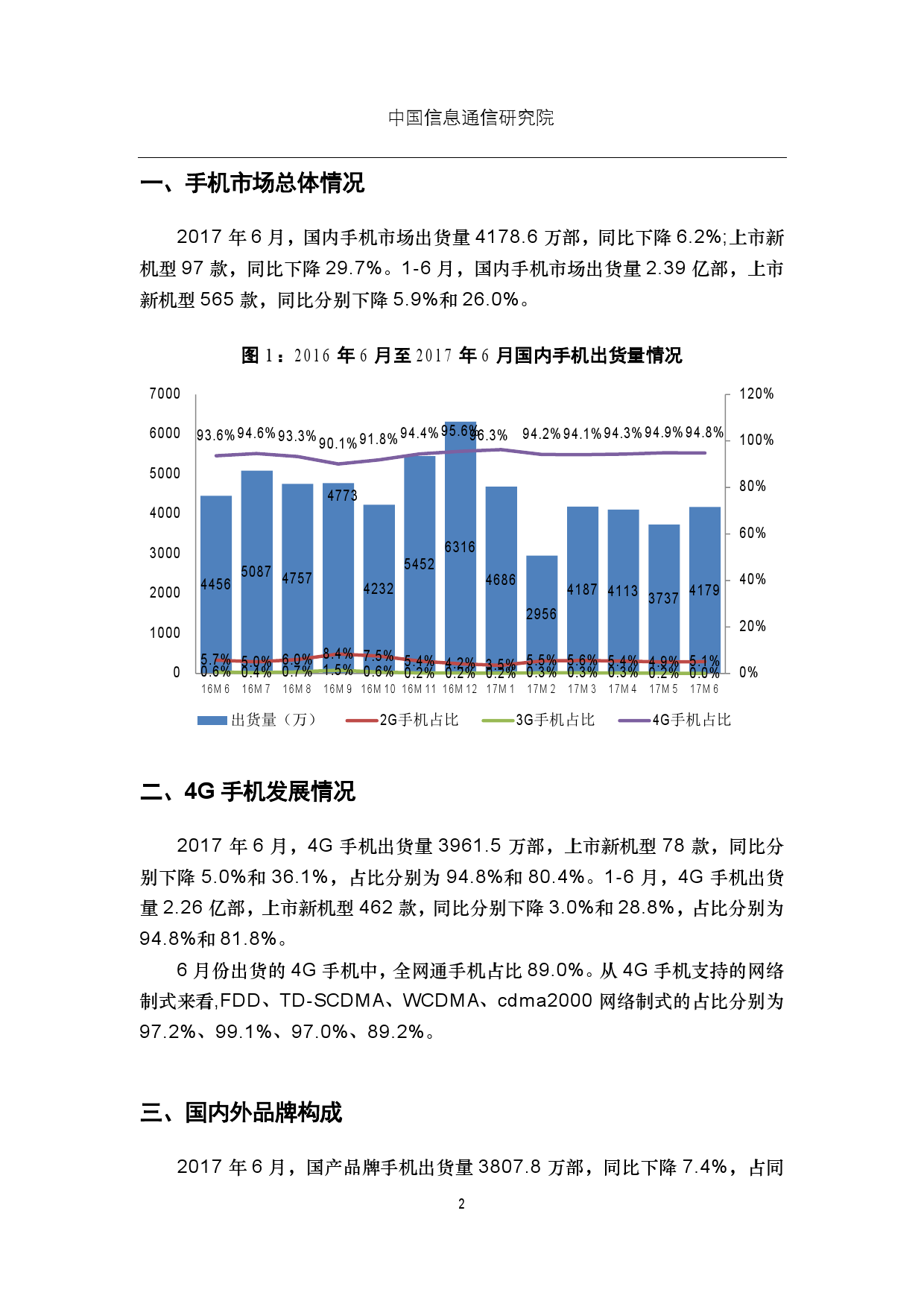 中国信通院:2017年6月国内手机市场运行分析报告 2017年6月,国内手机市场出货量4178.6万部,同比下降6.2%;上市新机型97款,同比下降29.7%。1-6月,国内手机市场出货量2.39亿部,上市新机型565款,同比分别下降5.9%和26.0%。 更多阅读:中国信通院:2020年8月国内手机市场运行分析报告中国信通院:2019年8月国内手机市场运行分析报告中国信通院:2025年8月国内手机市场运行分析报告信通院:2017年2月国内手机市场运行分析报告CAICT:2016年12月国内手机市场运行分析报告中国信通院:2021年2月中国手机市场总体情况中国信通院:2024年5月国内手机市场运行分析报告中国信通院:2024年2月国内手机市场运行分析报告中国信通院:2024年3月国内手机市场运行分析报告中国信通院:2023年7月中国手机市场运行分析报告中国信通院:2023年10月国内手机市场运行分析中国信通院:2022年11月国内手机市场运行分析中国信通院:2023年6月国内手机市场运行分析中国信通院:2024年9月国内市场手机出货量2537.1万部 同比下降23.8%中国信通院:2025年2月国内手机市场运行分析报告