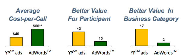 上图是来自Altman Vilandrie & Company的一份研究报告,对比了在线黄页广告和Google AdWords在Cost-per-Call上的推广成本和效果的对比。在Cost-per-Call(平均呼叫成本)方面,在线黄页广告为46美元,Google AdWords为88美元。同时上图也对比了对于广告点击者(Participant)以及行业(Business)价值对比,两个方面在线黄页广告均领先Google AdWords较多。